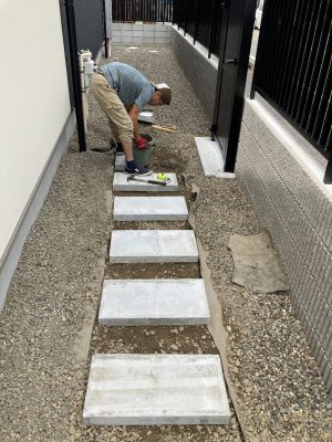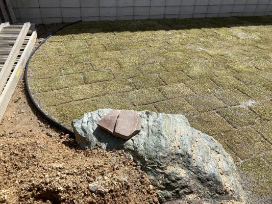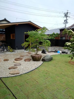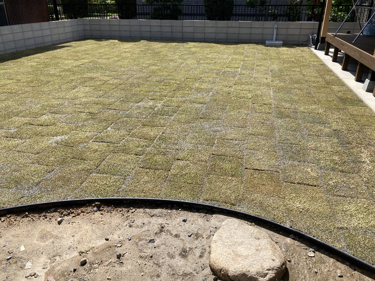 n冶さんは、追加で裏口への通路に平板を敷く事になり、敷きならべていっています。今は関市の工事が一段落つき、今度からまた岐阜市の工事にとりかかるそうです。庭の木陰もいい感じ。伸びにくい芝生も目地が分かりにくくなりました👍お母様も運動をしなくてはいかんと、芝生の上を今日から一日1週ずつ増やしていこうと歩いてみえました。コンクリートやアスファルトみたいに暑くないですし、転んでも痛くないのでいいですね。