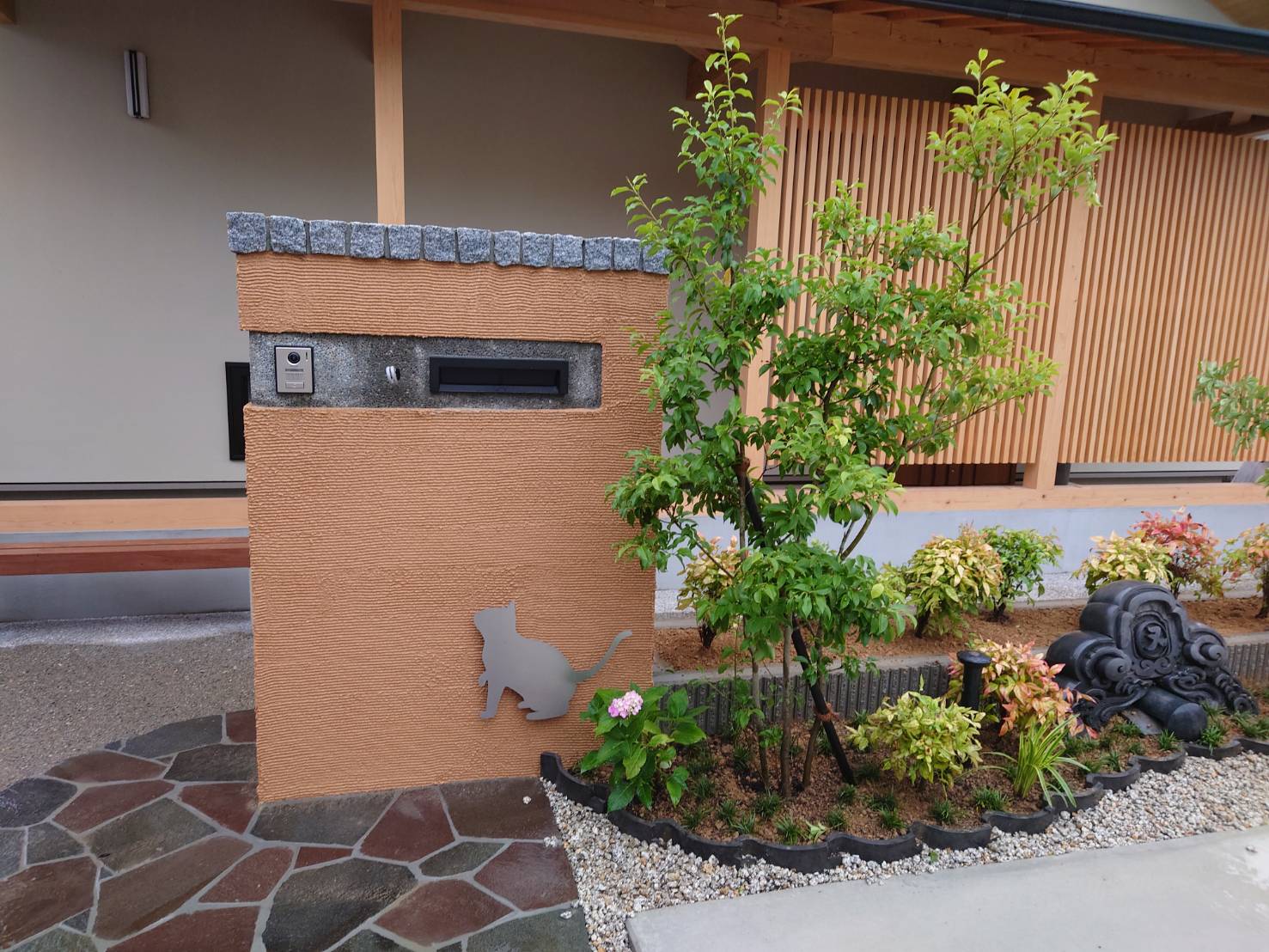表札の文字が間違っていたので表札が未だですが、ほぼ完成です👍猫ちゃんライトもカタログではホワイトかと思いきや、メタリック調でしたので、御影石と合ってよかったです💦植栽は、ソヨゴと今人気のアオダモ。生垣はやめてオタフクナンテンになりました。オタフクナンテンは紅葉するので、これまた楽しみです。