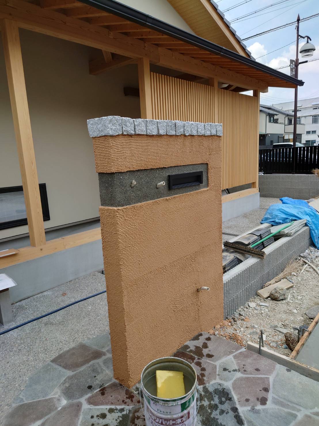 門柱は、ジョリパッド校倉仕上げが施されました。今回はパンプキン色です。ちょっと美味しいそう(笑)後は、yi様お楽しみの照明器具の取り付けと植栽が入ったら完成です。