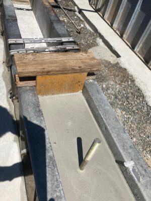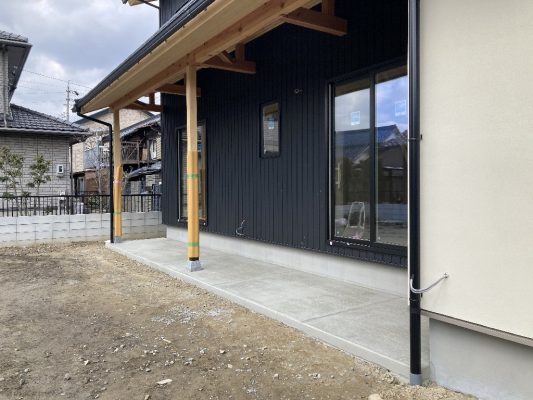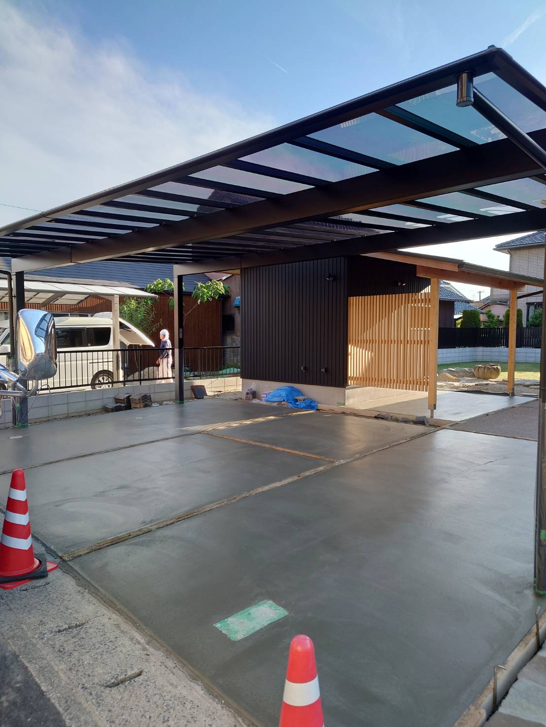 23日にカーポート下のコンクリートも打設されました。コンクリートのひび割れを軽減させるため、伸縮目地を設けます。その伸縮目地を利用して車が止めやすいように、一台分毎に入れています。
