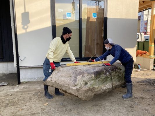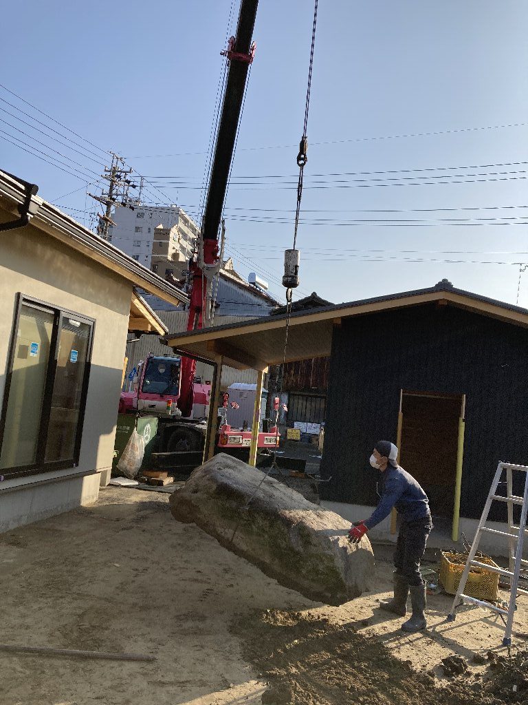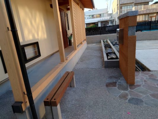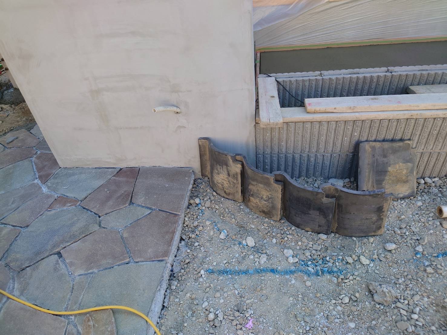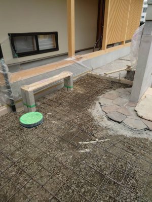 今週はお天気に恵まれて、土間打ちの工事も進んでいます。人が歩く部分は、鉄平石以外の部分を洗い出しコンクリートにしています。通常のモルタル洗い出し仕上げとは少しちがって、コンクリート下地と仕上げを一緒に行う工法です。モルタル洗い出しに比べて、1工程で仕上げるので少し安価です。約1年前の解体時に残しておいた瓦を小端立てして植栽部分の仕切りに使います👍(📷:n冶業務店のrさん)