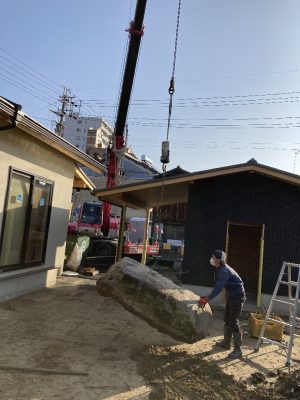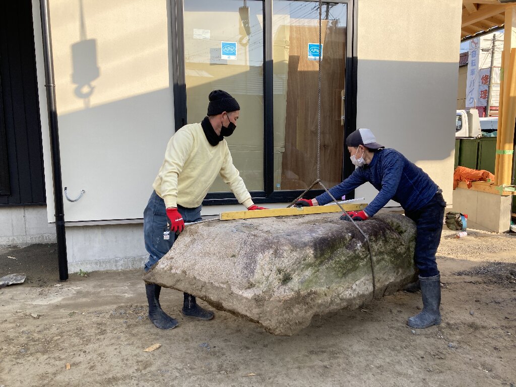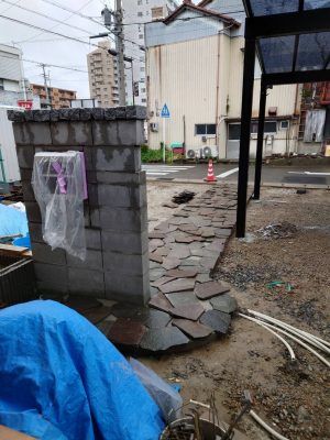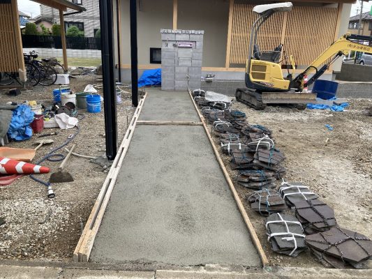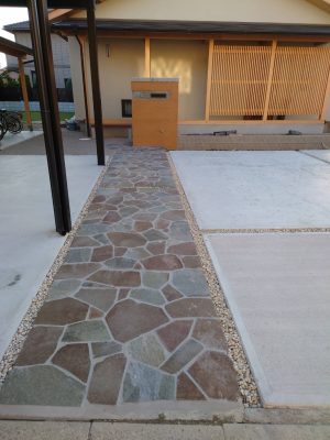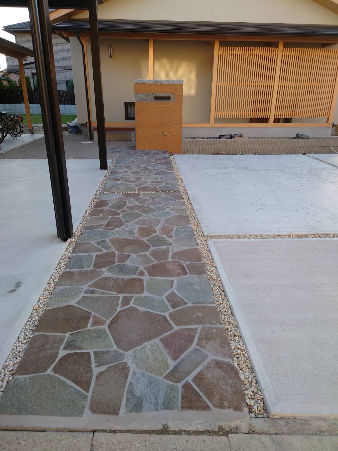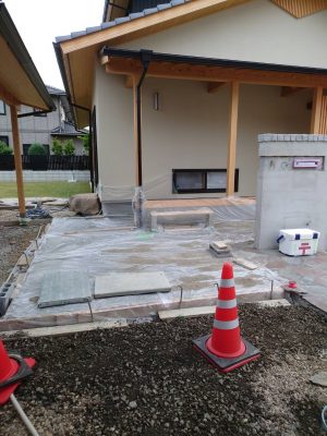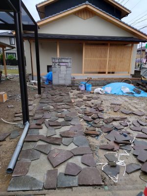 n冶業務店のyさん、雨にも負けず、アプローチの鉄平石を配置してくれていた様子です。いや~豪華です👍鉄平石は、2500万年前の火山活動によって形成されたとか。石は濡れた感じもいいんですよね~
