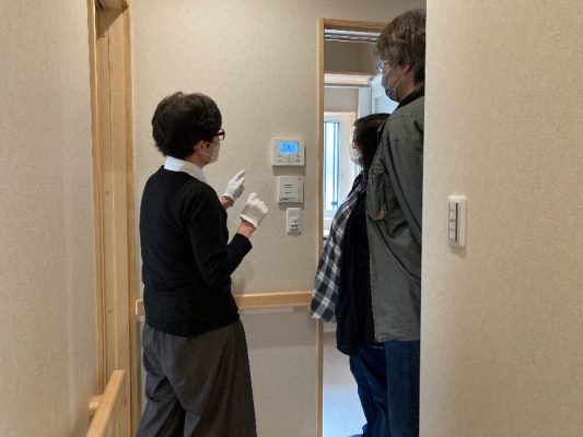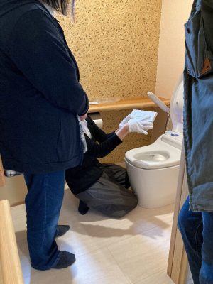 先週の土日に見学会を開催させていただき、残工事と再クリーニングを終えて、本日お引き渡しです。今回はPanasonic信者のyo様(?)(笑)。太陽光、アラウーノトイレ、浴室、熱交換器付換気扇、インターホン、照明器具のほとんどがPanasonicです。そんな訳で、特別にPanasonicの方に取り扱い説明をしに来ていただきました。1階のトイレは、手摺付きのアラウーノ。男性が立って~する時に、便座をあげると水面が下がるようになっています。そして、便器の中の泡が飛び散りを防ぎます。ご入居前に、「これから座って~するようにしてね」と奥様と強引に(?)約束を交わされる男性陣が多い中、幸せですね~👍