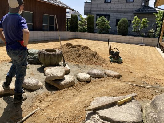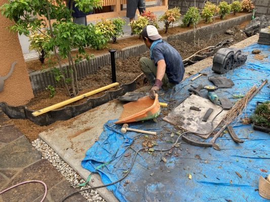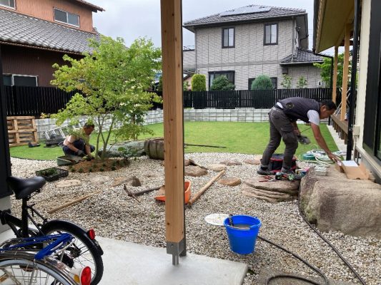 今日は小雨の降る中、植栽工事と電気工事を行いました。n冶業務店さんは、エクステリア担当yさん、植栽担当mさん。mさんは木の根元にタマリュウを植え、yさんは旧家に使われていた瓦を小端立て、h場さんは、ジョイントボックスあたりにタイマーなどを設置中の様子です。
