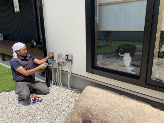 今日は、n冶業務店さんが来るとの事で、h場さんにも来てもらい、やっと表札が付きました👍明るさセンサーが未だに欠品中との事で、外部の照明は一部室内から入り切りしていただかなくてはいけません💦半導体の欠品は未だに続いている状況です。h場さんを見つけて、またヤマト君がやってきました。h場さんの作業が気になるみたいです。