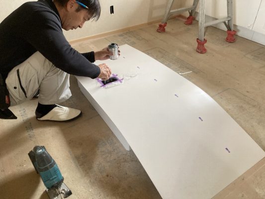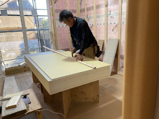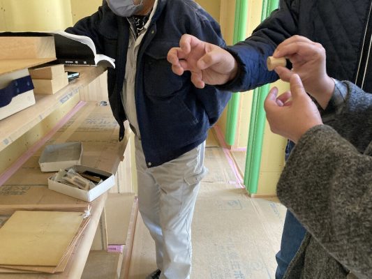 今日は、f井建具さんと製作建具の打合せをしました。着工前に、あ~でもないこ~でもないとyo様と何度か打ち合わせをし、おおよそ決まっていましたが、デザインのチェックや把手などの使い勝手は計画通りでOKかなど、実際に見ながら最終確認を行いました。写真は、トイレ収納の把手はあまり目立たないように堀込把手で計画していたのを、会長におねだりして出してもらった耳付きカウンターの形状によって堀込把手は使いにくい事が判明し、つまみに変更している様子です。