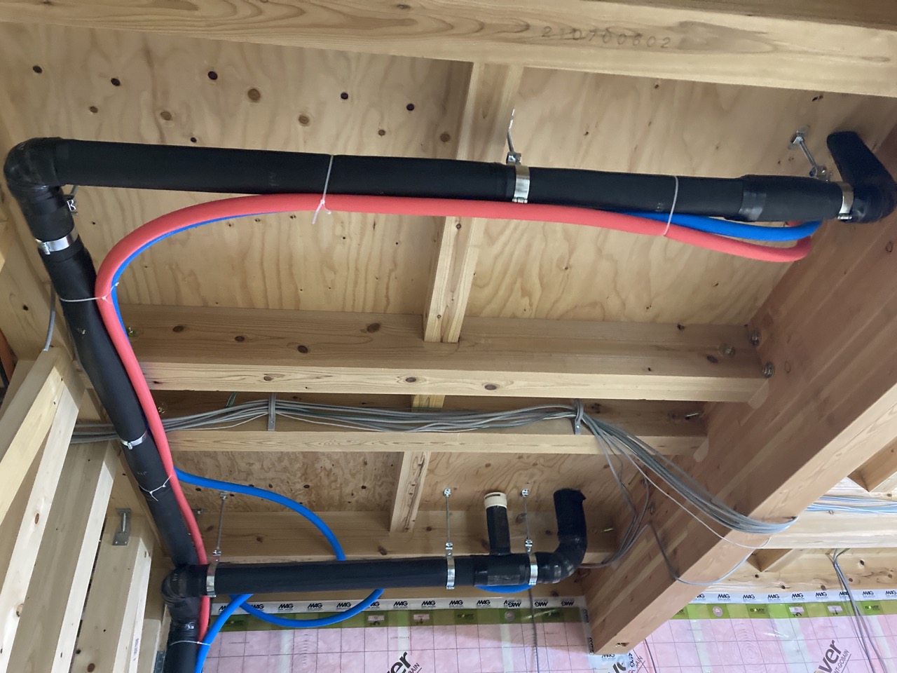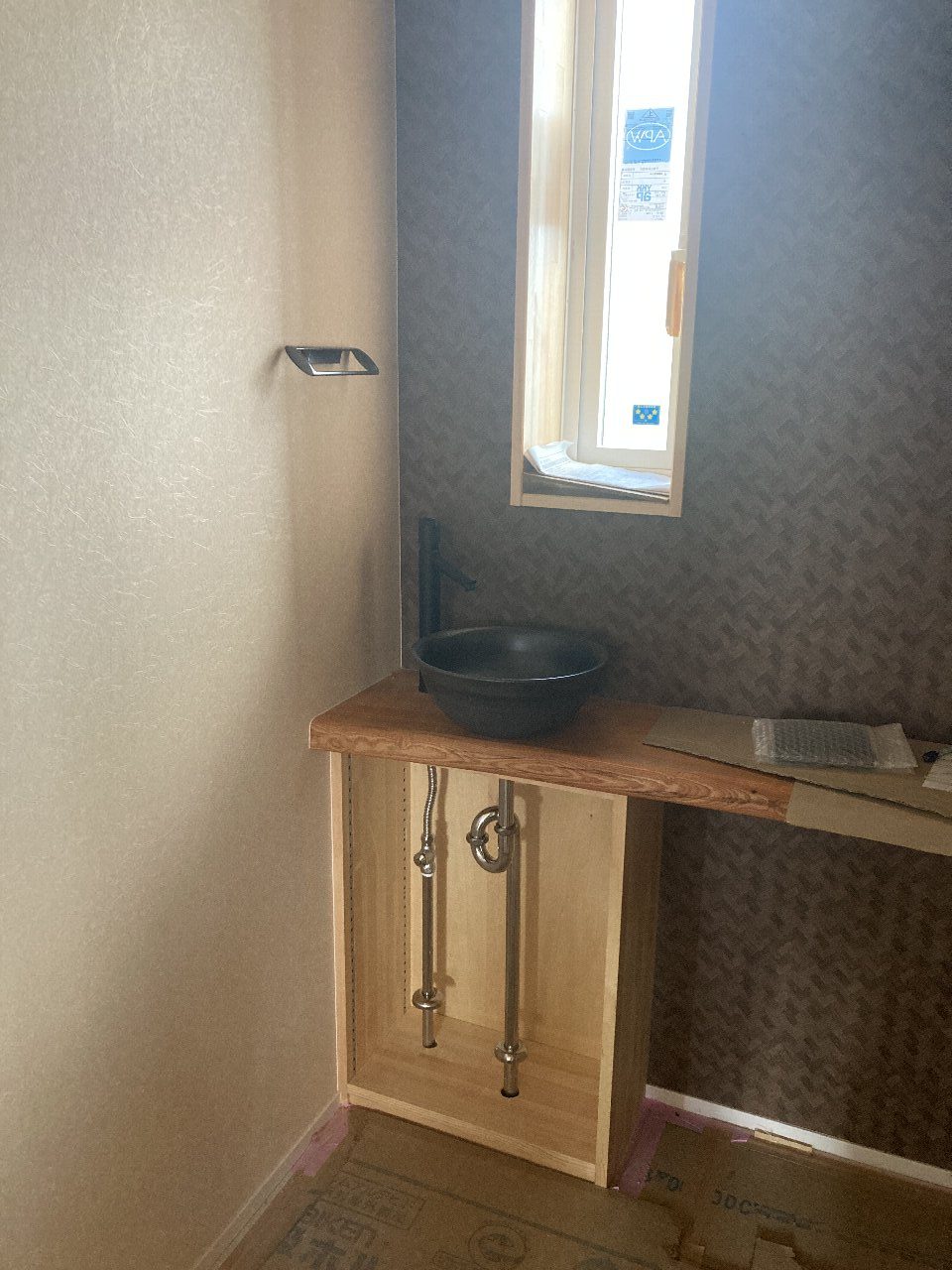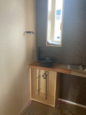 内部はイケメン集団t井設備のy竹さんが、お休み返上で設備配管の接続に来ています。昨日から来ていてトイレの手洗いボールや便器なども取付けられました。