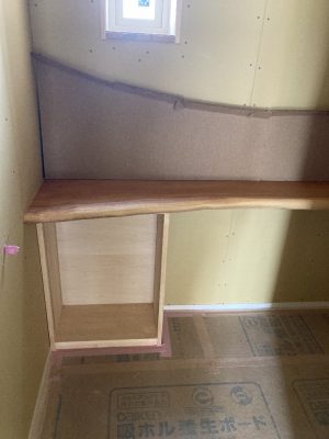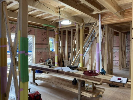 昨日、棚の打合せを現地で行いました。まだ構造材が見えている状態での打合せで少しピンとこないかも知れませんが、サッシも納まっていて窓などの取り合い部分はやはり現地の方が解かりやすいです。