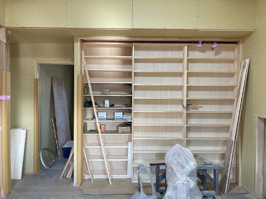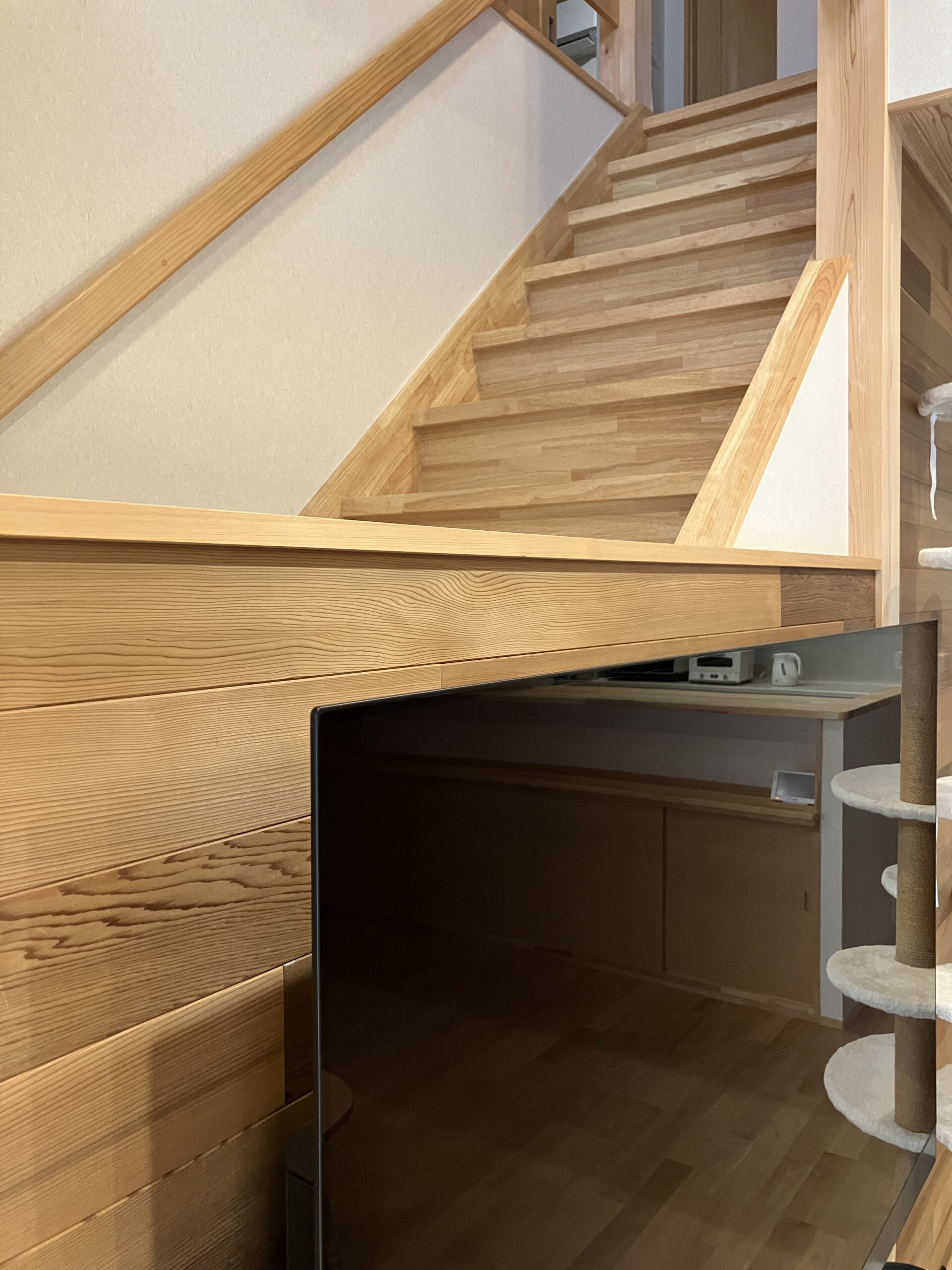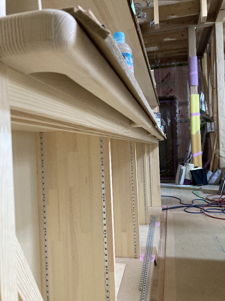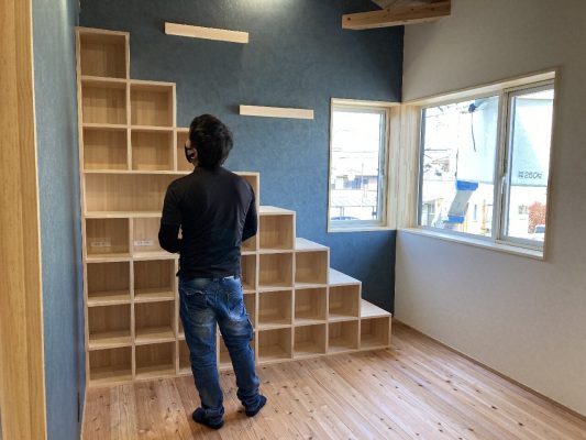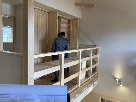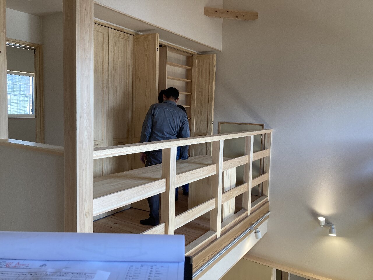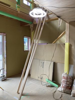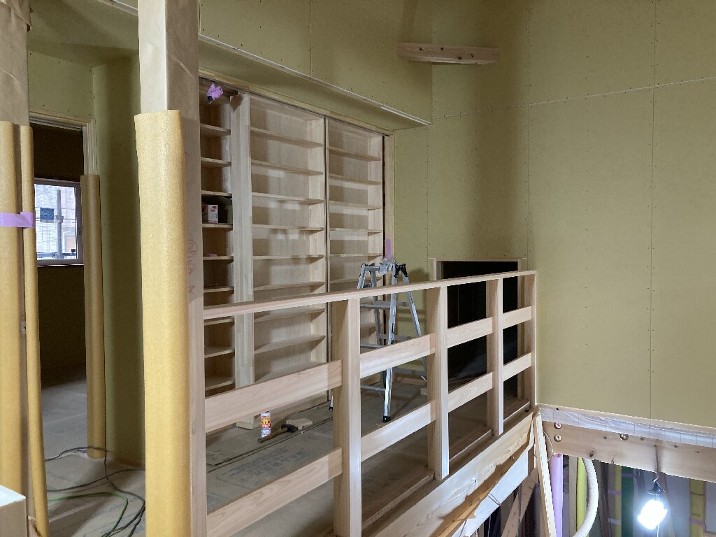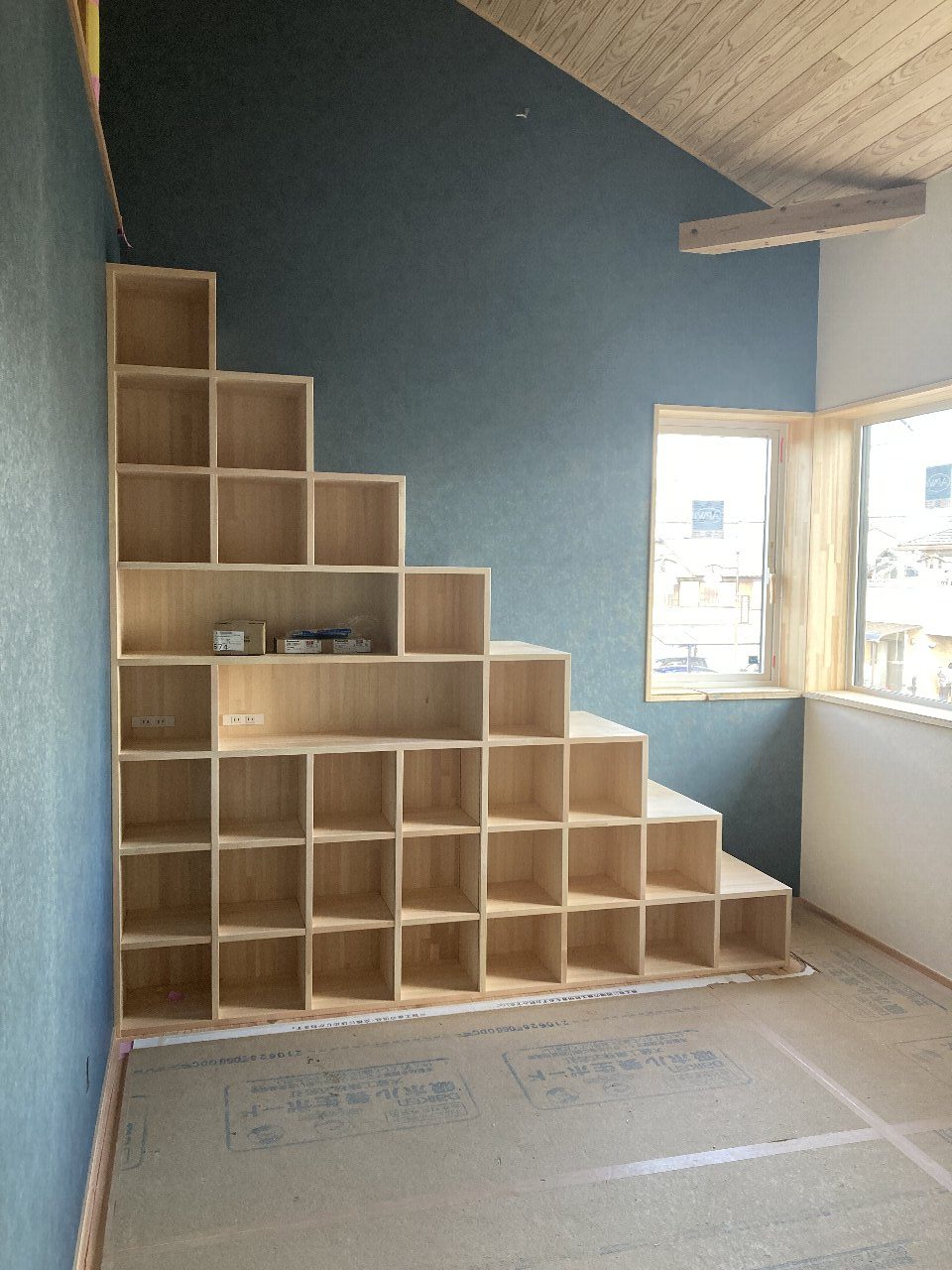 昨日は、f井電気のh場さんが、現場から実況中継の様に電話をしてきてくれました。「y幸棟梁が息子さんのロフト階段を造りに来ているよ~すごいね。」とか「照明計画したダウンライトの位置を再度確認してみて~」とか「コンセント本当にここでいいの?」とか、事務所に居ながら現場に居るような感じでした(笑)有難いです。今日は、ワクワクして2階に行くと、Nゲージの飾り棚兼、本箱兼、ロフト階段が出来上がっていました👍おばさんは、Nゲージってなんなん?と今回初めて知りました・・・
