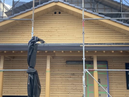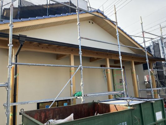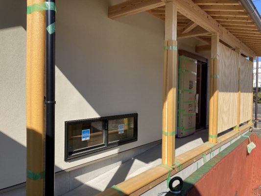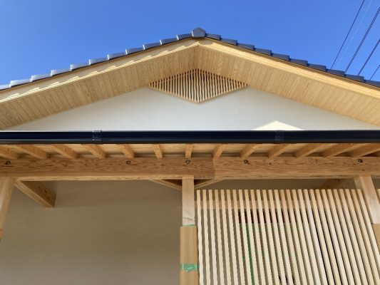 玄関の庇も取り付けられています。本格的な和風ではないので小舞までは付いていませんが、垂木現しの軒裏にしています👍あら?この穴はいったいなんでしょう~