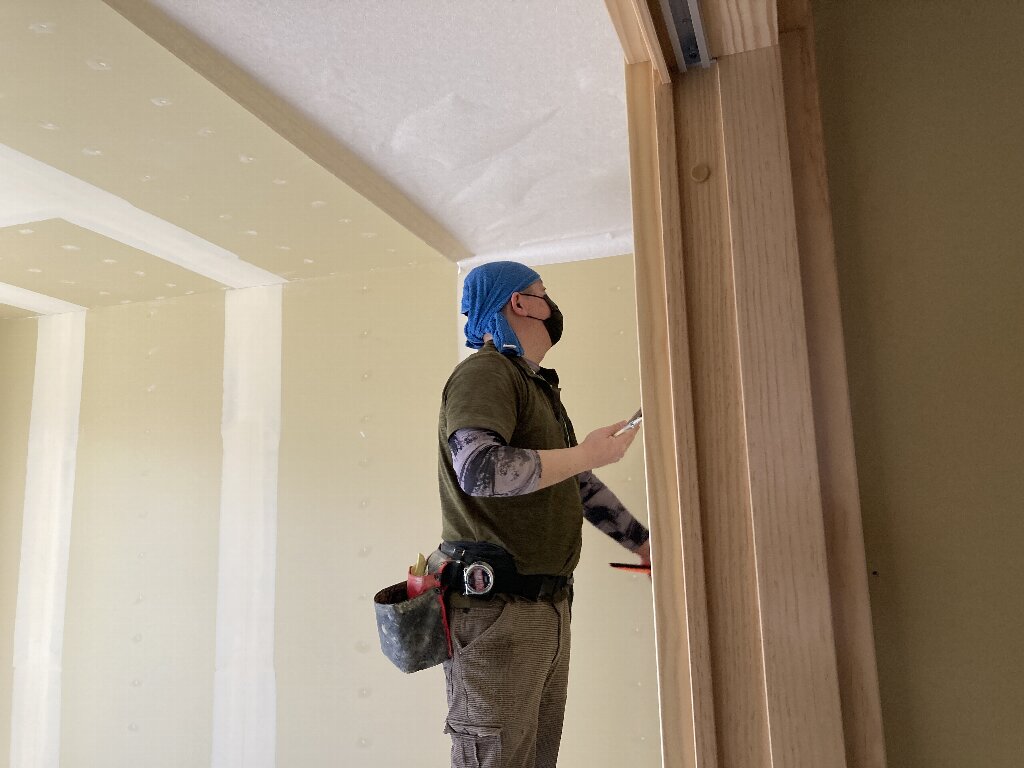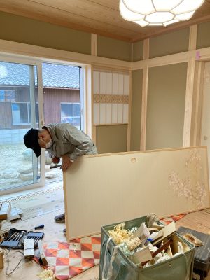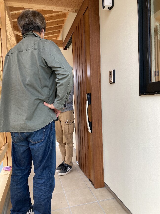 外部はy口技建さんが、玄関及びポーチのタイル貼り、スロープのモルタル刷毛引き仕上げにきてくれました。室内では、f井建具さんが親子で建具を納めに来てくれています。