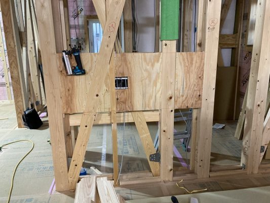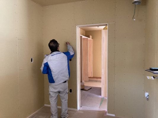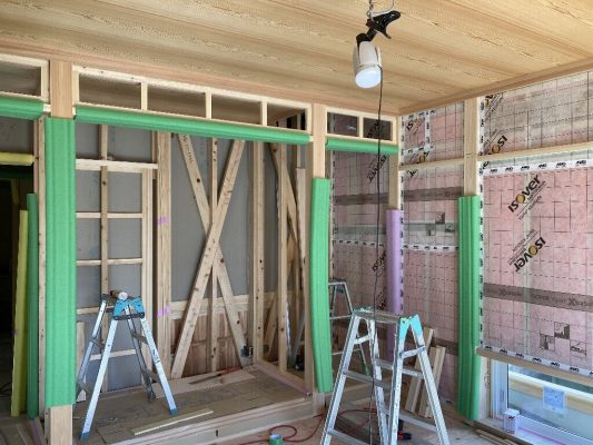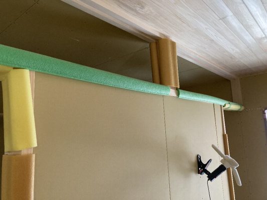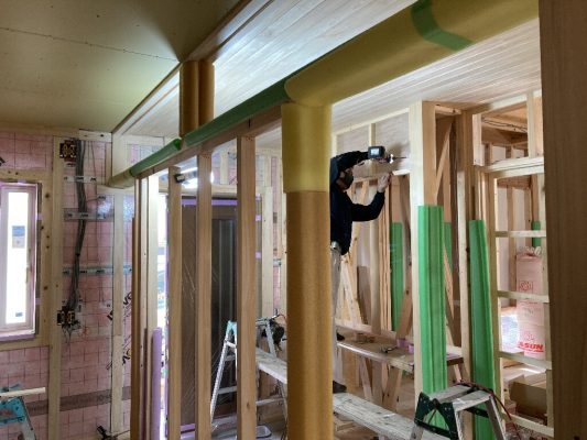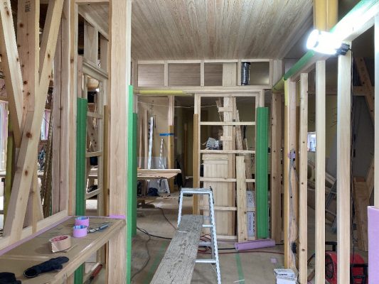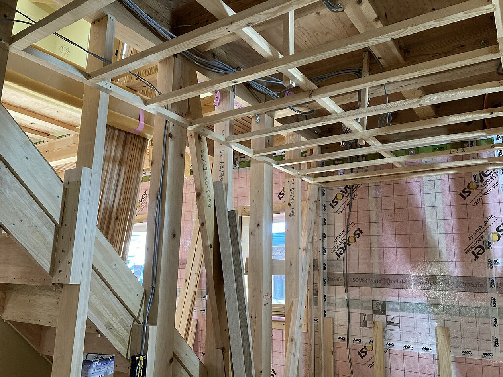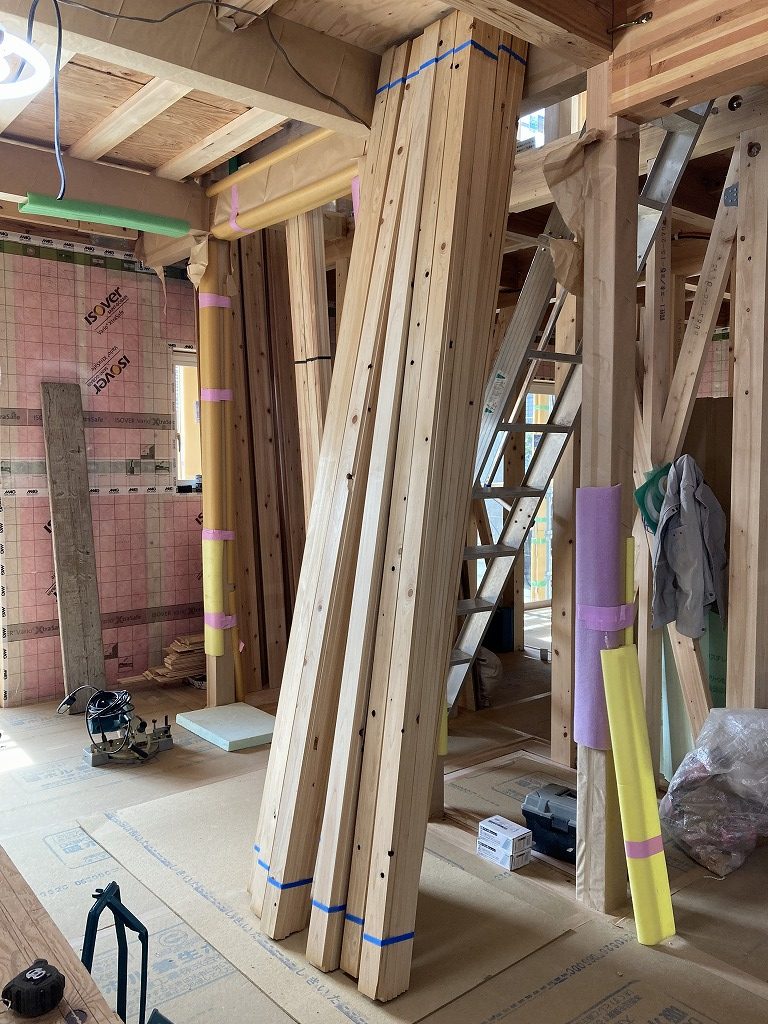 貫は、外周部の内壁側に胴縁の代わりに使っています。胴縁に比べて幅の広い貫を縦に張る事で、プラスターボードを縦に張る際のジョイント幅をかせぐ事ができます。調湿気密シートを押さえつつ、貫の厚み分の空間もできるのでそこに配線を納める事ができるのです👍(s水所長より)
