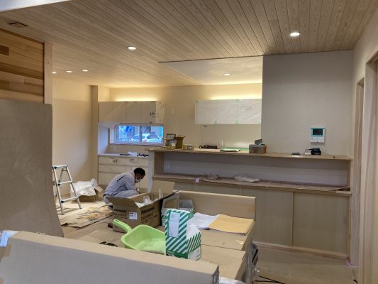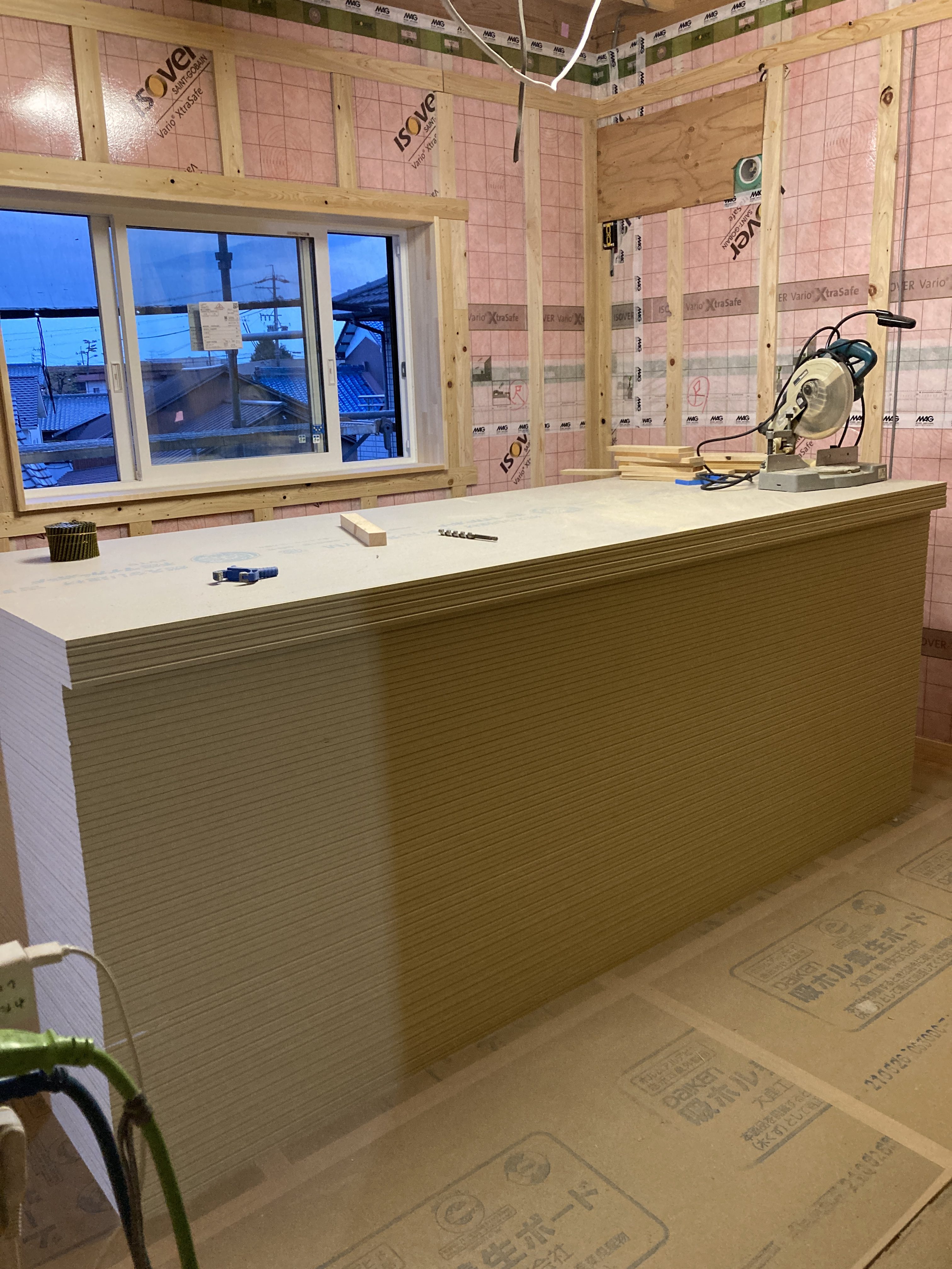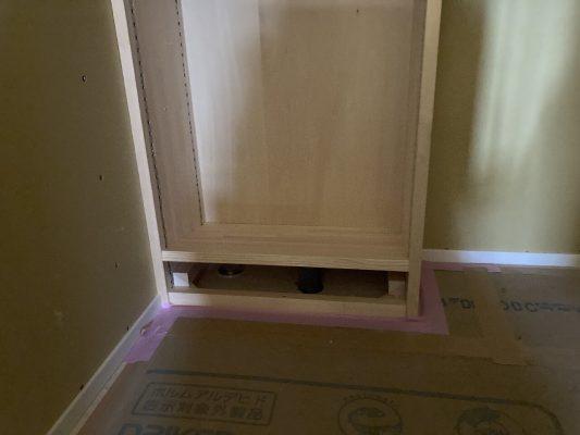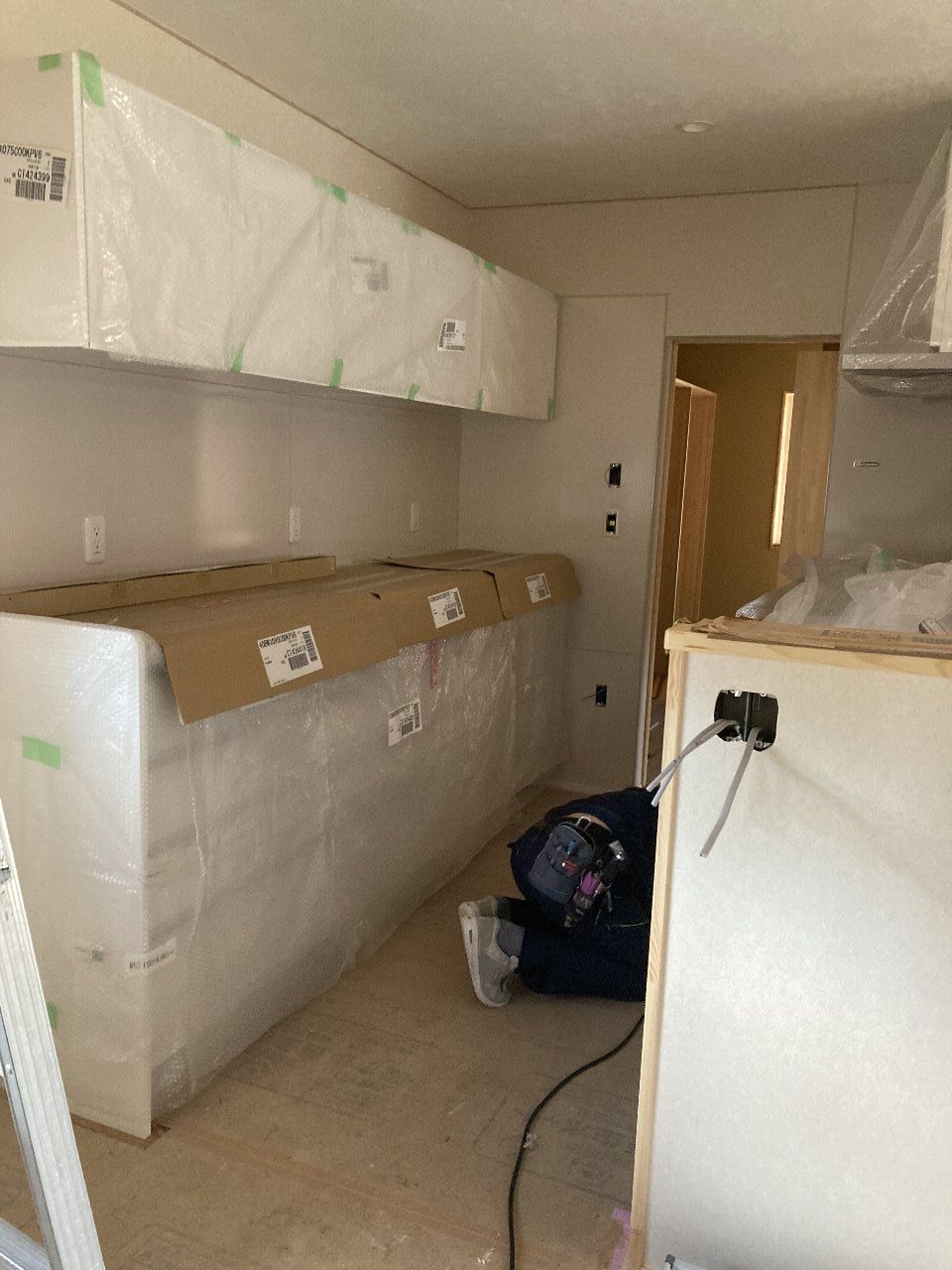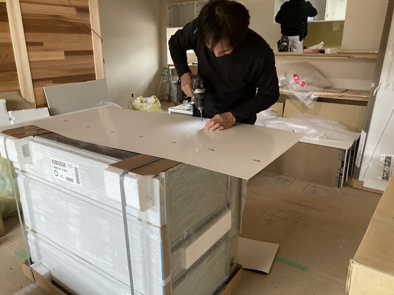 今日は、タカラスタンダードのキッチンを取り付けています。キッチンとユニットバスの施工は、だいたい2人組です。今回、カップボードの奥行を550にしましたが、引き出し部分の奥行は450と同じキャビネットの為、キャビネットの裏側をこの様にふかしています。ちょっと勿体ない💦タカラさん~550のキャビネットも造ってください~(あんまり需要がないのかな)