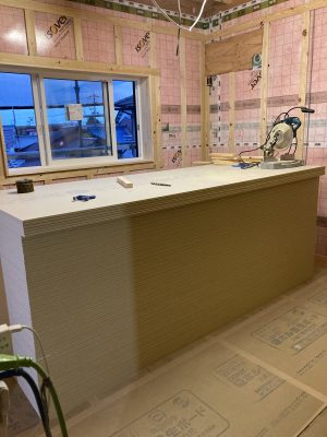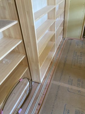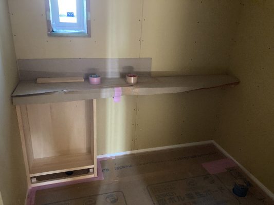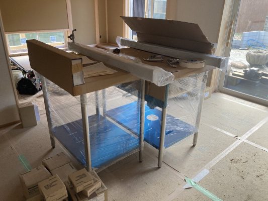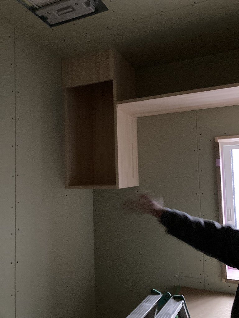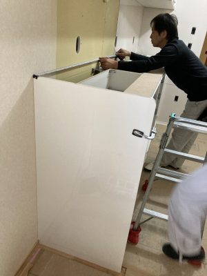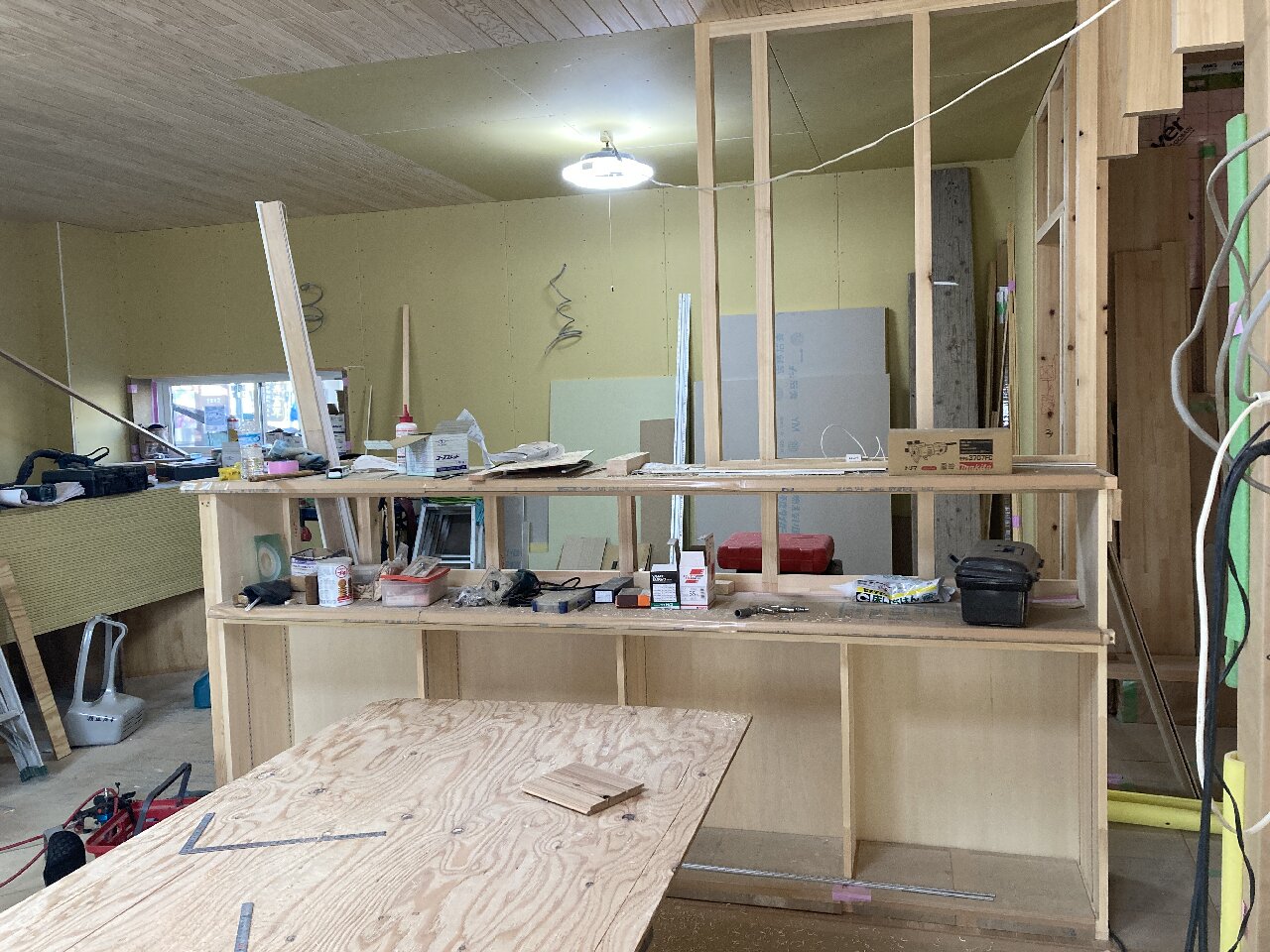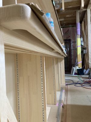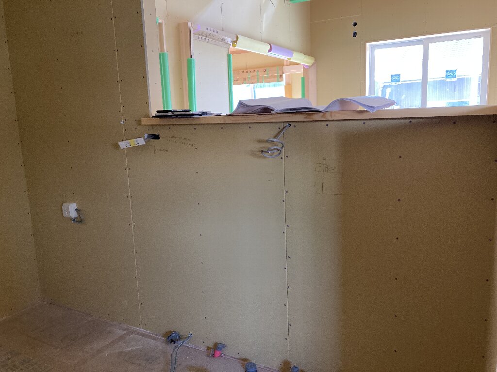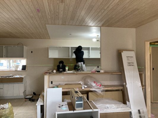 今日は、タカラスタンダードのキッチンを取り付けています。キッチンとユニットバスの施工は、だいたい2人組です。今回、カップボードの奥行を550にしましたが、引き出し部分の奥行は450と同じキャビネットの為、キャビネットの裏側をこの様にふかしています。ちょっと勿体ない💦タカラさん~550のキャビネットも造ってください~(あんまり需要がないのかな)