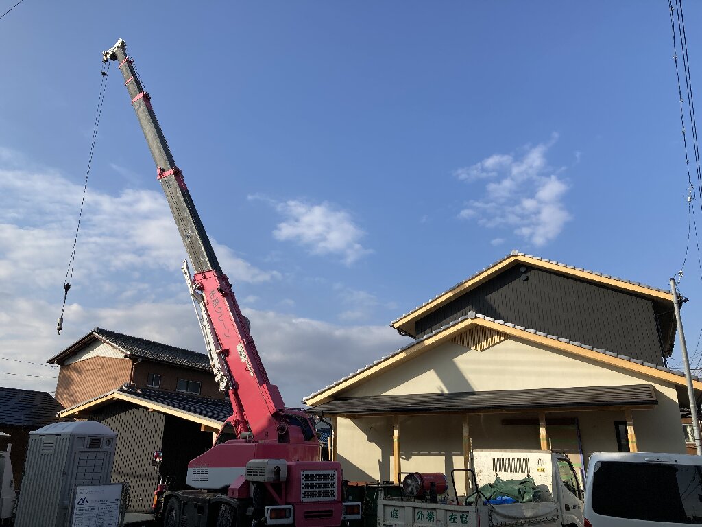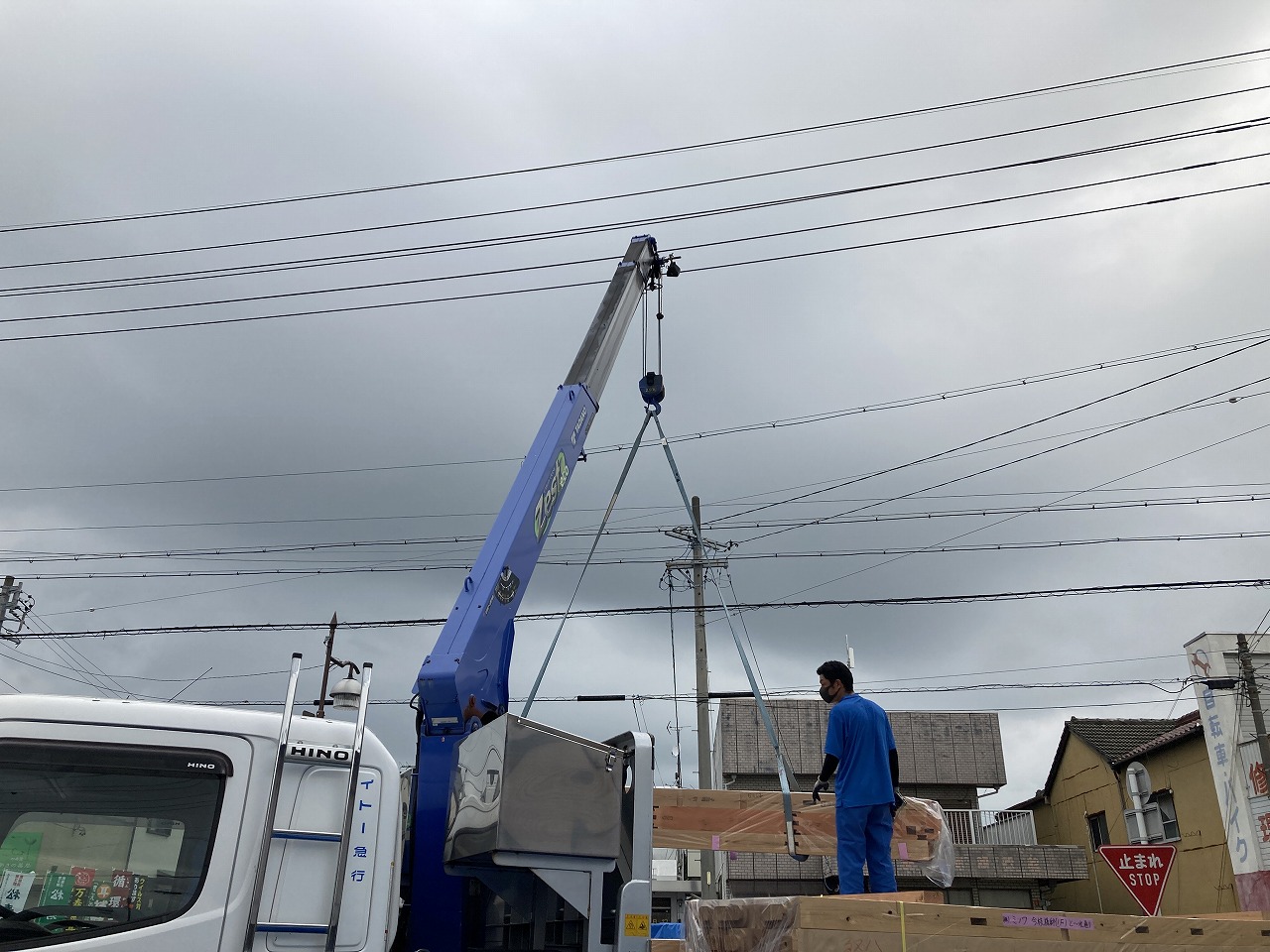 この荷物を運んでくれるレッカー付トラックに少しだけ手伝ってもらって、梁をかけたそうですよ👍なるほど、s幸棟梁頭いい。今日はお天気が良いはずが、なんだか雲行きが悪くなってきて、雨がぱらつきます💦もしかして、私が北名古屋から連れてきたかも?です。雨女になってしまったかも・・・雨を降らす邪魔者はこのくらいで退散です(笑)明日からは、台風の影響で雨が降る予報。何とか20日はお天気がよくなりますように。