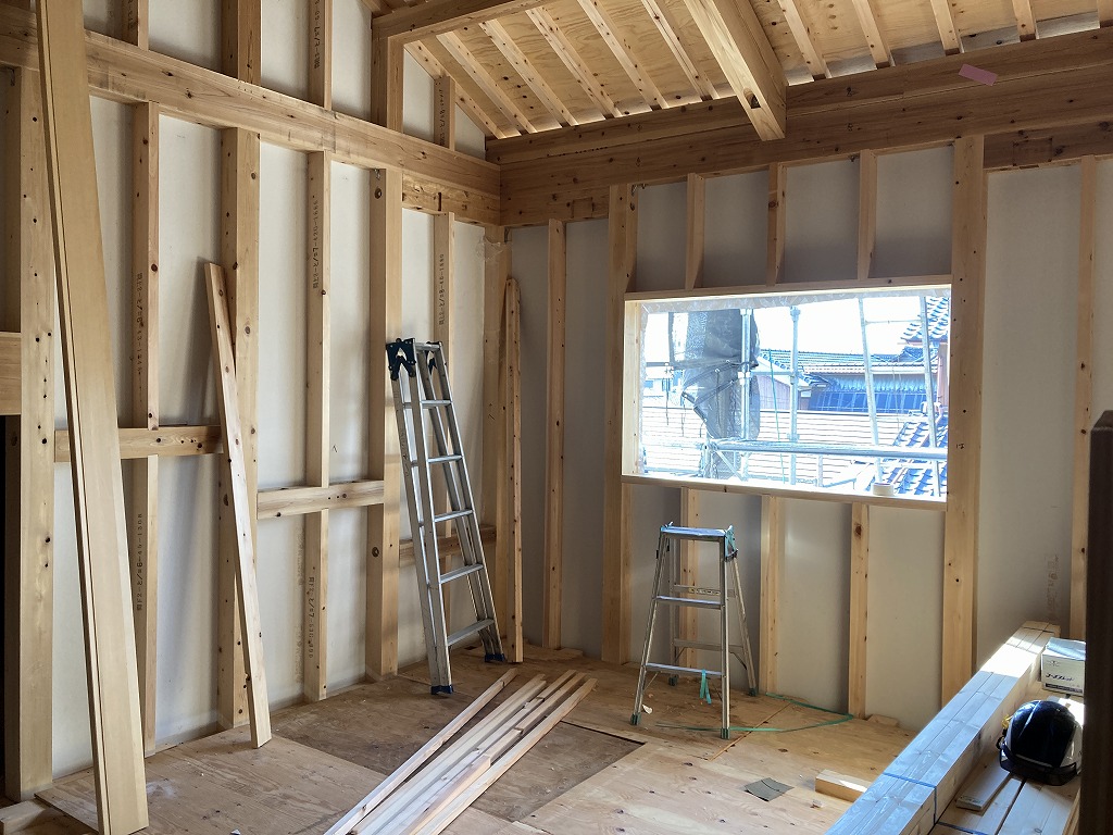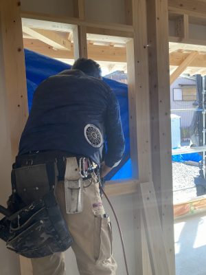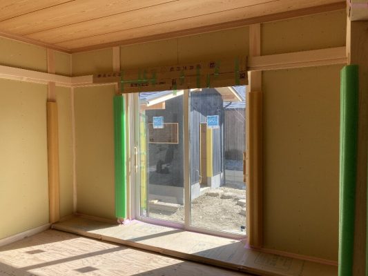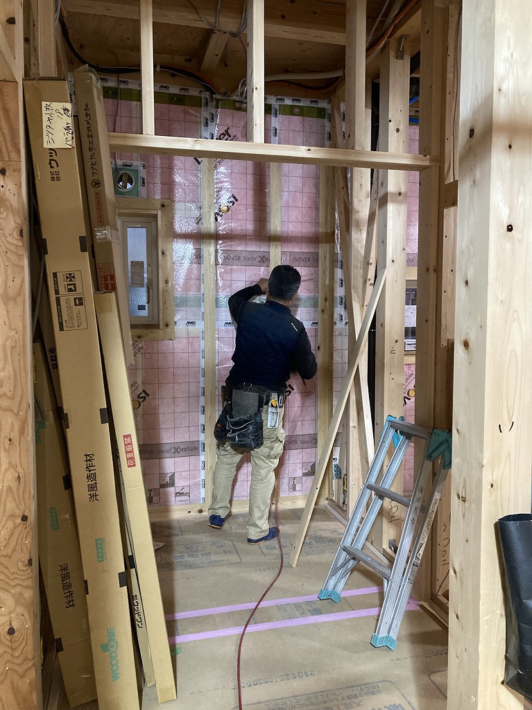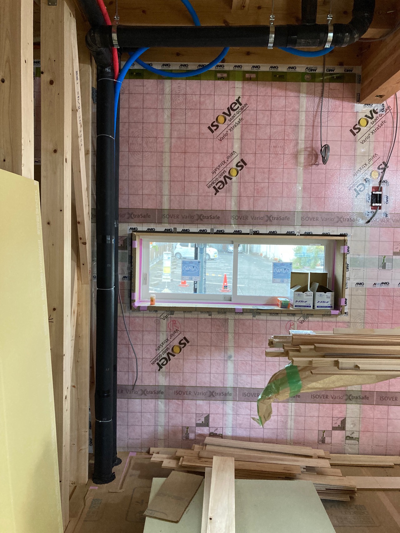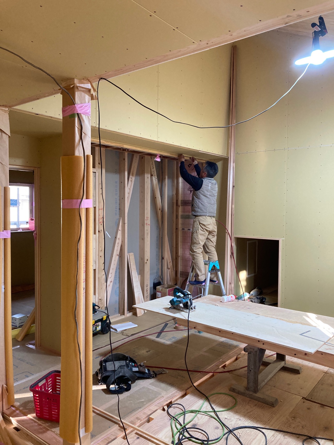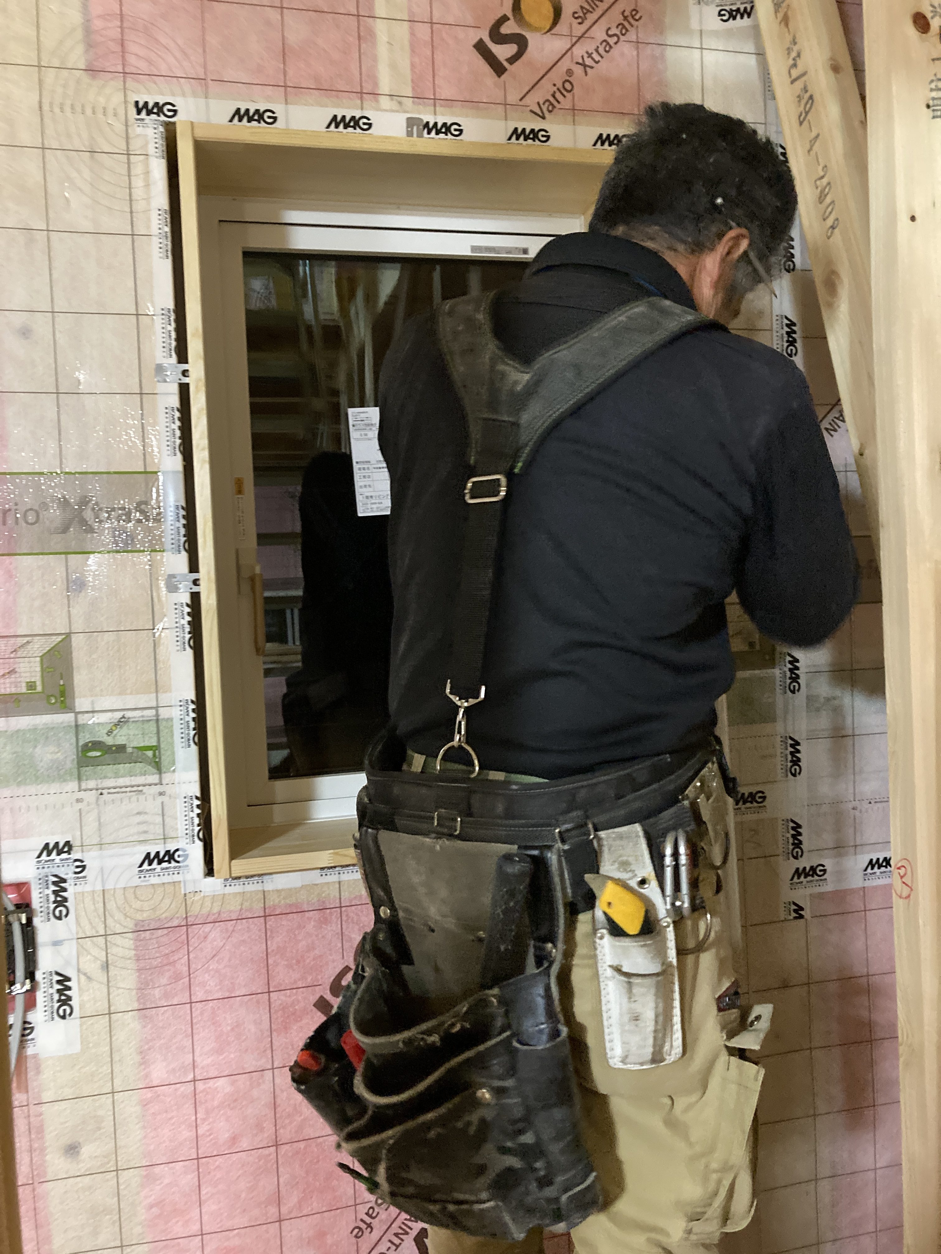 内部は、s幸棟梁が窓を取り付ける下地を入れています。既に、窓枠は上棟前に造って本社に置いてあるそうです💦段取りいいですね👍明日はi様ご夫婦とお会いするので、s幸棟梁にいろいろとアドバイスをいただきましたので、お伝えしたいと思います。