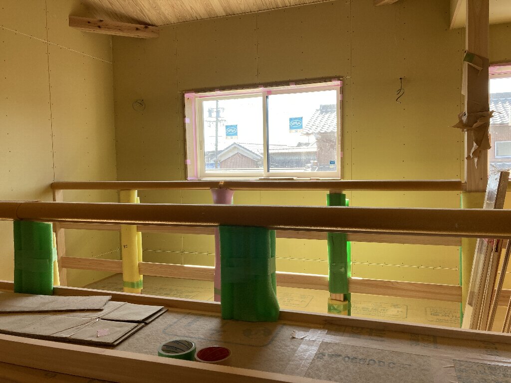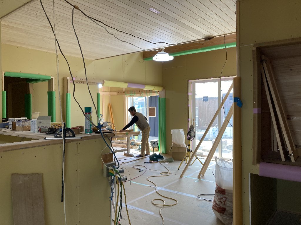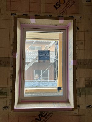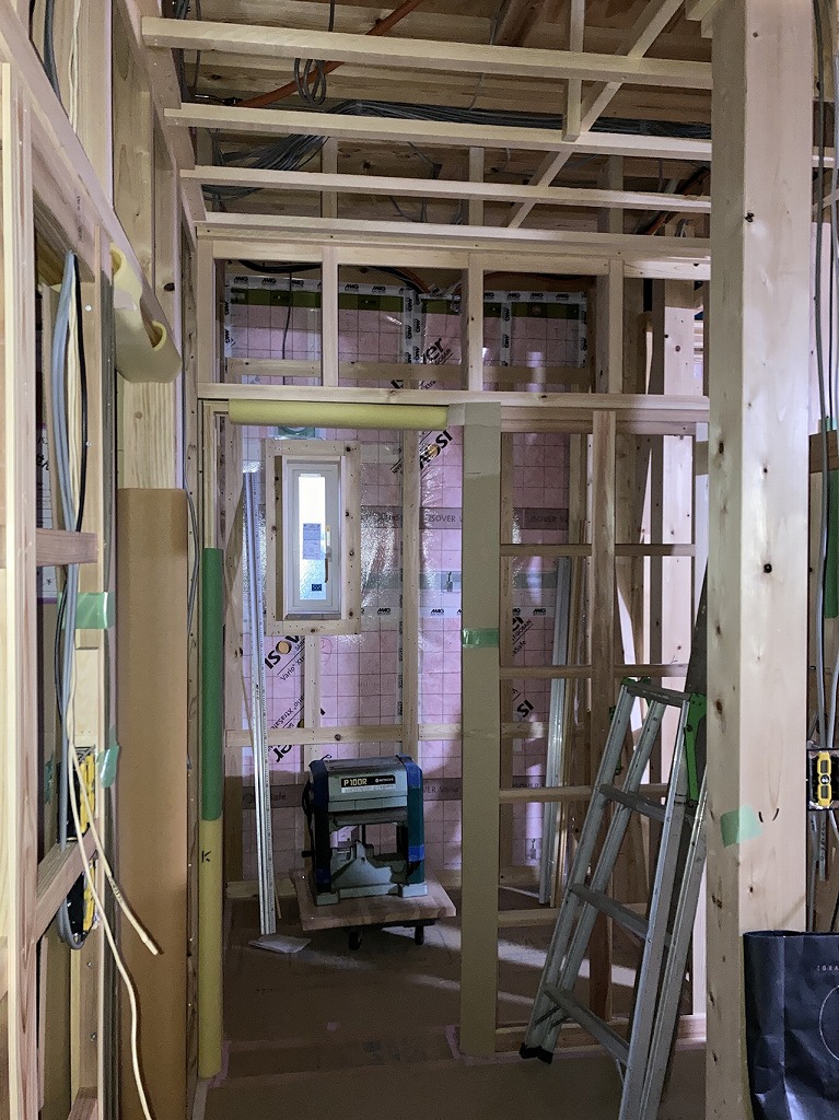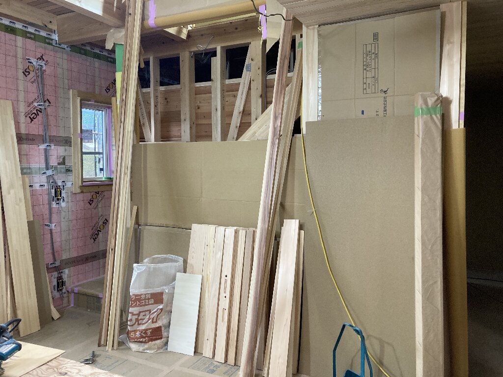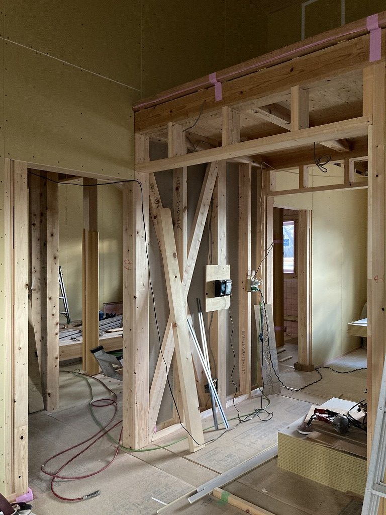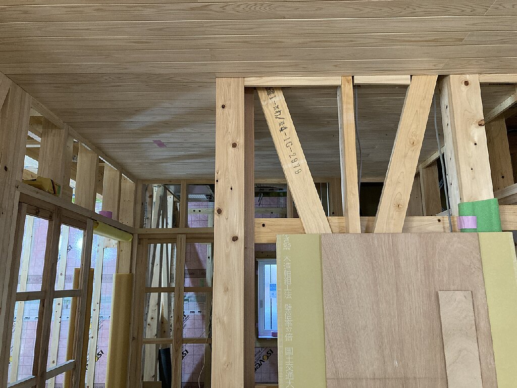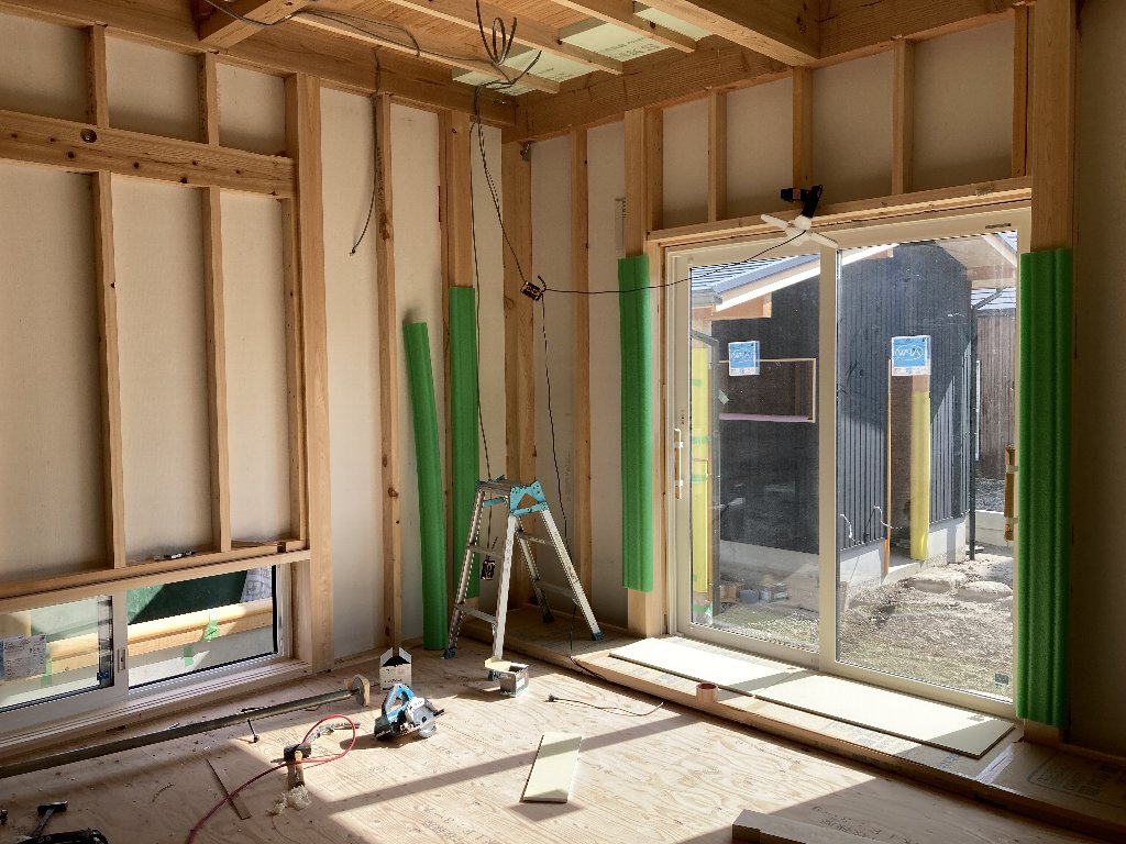 内部は、s幸棟梁が窓を取り付ける下地を入れています。既に、窓枠は上棟前に造って本社に置いてあるそうです💦段取りいいですね👍明日はi様ご夫婦とお会いするので、s幸棟梁にいろいろとアドバイスをいただきましたので、お伝えしたいと思います。