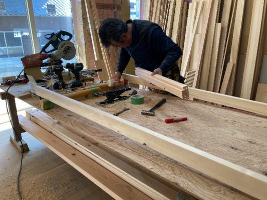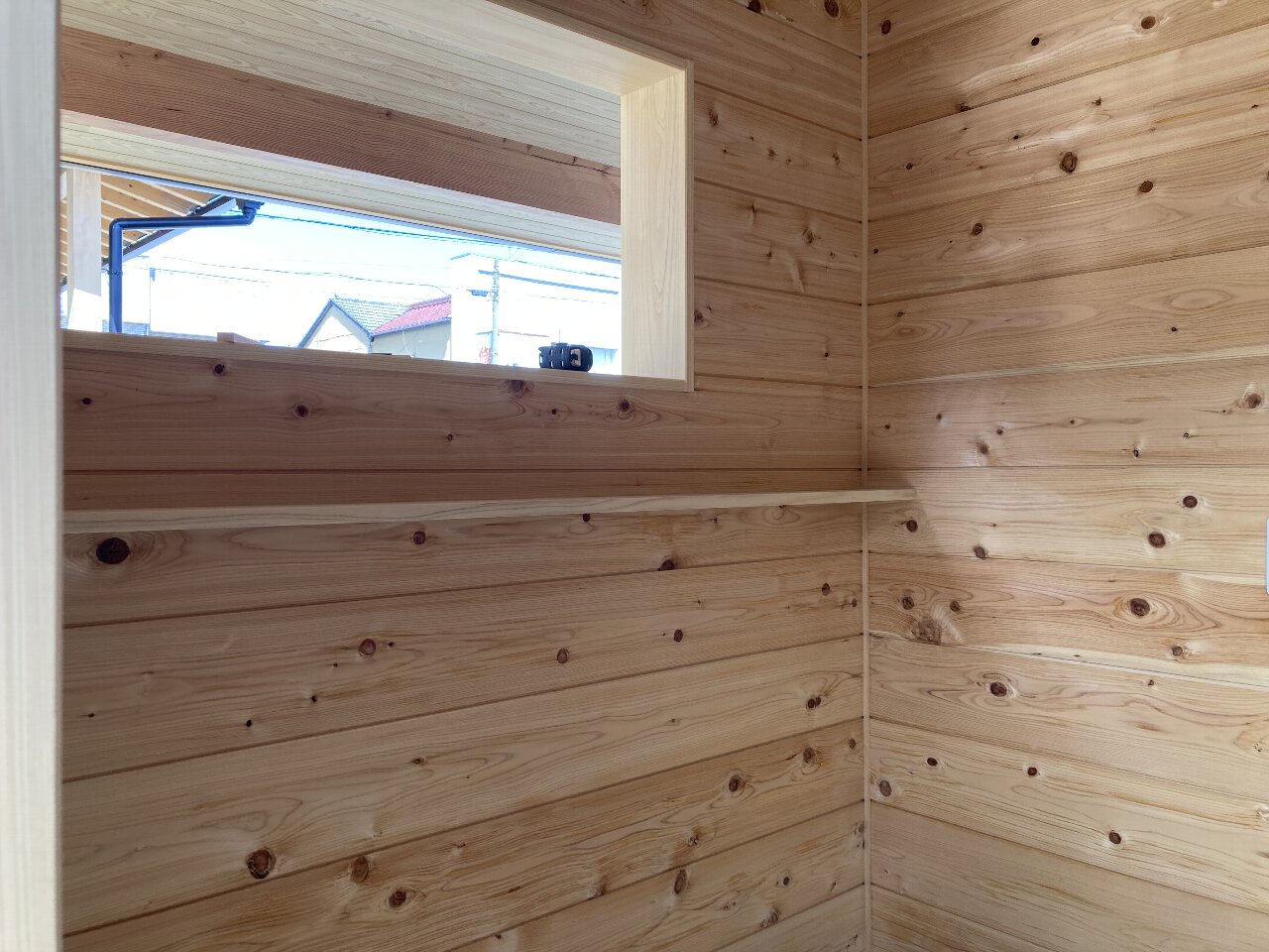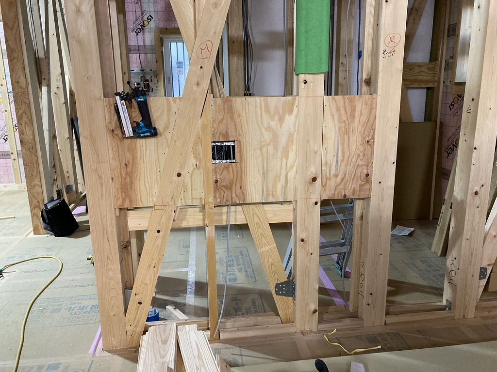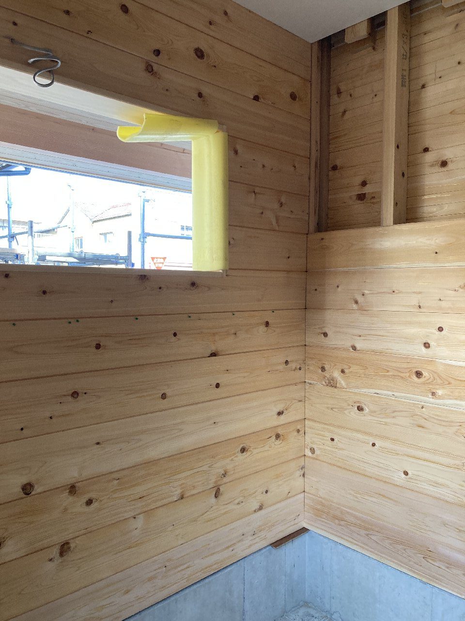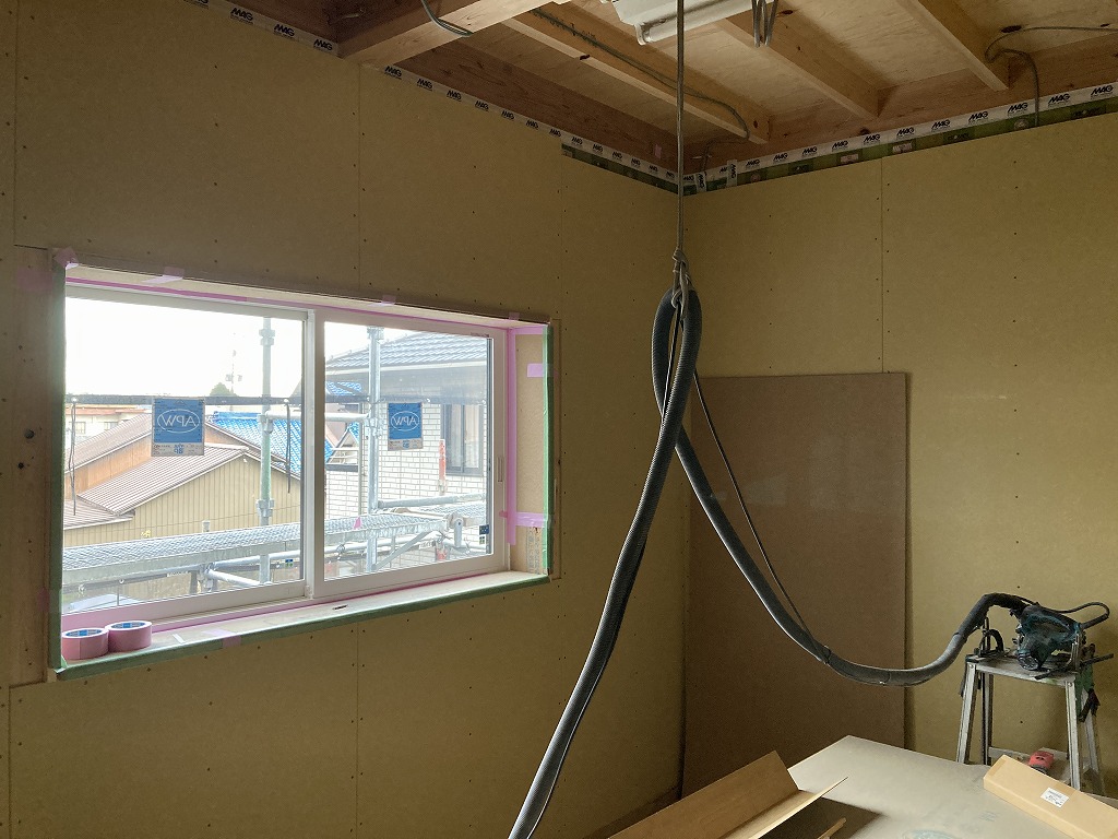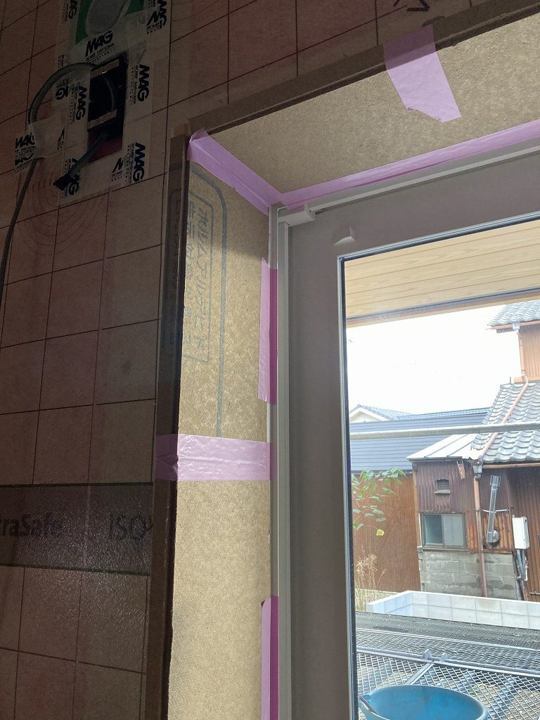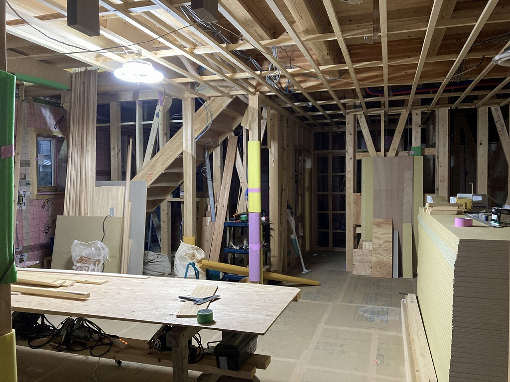 内部は、s幸棟梁が窓を取り付ける下地を入れています。既に、窓枠は上棟前に造って本社に置いてあるそうです💦段取りいいですね👍明日はi様ご夫婦とお会いするので、s幸棟梁にいろいろとアドバイスをいただきましたので、お伝えしたいと思います。