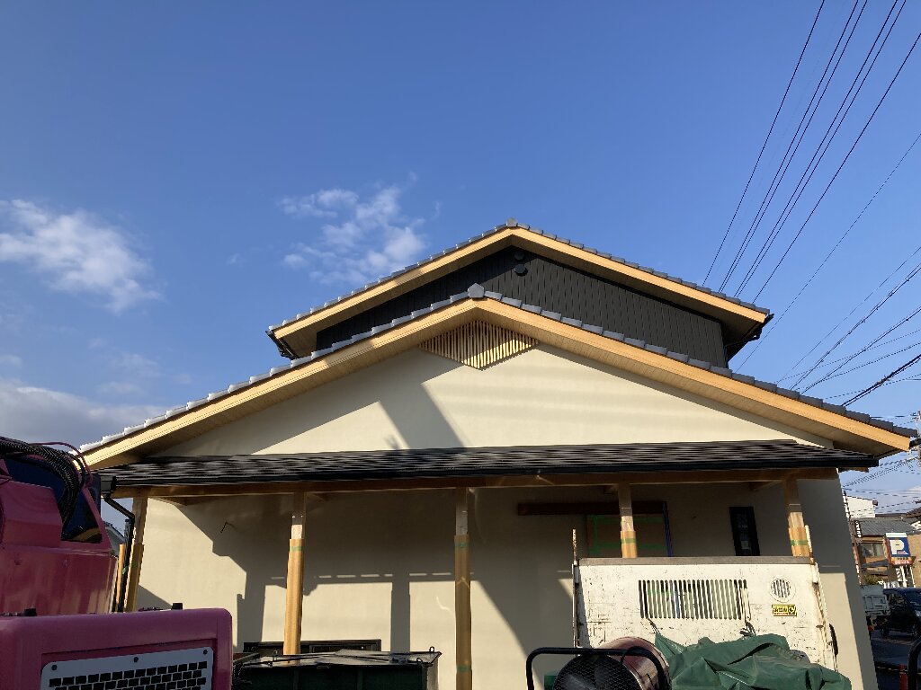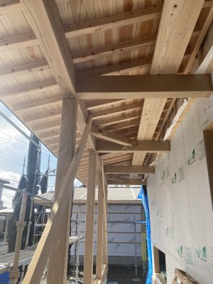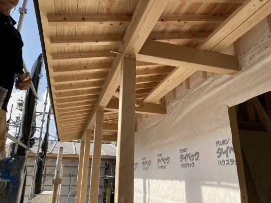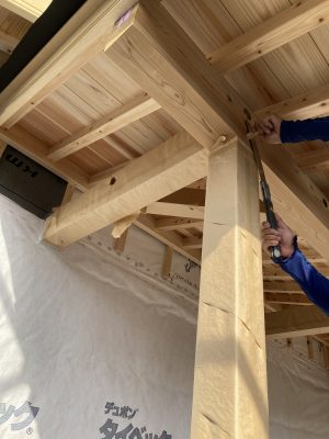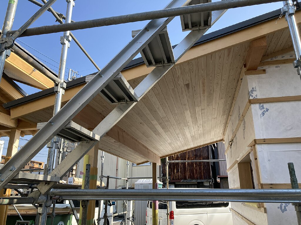 s幸棟梁は、軒裏の羽目板張りをしています。