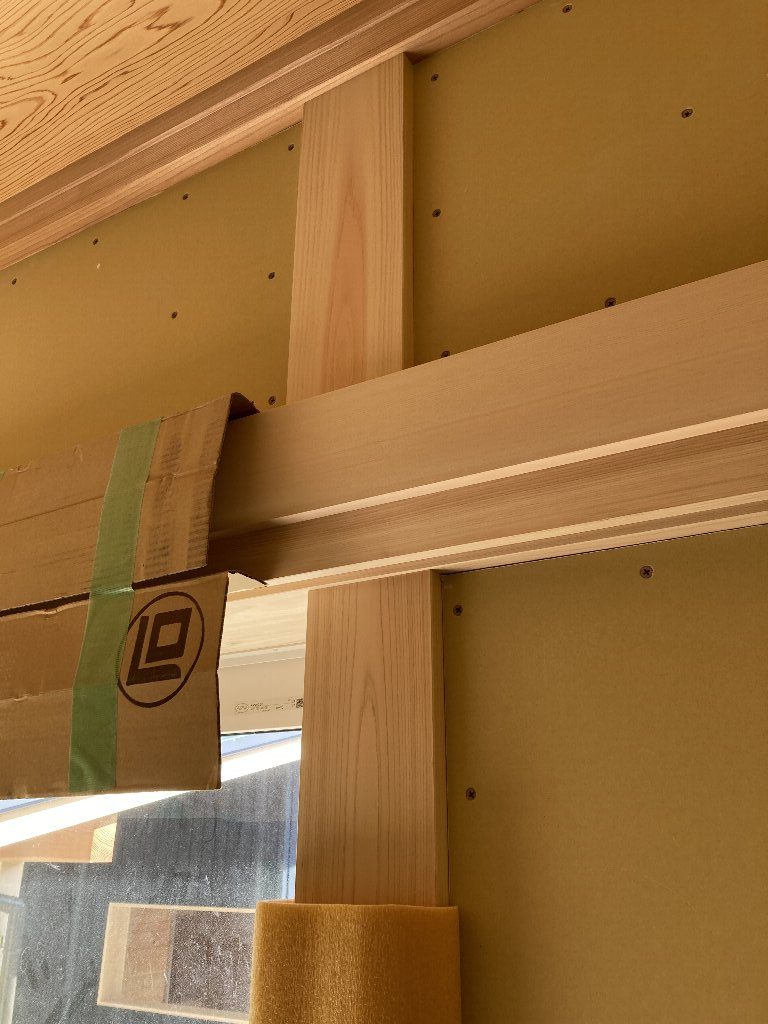 そうそう、s幸棟梁にお願いしお手間をかけてもらったところを紹介するのを忘れていました。和室の掃き出し窓には、引き分けの障子にしましたので、長押より上は構造柱が見えなくなってしまうので付け柱を付けてもらいました。よくよく見ると出が違うのですが、障子が納まったら気にならなくなります。
