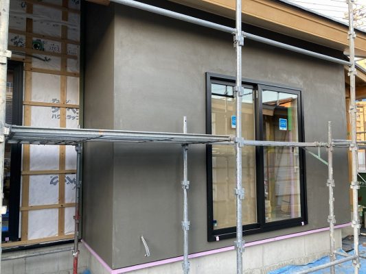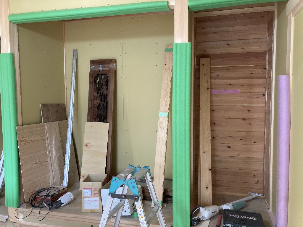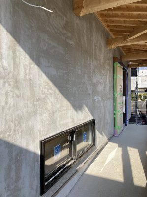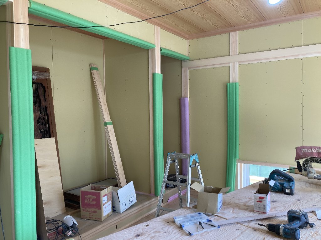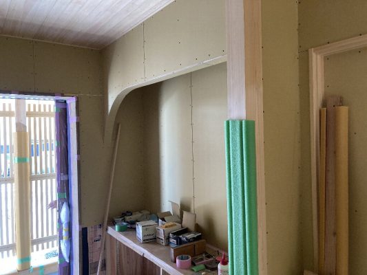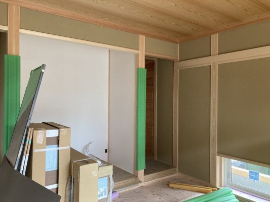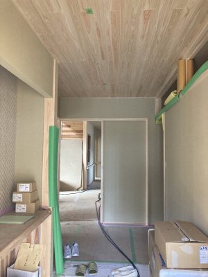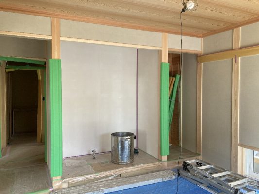 和室は、y口技建さんが珪藻土の下地処理(プラスター塗り)を終えています。こちらも、仕上げが楽しみです。