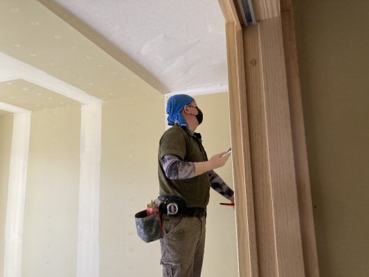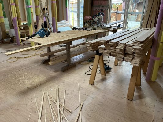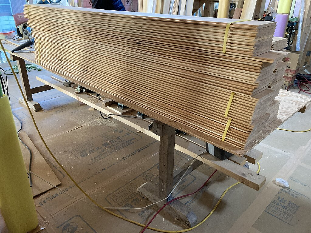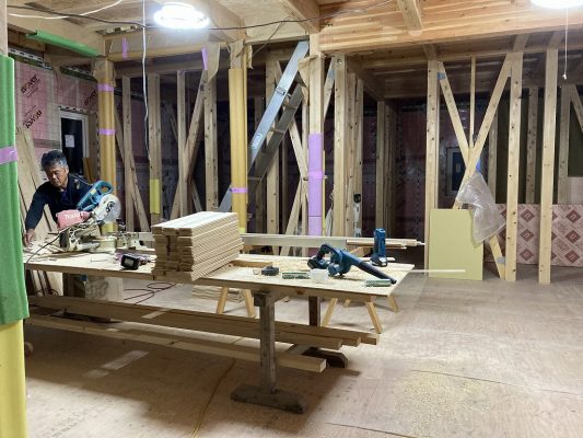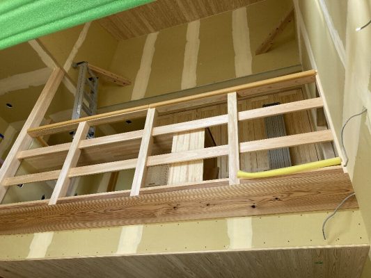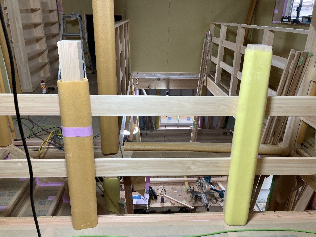 棟梁は、クロス工事の後に手摺を取り付けれるように手摺の加工をしています。今回、yo様が「棟梁に造って欲しい!」とのご希望で、既製品の手摺ではありません。既製品の手摺は丸くて握りやすいというメリットもあるのですが、造ってもらうとやっぱり温かみがあるのでとの事で選ばれました。s幸棟梁、私がおおよその寸法を描いて渡した断面図よりも大きな丸い面を取って、優しい感じの手摺を造ってくれていました👍楽しみにしていてください。