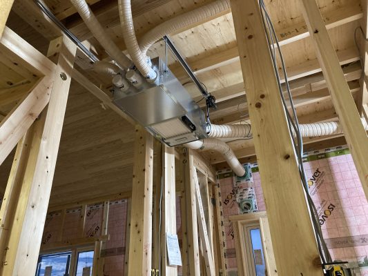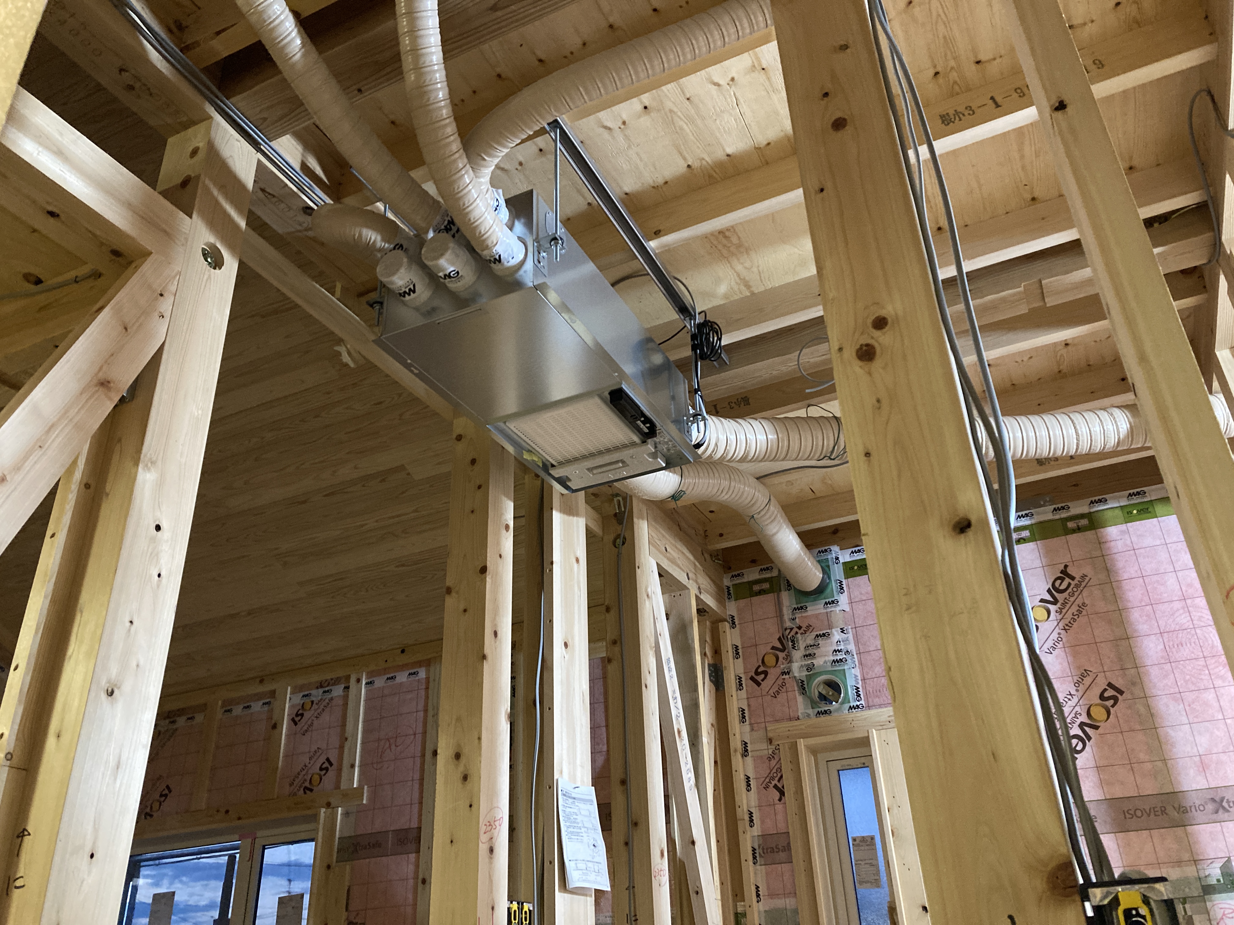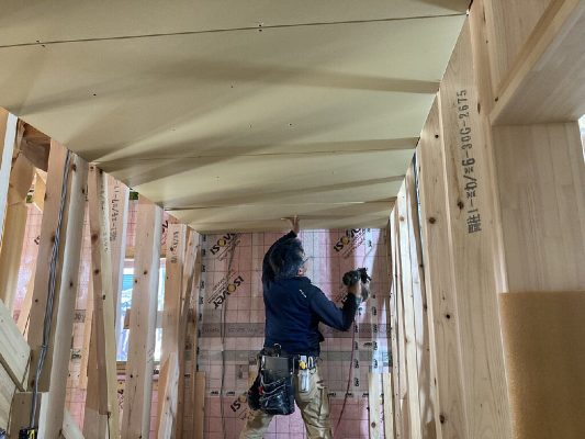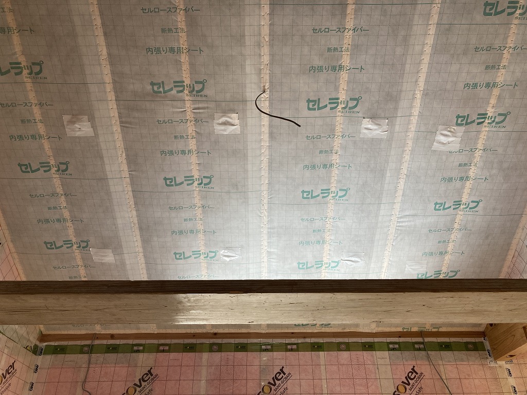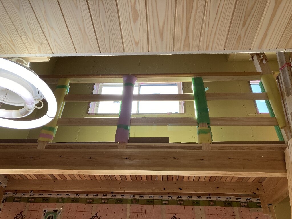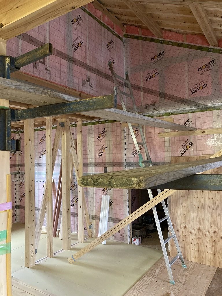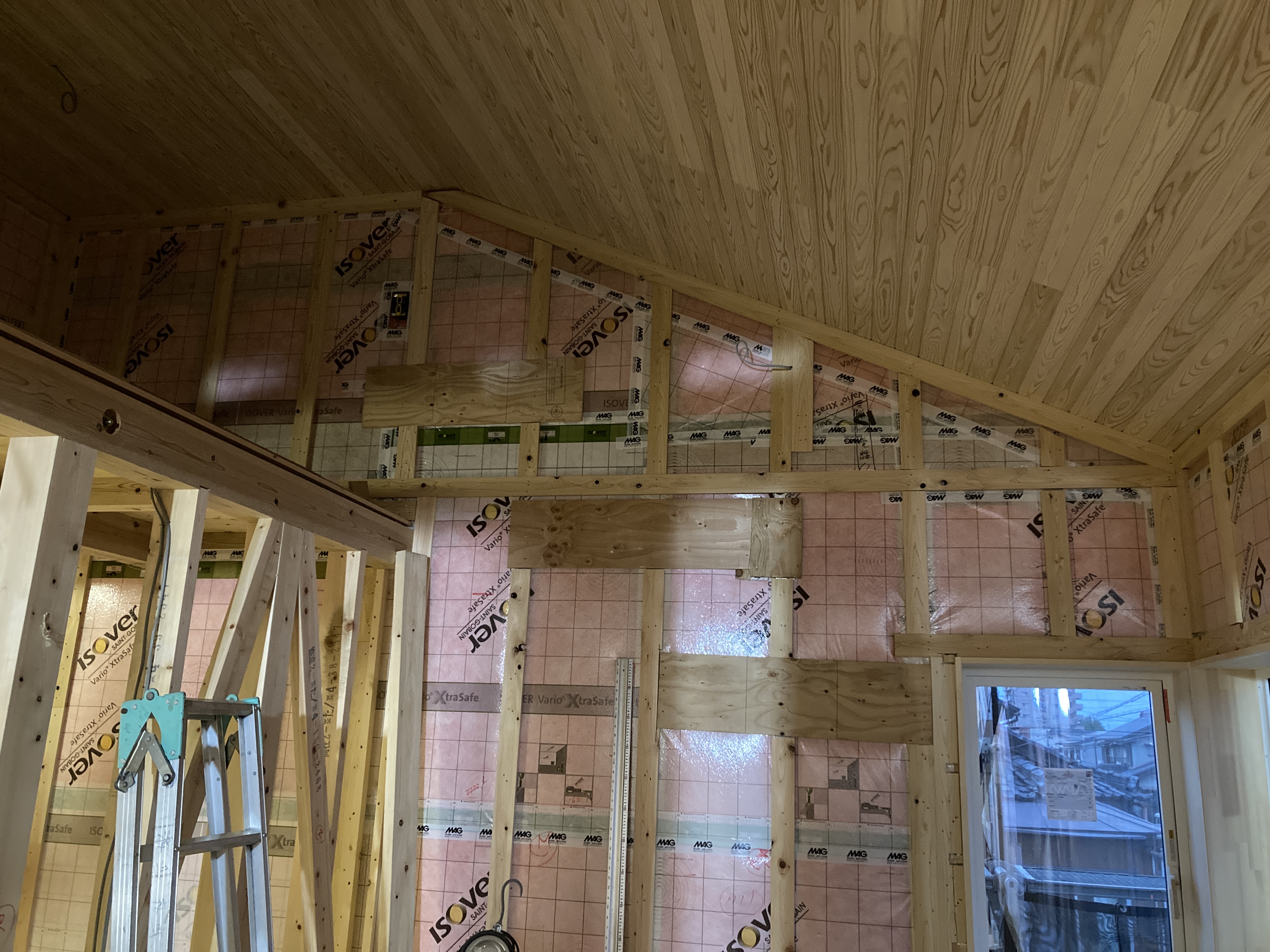 1階の屋根を伏せる部分には、ツシゴ(根太)と合板を張る事によって、地震や風圧による横からの力を耐力壁に伝達させています。そして、合板の上には防湿気密フィルムを敷いていきます。上方向の気密は、こちらで取っています👍