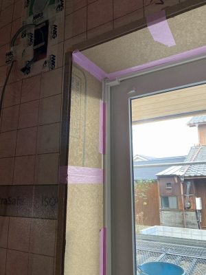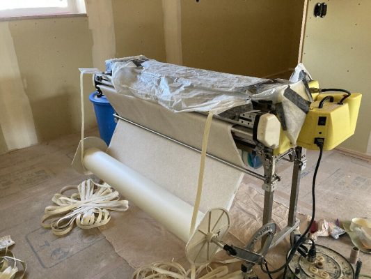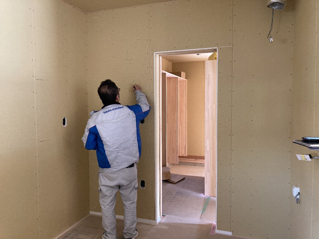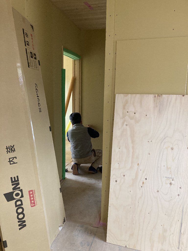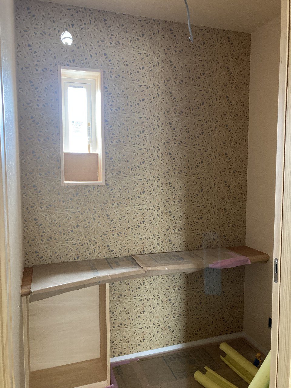 インテリアmイチさんによって、クロス工事のパテ処理が終わり、1階寝室からクロスを貼ってきています。yi様が選ばれた和紙調のクロス、落ち着いていていい感じになりそうです👍