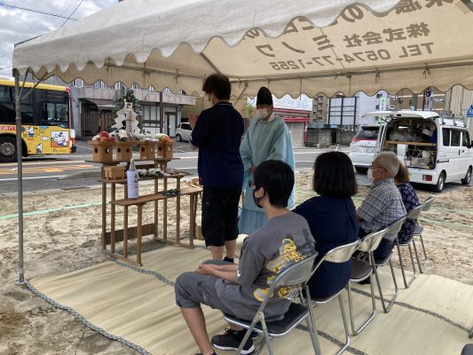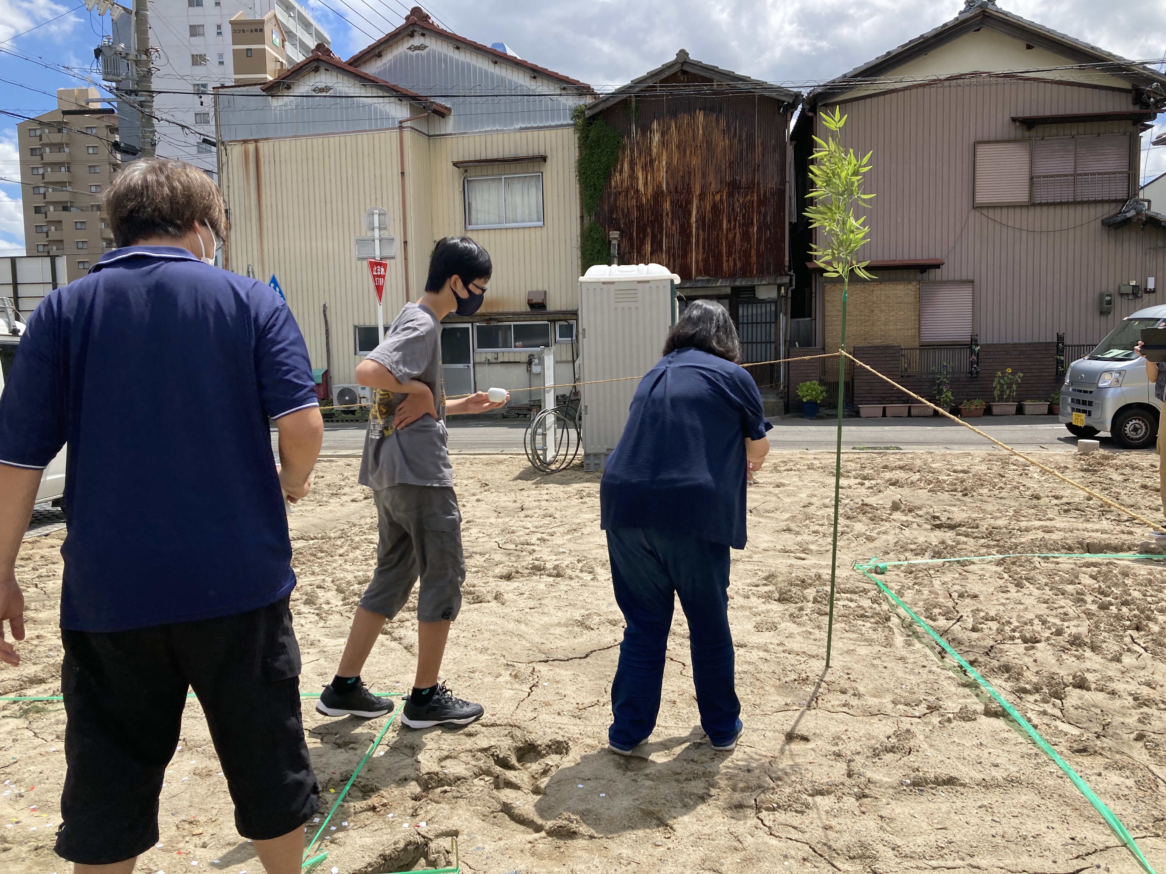 最後に建物の四隅にお神酒とお塩、お水でお清めをされました。朝早くから打合せもさせていただき、ジリジリと暑い日差しが刺す中の地鎮祭、お疲れ様でした。