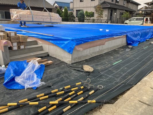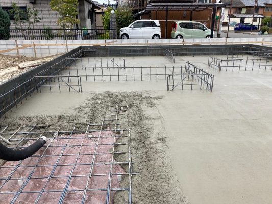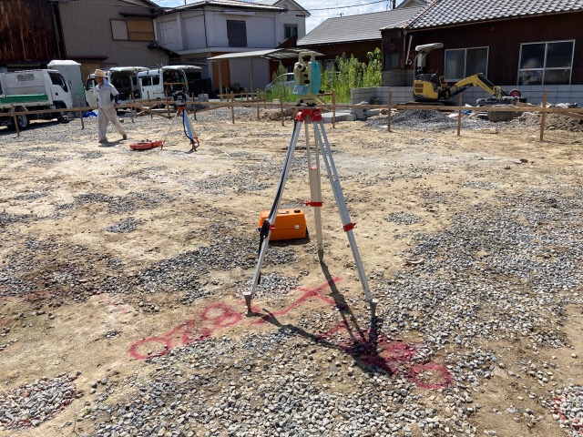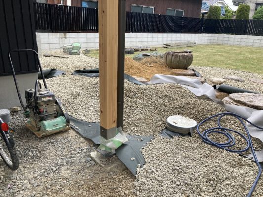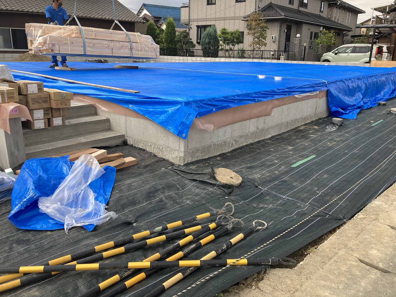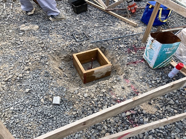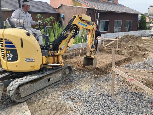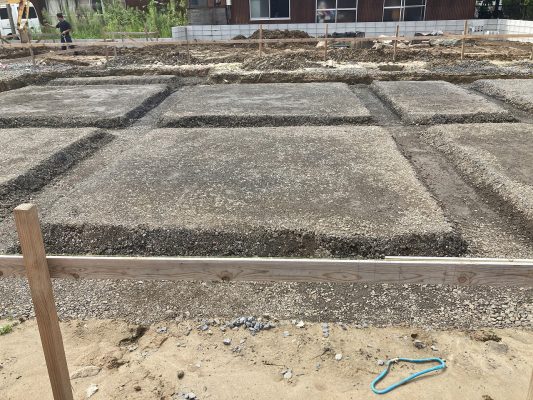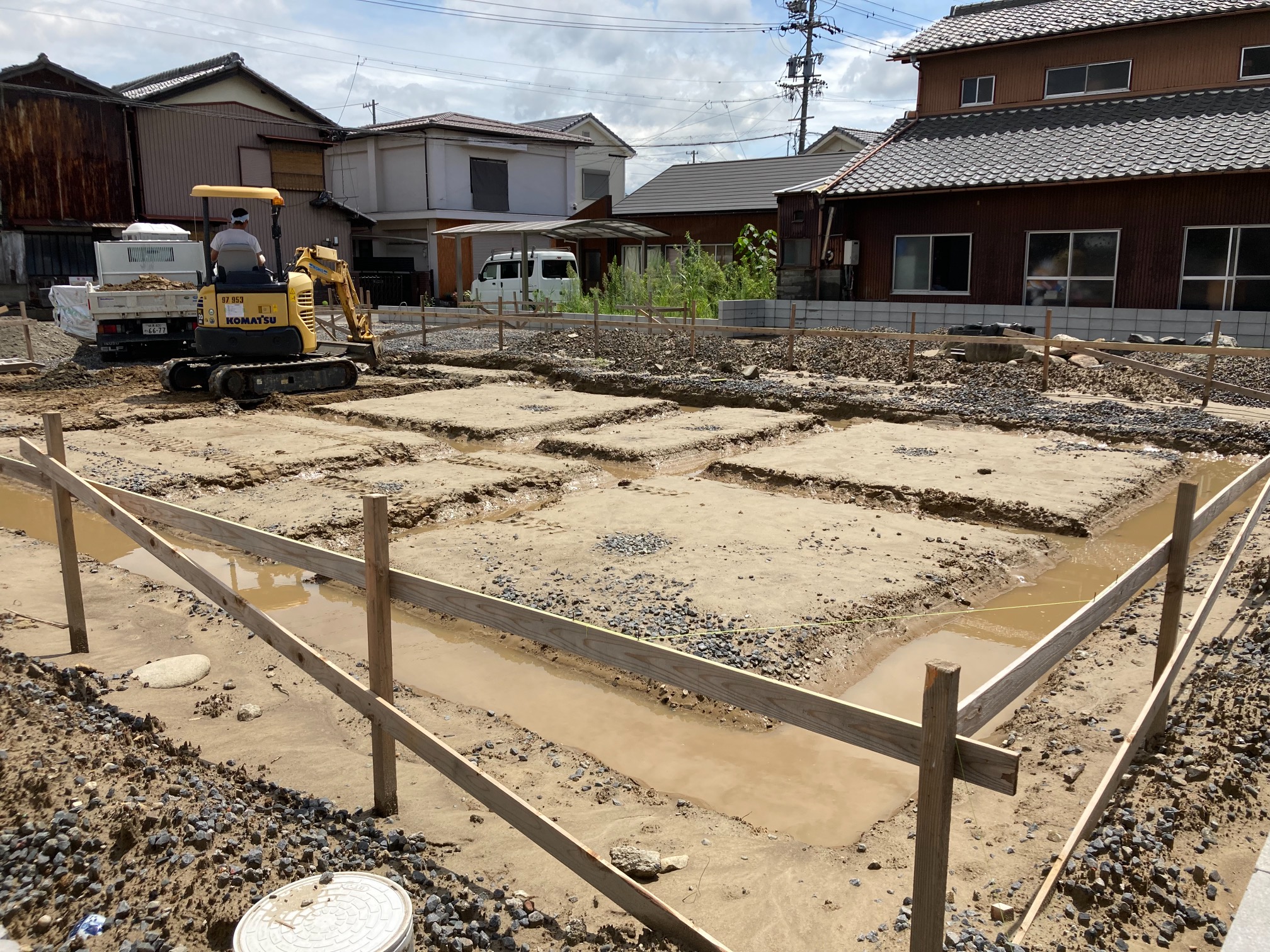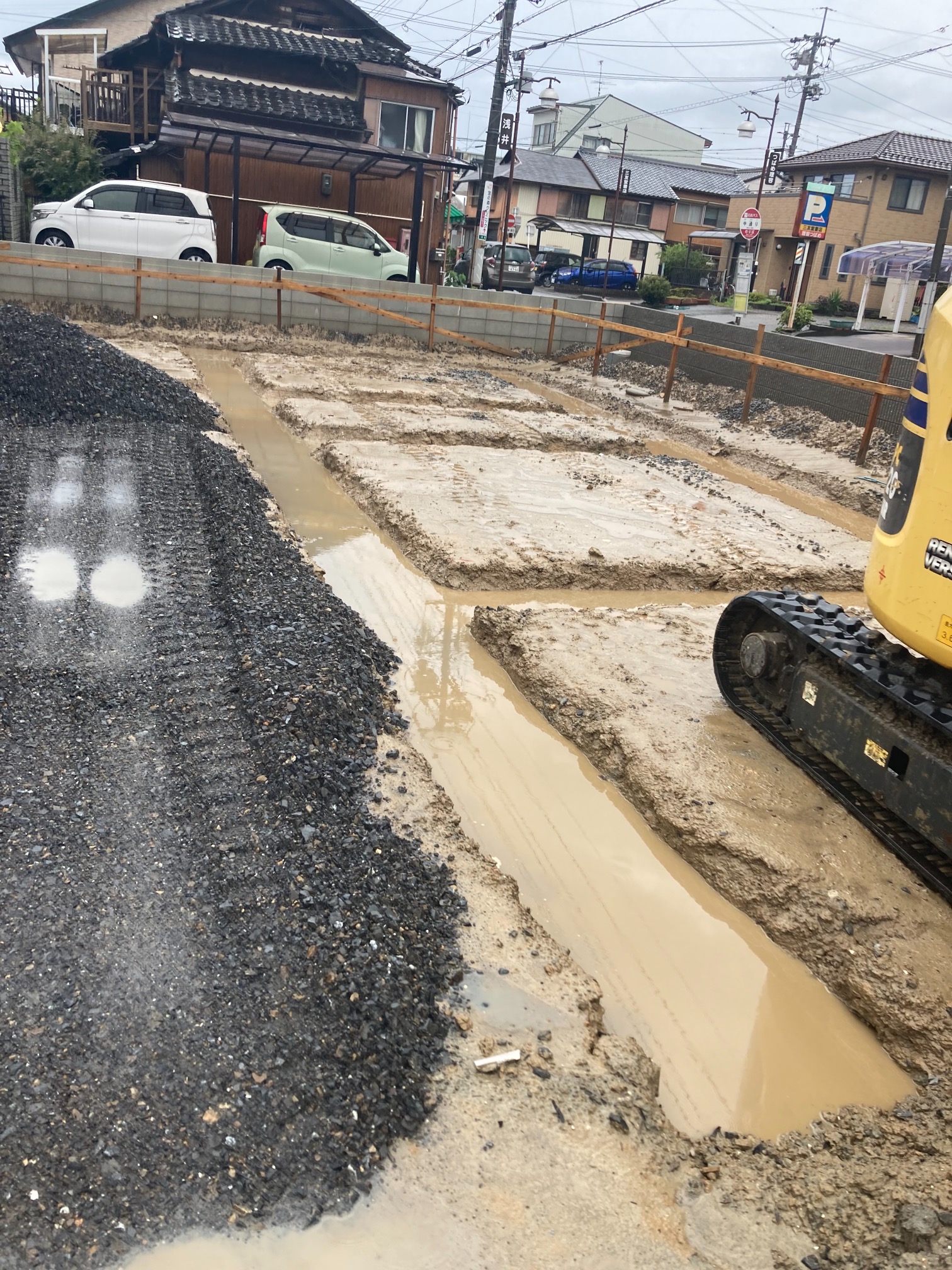 雨が降ったり止んだりもありますが、川も近い事もあり水はけが悪く、砕石敷き及び転圧も難航した様子です。基礎の前には地盤改良を行いましたが、砕石パイル工法を施工されて正解でした👍砕石パイル工法は、遠い将来に建物を壊して新しい建物を建てる際に撤去する必要が無く、有害物質が発生しにくい事や地震の揺れにも強い事からお勧めしていますが、水を通過させる能力が高い為、液状化現象対策としても期待できるそうです。