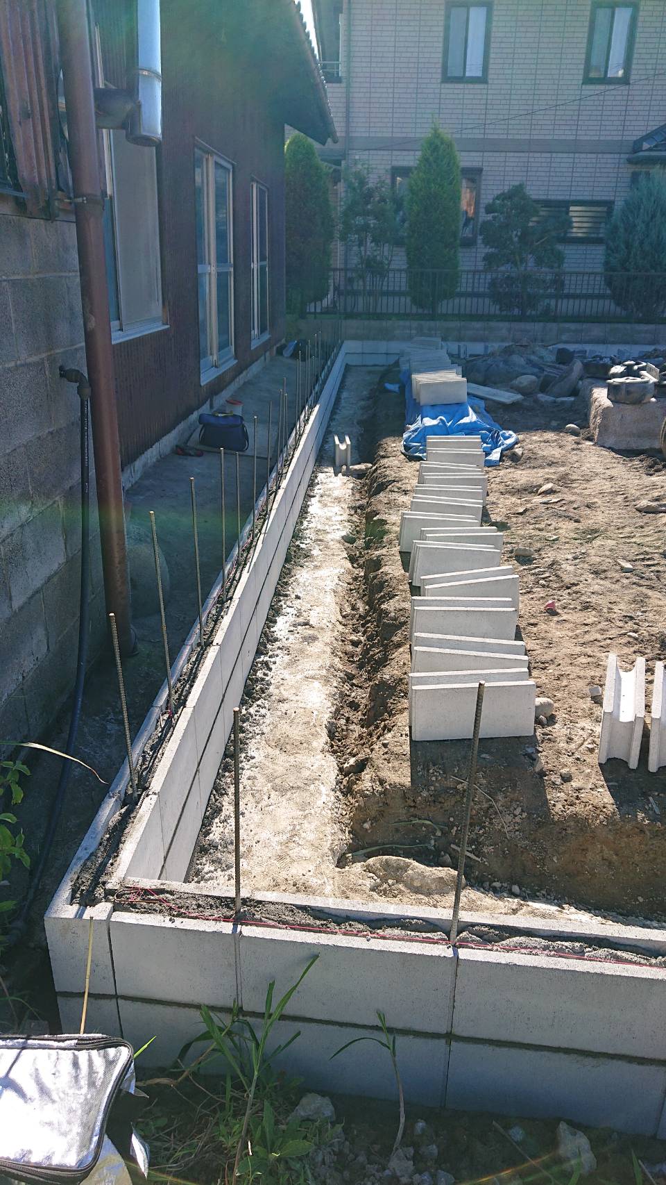 地盤改良工事を挟んで、外構工事再開です。先日ベースコンクリートまで打ち終わっていますので、今日からブロック積みです。敷地が広いので、先行ブロック工事も大仕事です💦