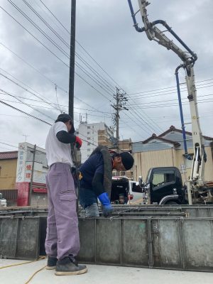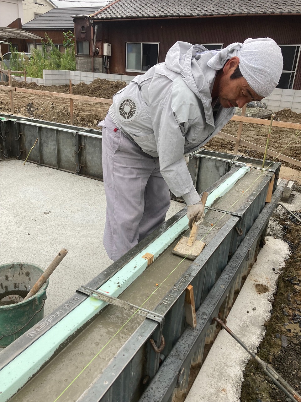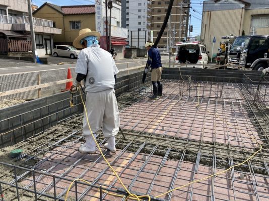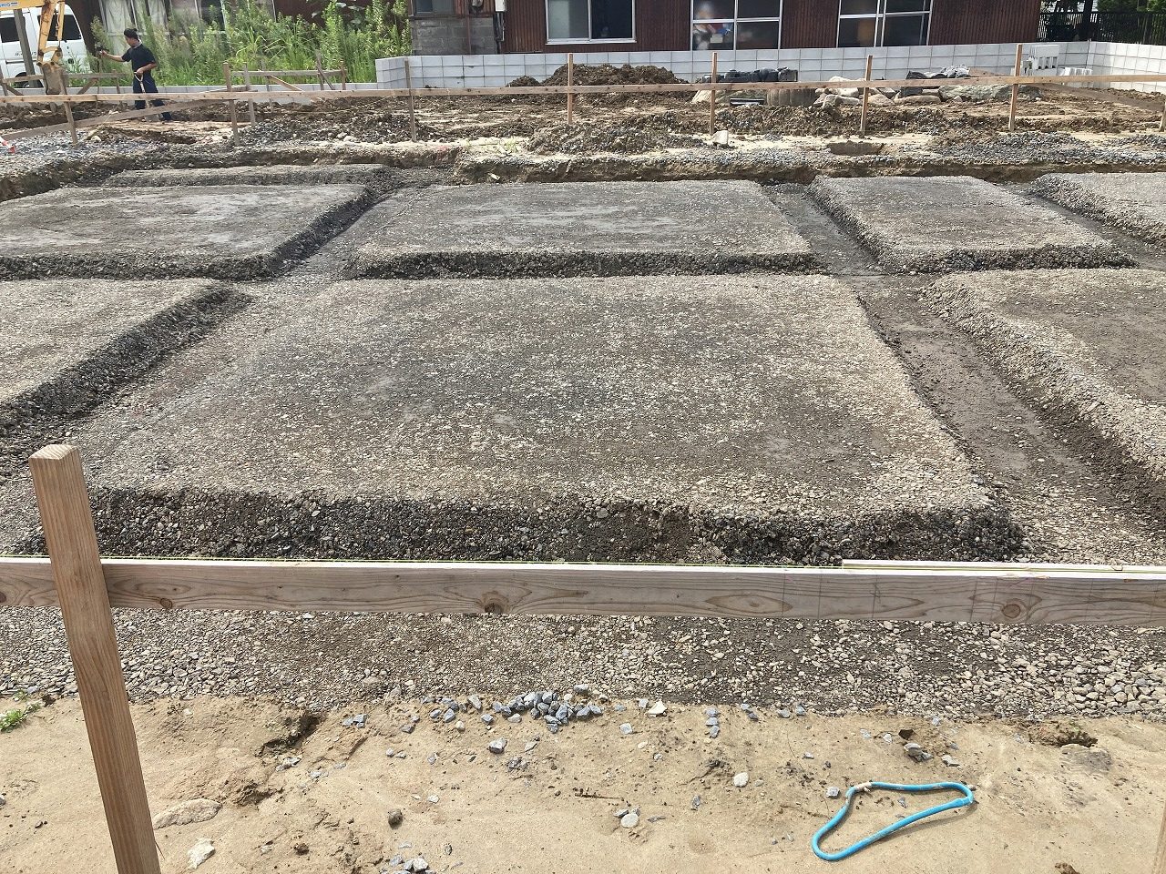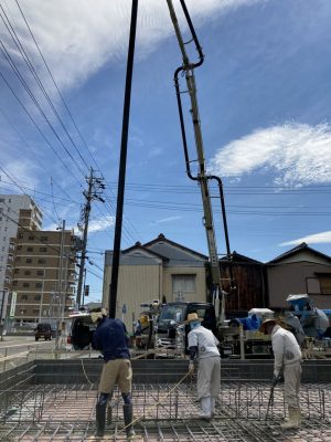 暑いですが、お天気が良い日が続き、基礎工事がやっと順調に進んでいます👍昨日の夕方に、またの名が多いhさんの配筋検査に無事合格し、今日は基礎の底盤のコンクリート打設を行いました。炎天下の中、空調服を着て基礎部隊のt広さんがバイブレーターでコンクリートを締め固めています。コンクリートの強度に係る大切な作業です。