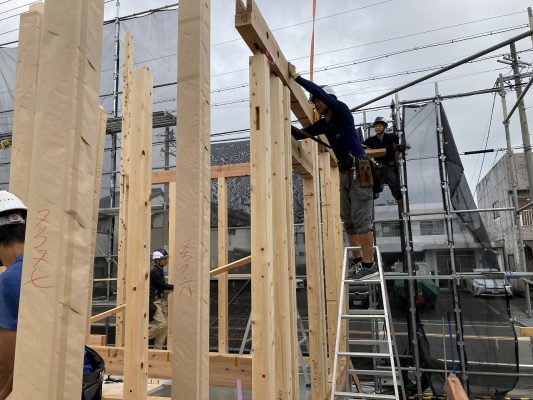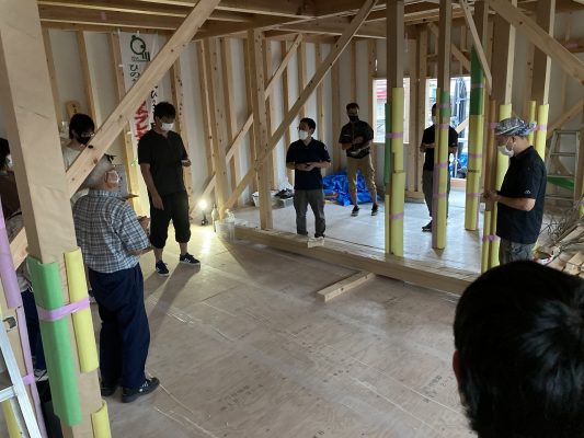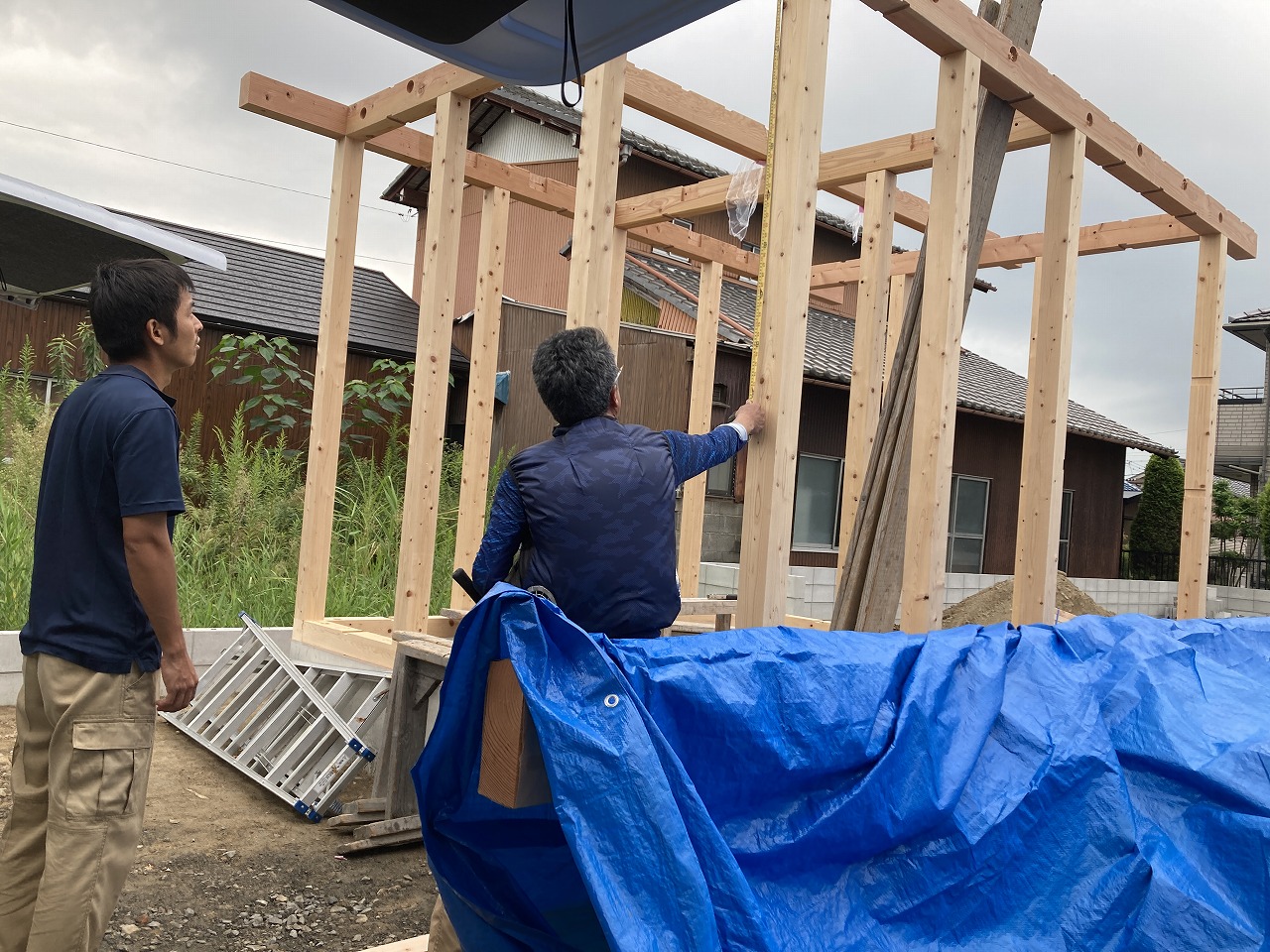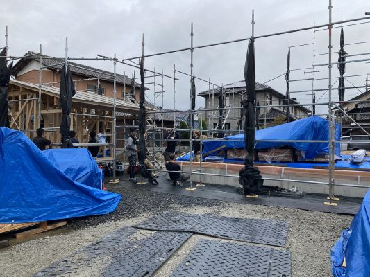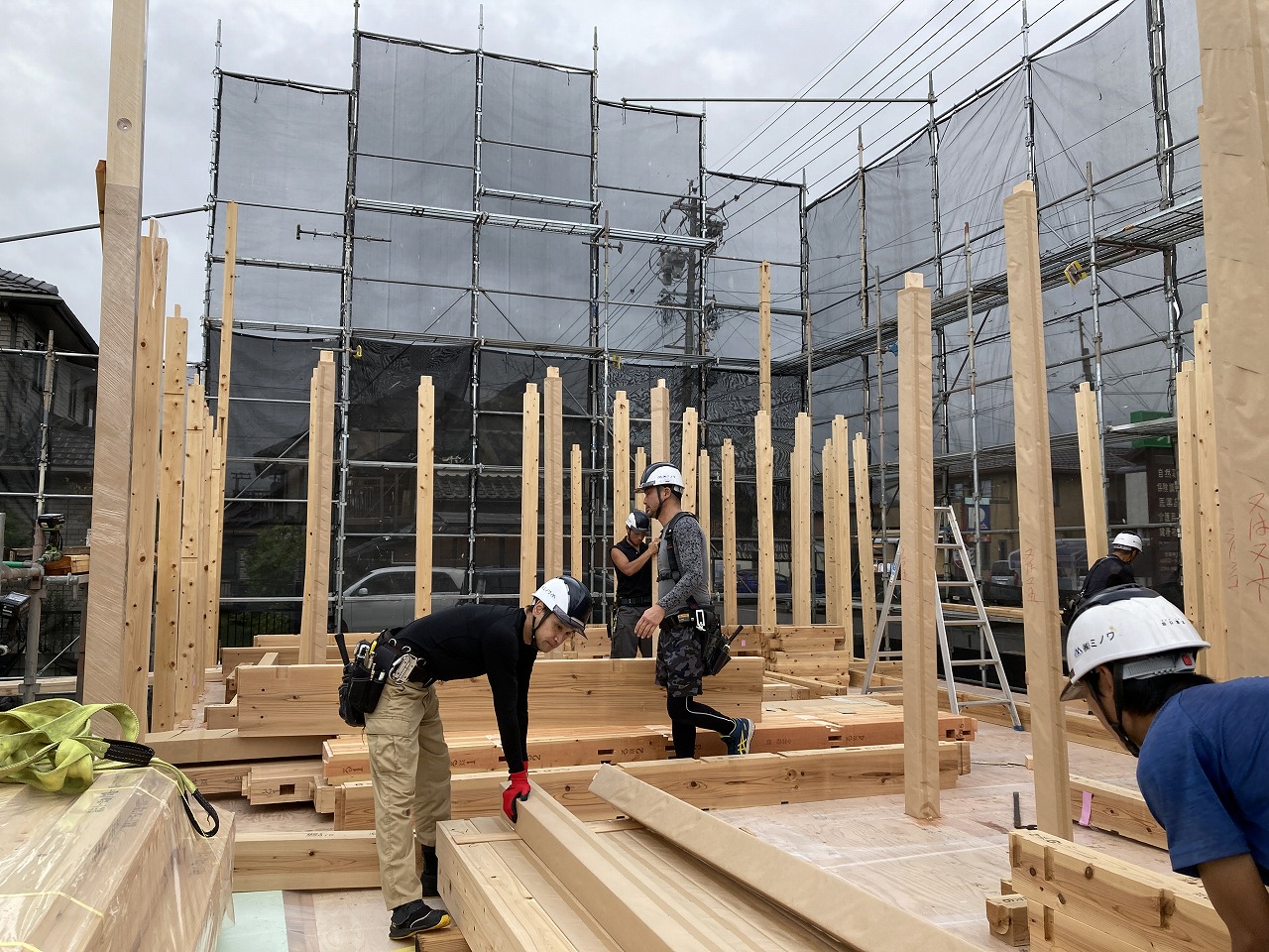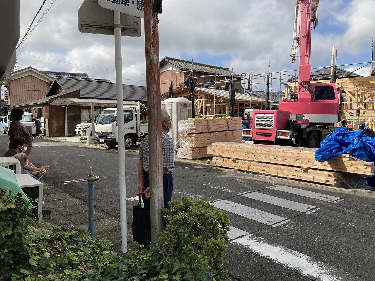 大工さん達の朝は早い。7時頃には、白川班も現場に到着。なかなか、別々の現場に入っていると会えない日々が多いので、上棟の時に情報交換の様です👍