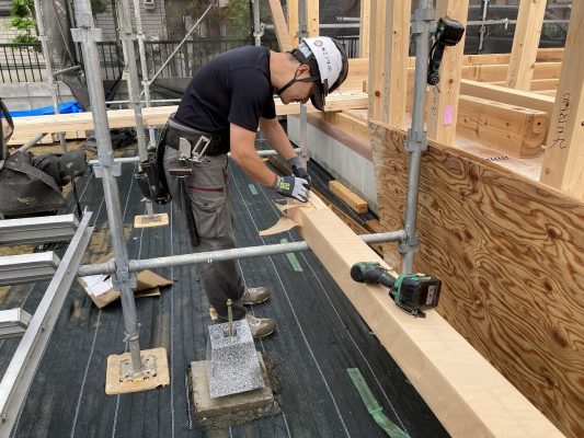 外周部の耐力面材を仮止めし、2階屋根の垂木が半分終えたところで、15時の休憩です。i様邸は、外壁にガルバリウム鋼板を張りますので、防火性能のある耐力面材を使用しています。