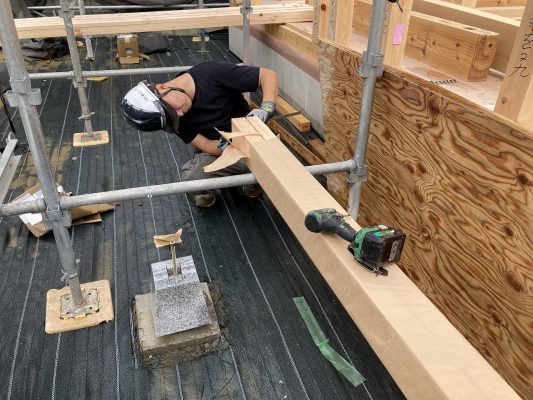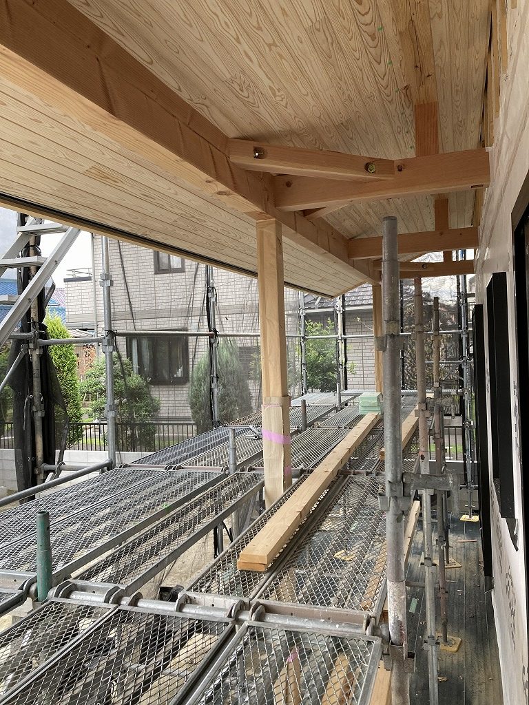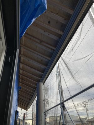 1階のウッドデッキ上は、張り終えています。軒先の金物は、通気金物です。ここから外部の空気が入り、垂木の間を通り抜け、妻換気から小屋裏の温まった空気を排出する自然通気をしています。建物の耐久性を考慮した時に、この自然換気はとても重要で、適切に換気が取れている事で、屋根に張られた合板の寿命も延びます👍