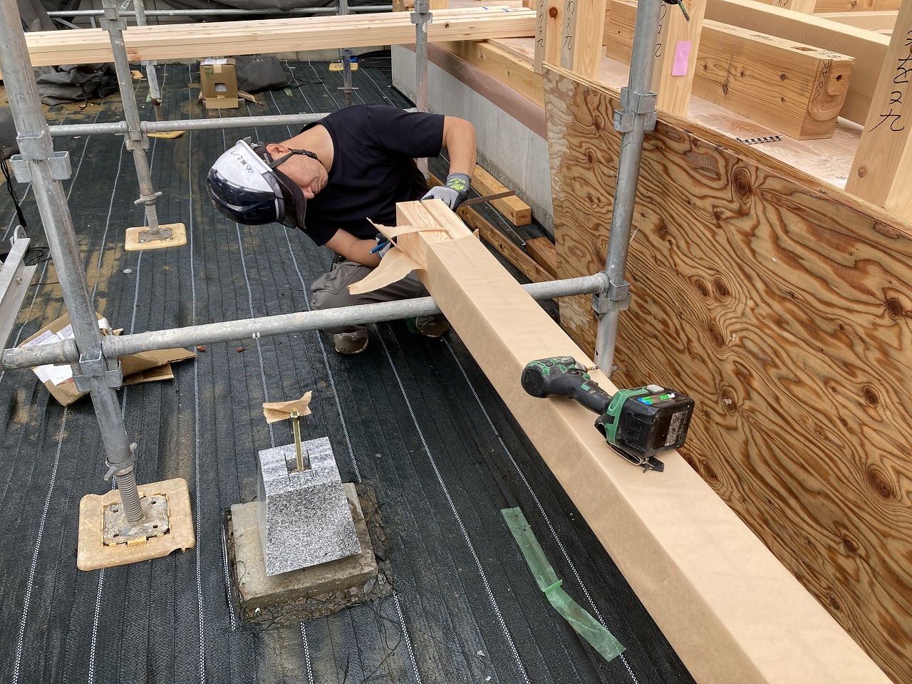 縁側の束石に設置する柱に、プレカットでボルト用のホゾが掘れていなかった様です💦急遽、i井さんがその場でささっと加工してくれました👍流石~。あれ?1ヶ月前にもこんな風景どこかで見たような気がしますよ。