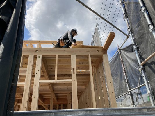 遂に来ました上棟日。朝方は昨日までの雨で路面も濡れており、まだ雲が残っていたので、雨が降らないか少し不安でしたが、10時頃から秋晴れとなり、これまでの夏の暑さとは違って、作業しやすい良いお天気でした。今日は、2階の屋根合板まで伏せ終わっています。