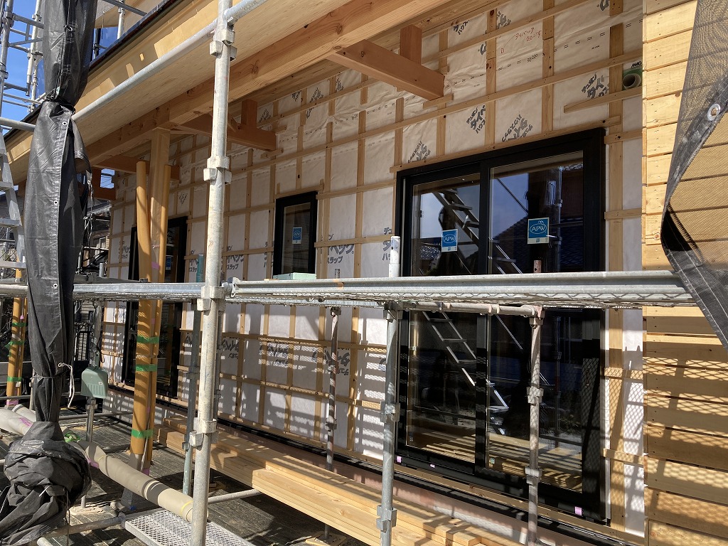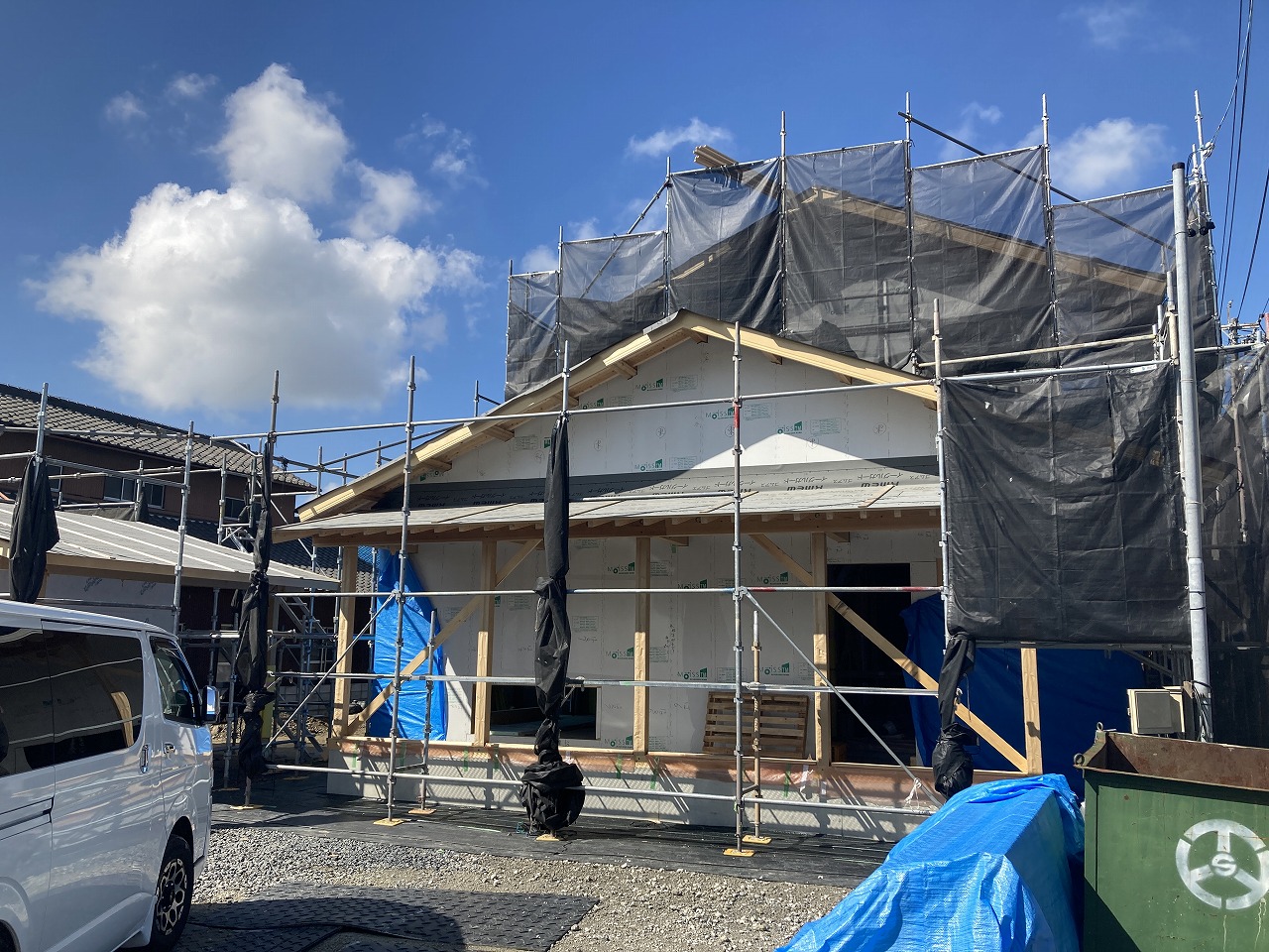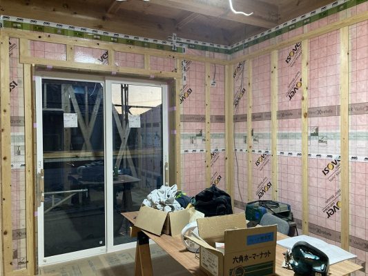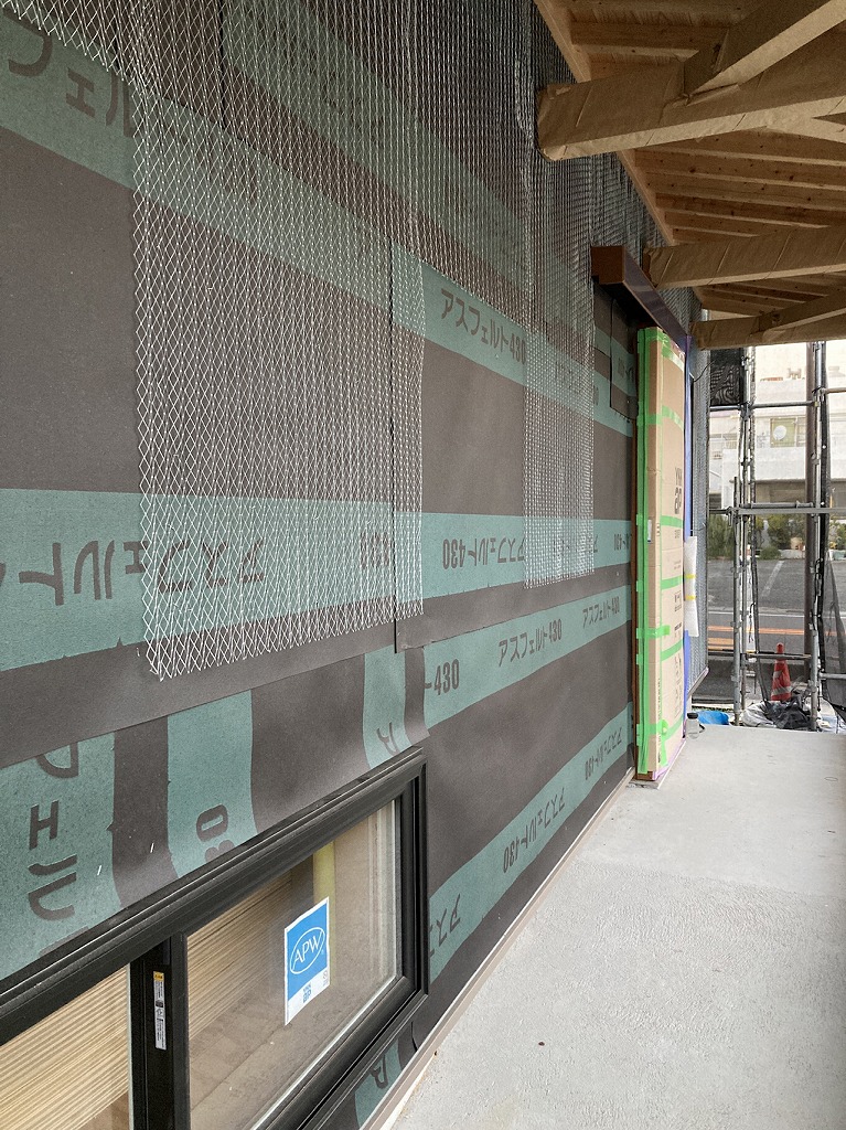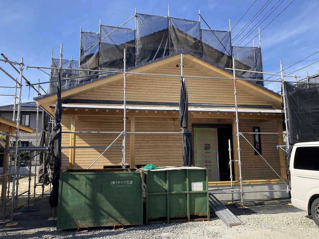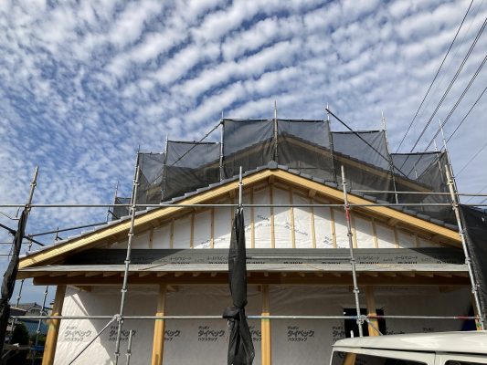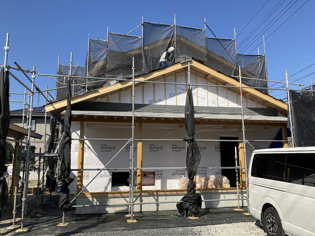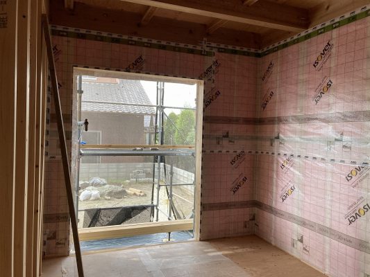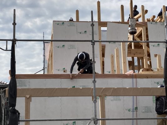 一週間の間に、s幸棟梁は付加断熱(外断熱)のグラスウール55㎜を入れ終わり、透湿防水シートを張り終えています👍一見、耐力面材と一緒の色なので、まだ付加断熱は入れていないと思いました💦早いです。