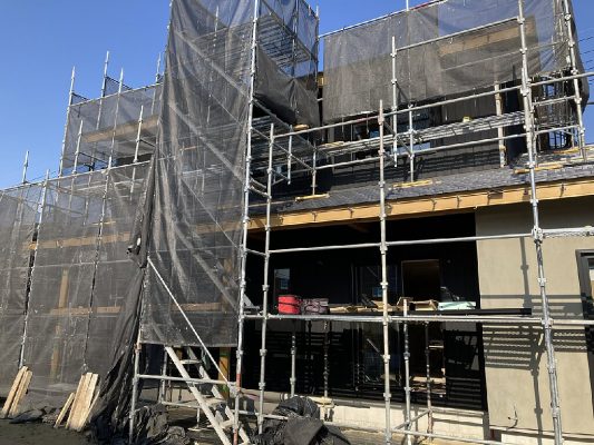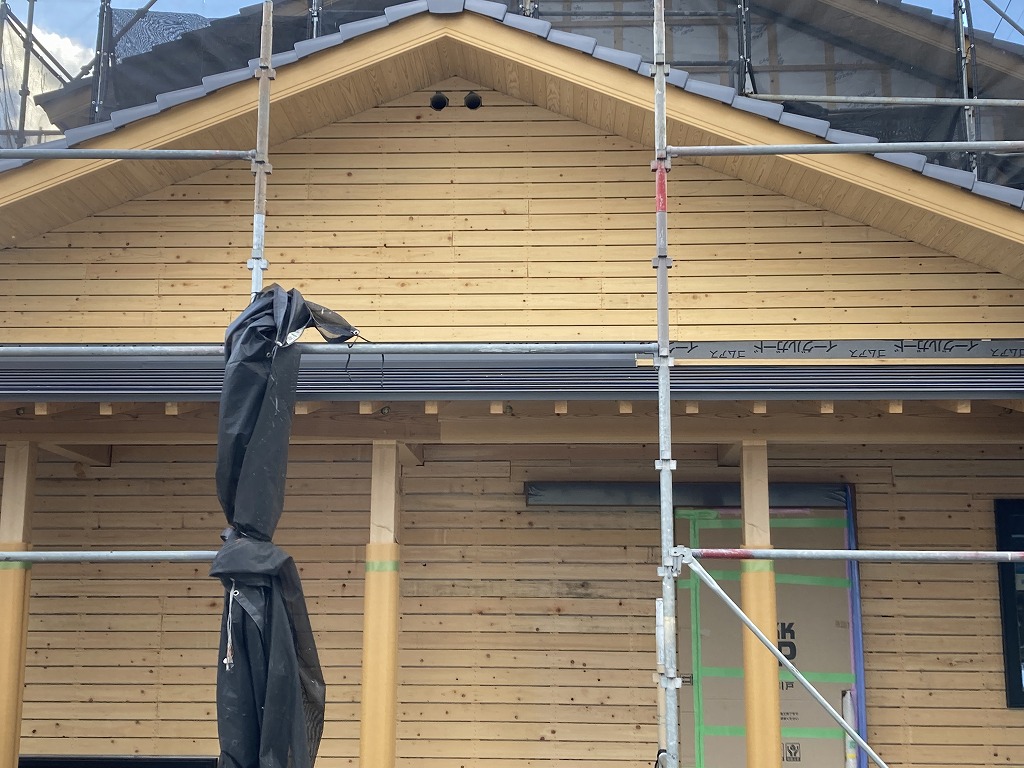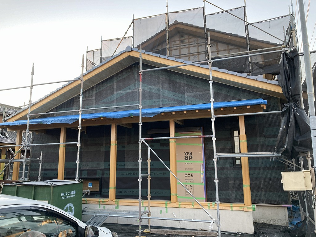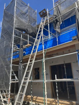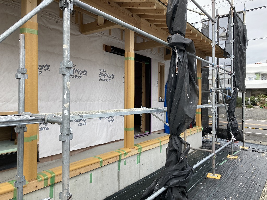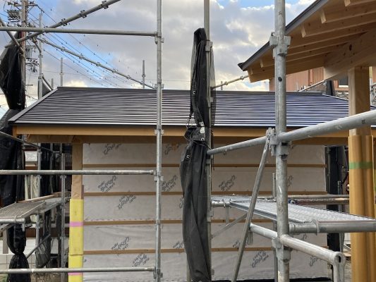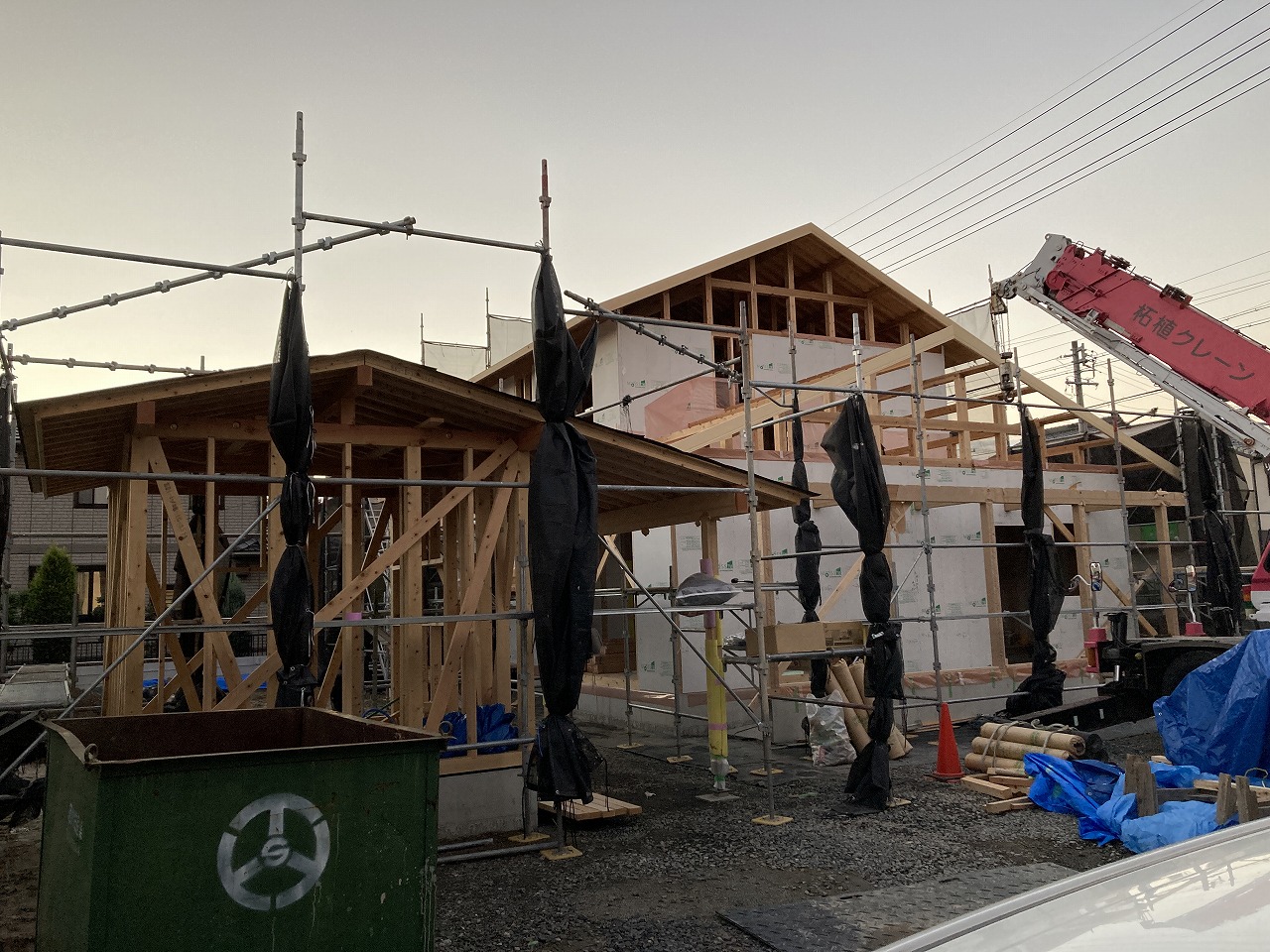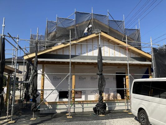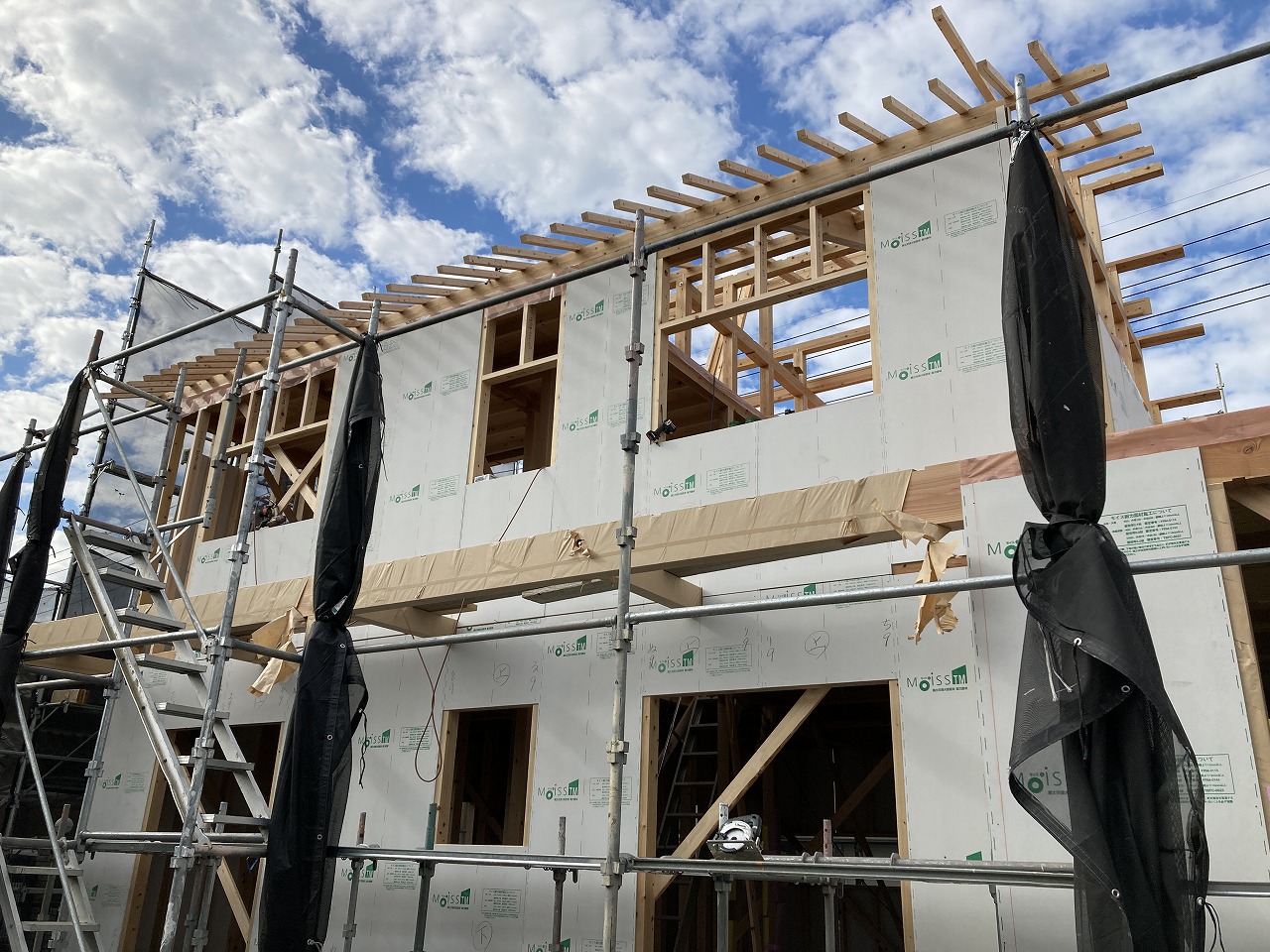 一週間の間に、s幸棟梁は付加断熱(外断熱)のグラスウール55㎜を入れ終わり、透湿防水シートを張り終えています👍一見、耐力面材と一緒の色なので、まだ付加断熱は入れていないと思いました💦早いです。