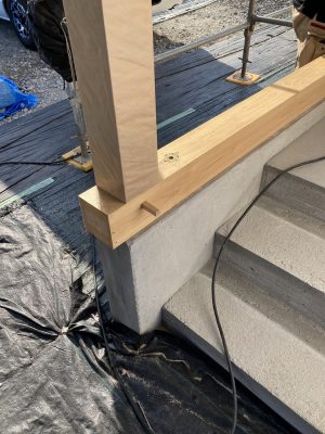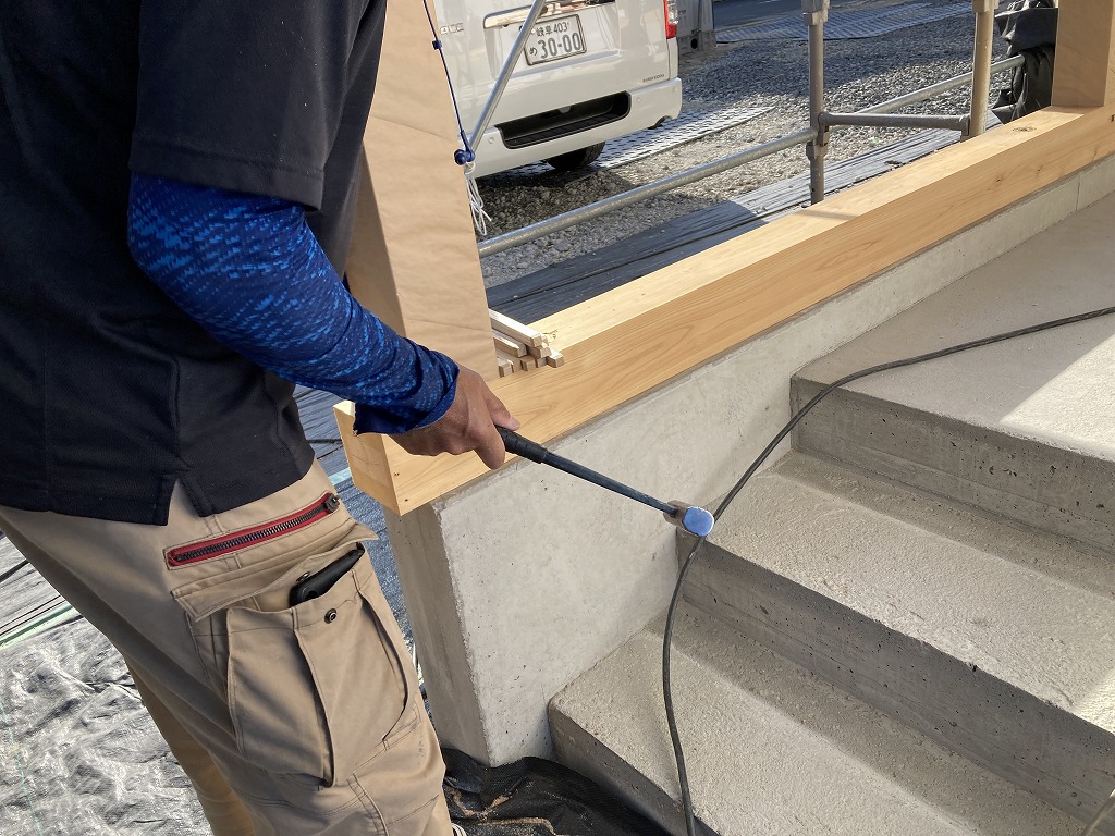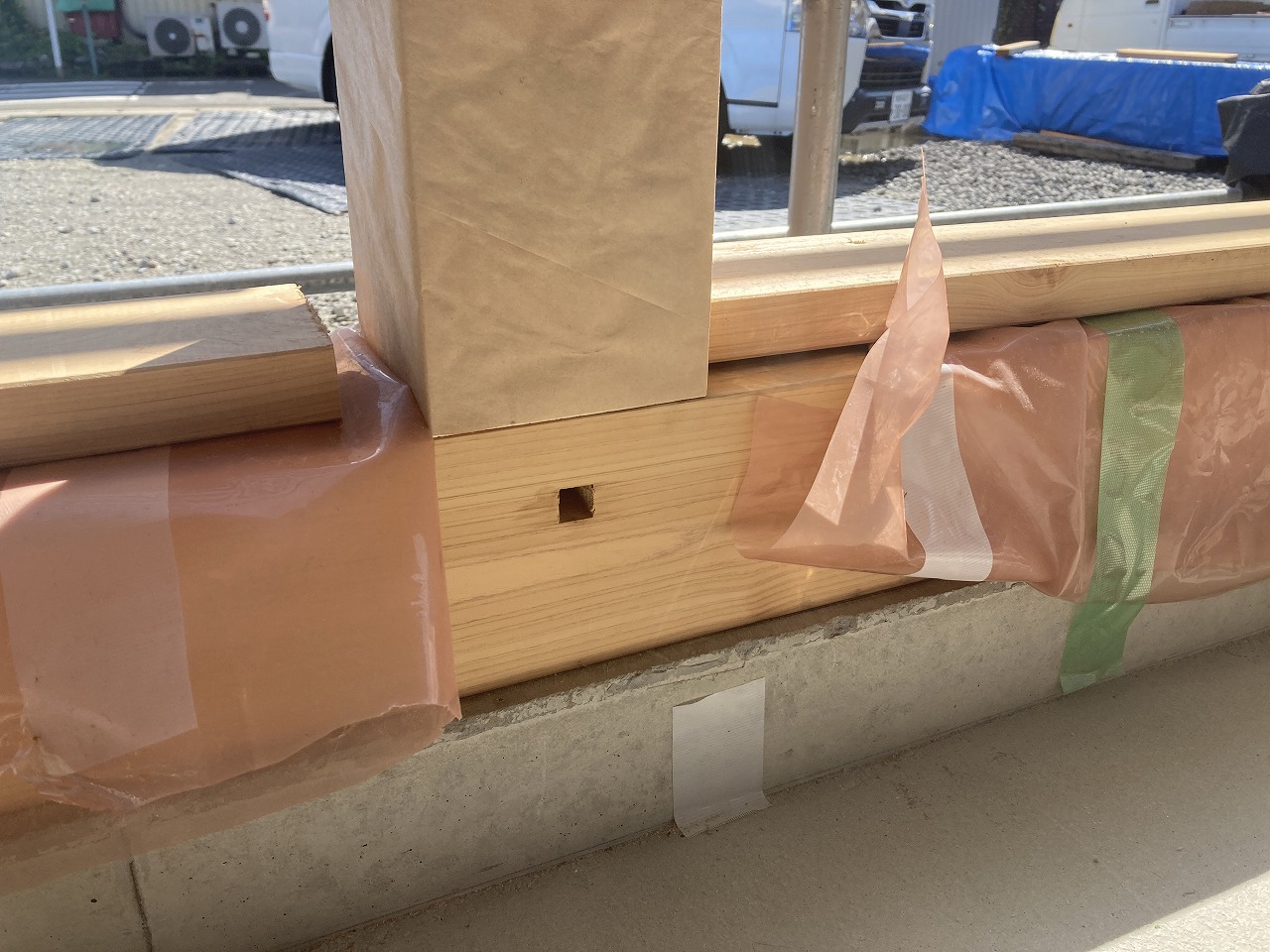下だけではありません。上部の柱と梁のホゾ穴にも込み栓をしていきます。木の栓は、叩くので硬めの木材(ナラ材)を使用しています。「長ほぞ込み栓打ち」は、柱と土台、柱と梁の接合方法として古くから使われていた工法です。ボルト締めがほとんどですが、この様に土台や柱、梁が化粧現しの場合、ボルトが見えていては、興ざめしてしまいますよね。「込み栓打ち」も建築基準法で仕口の緊結に有効な工法として認められています👍