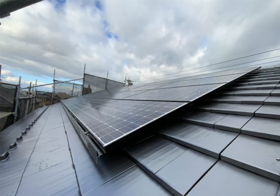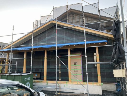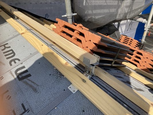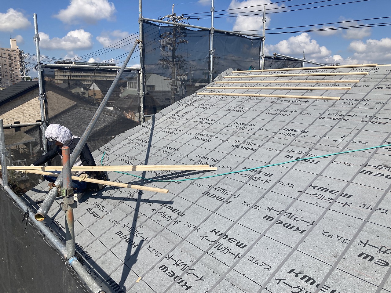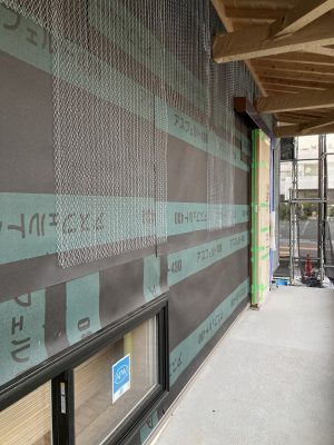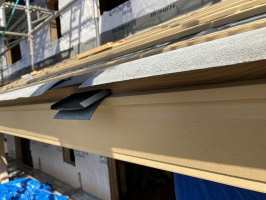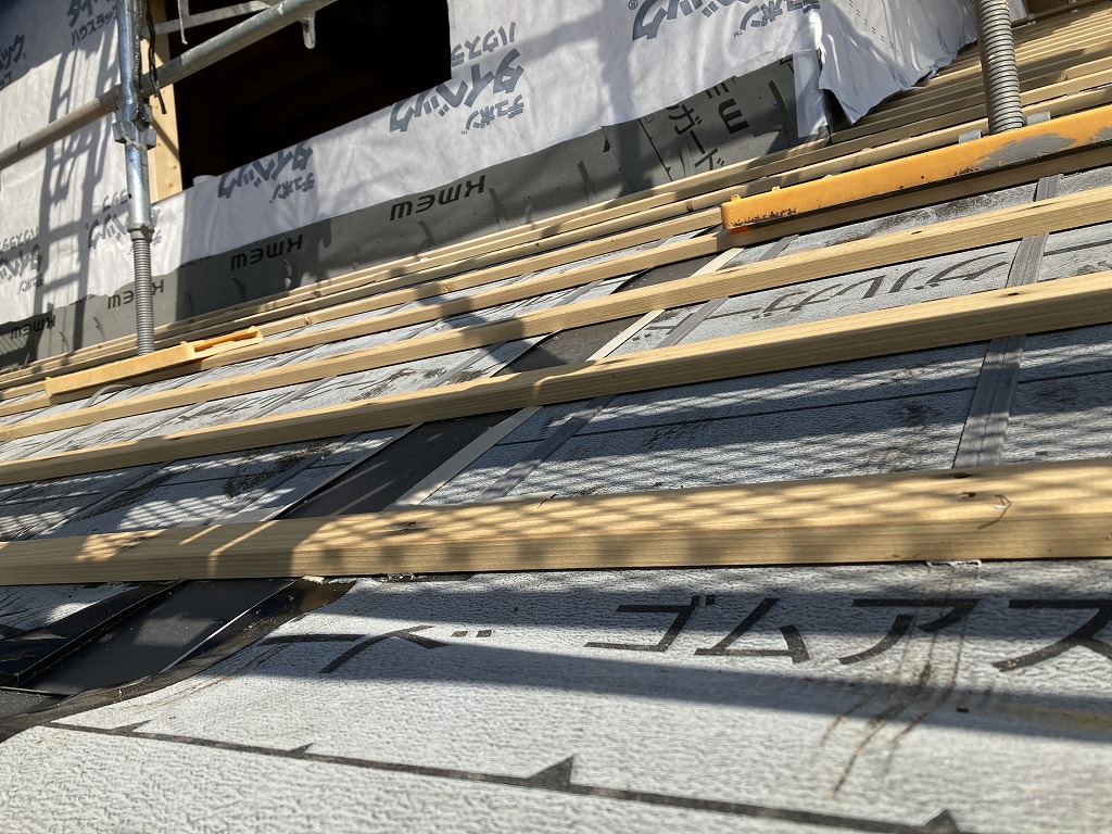 m濃屋さんも、桟木が打ち終わりました。下屋と2階妻壁との取り合い水切りも施されています。また、流水テープの部分に桟木を釘で留めており、万が一、瓦の下に雨が潜っても、流水テープの厚み分の空間を雨水が通り抜けれるようになっています。