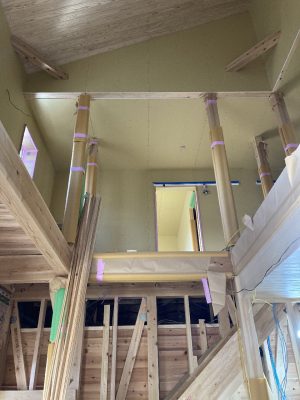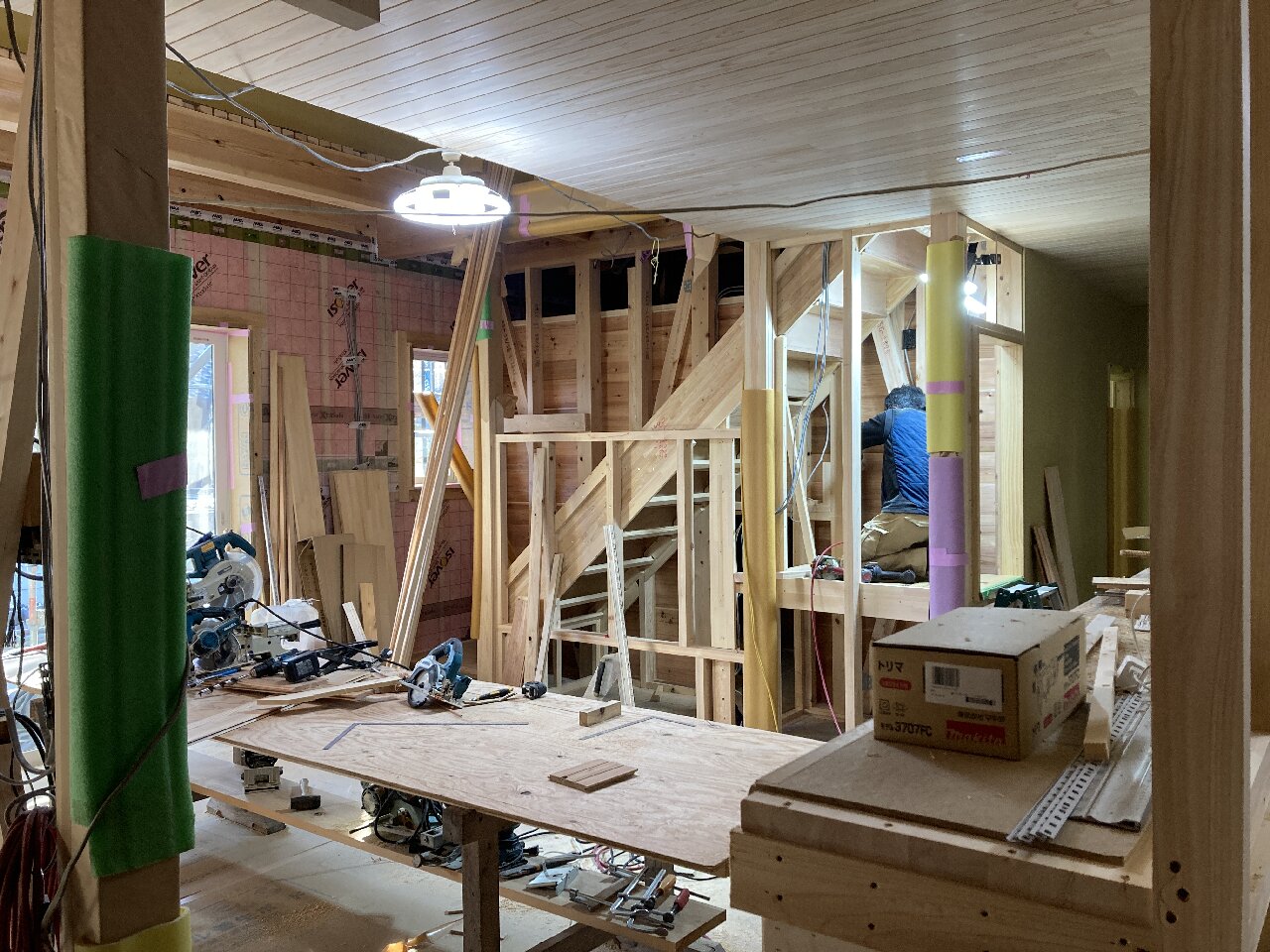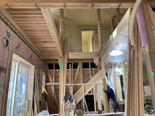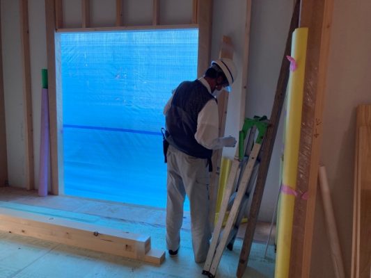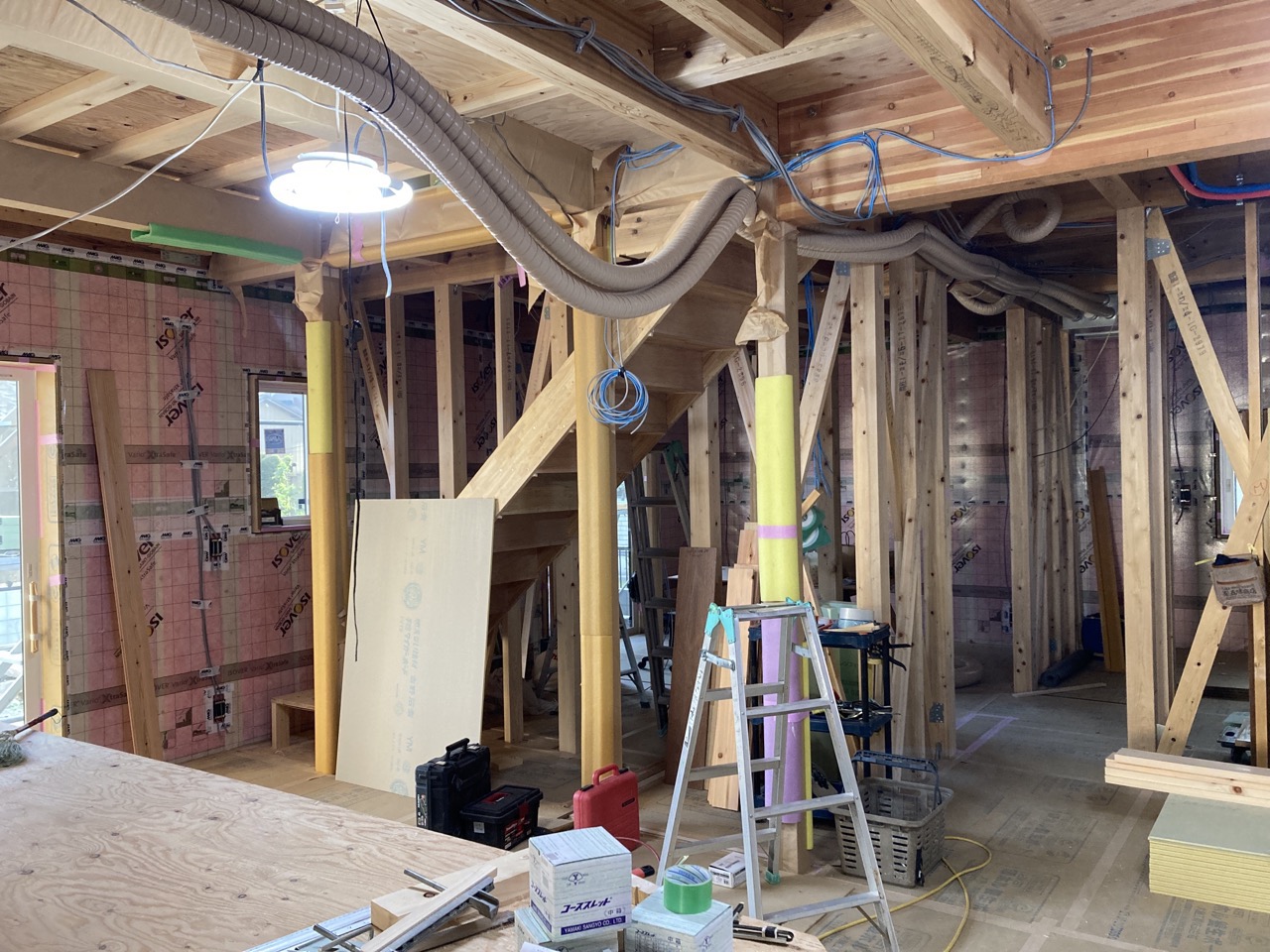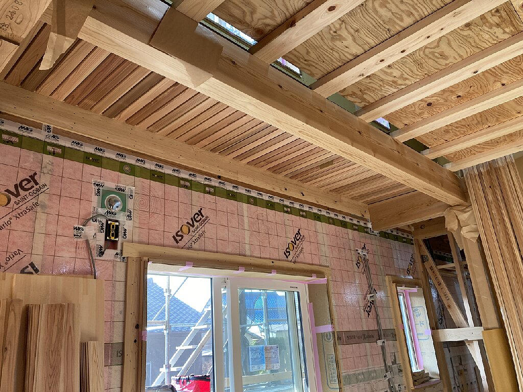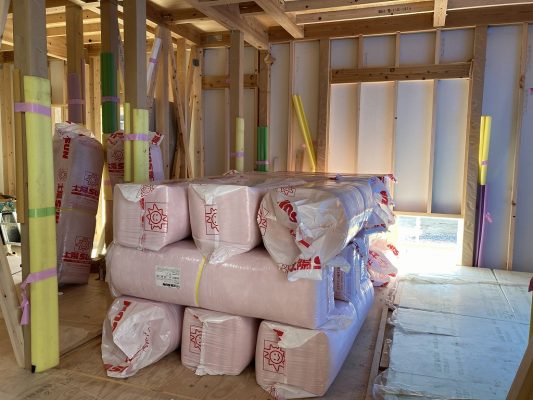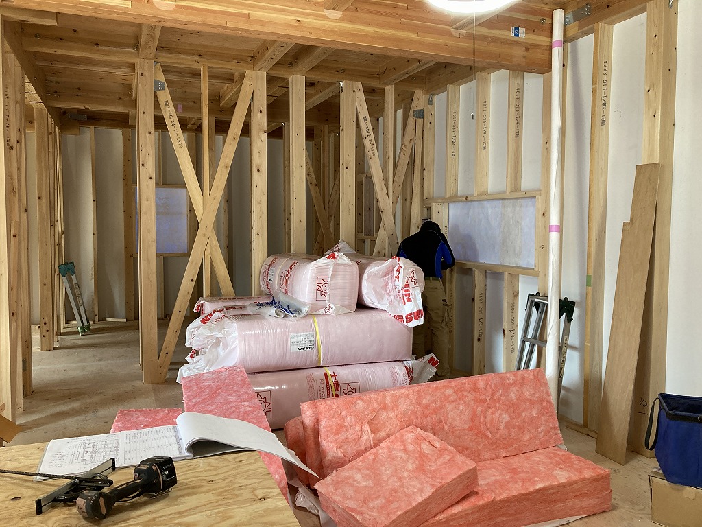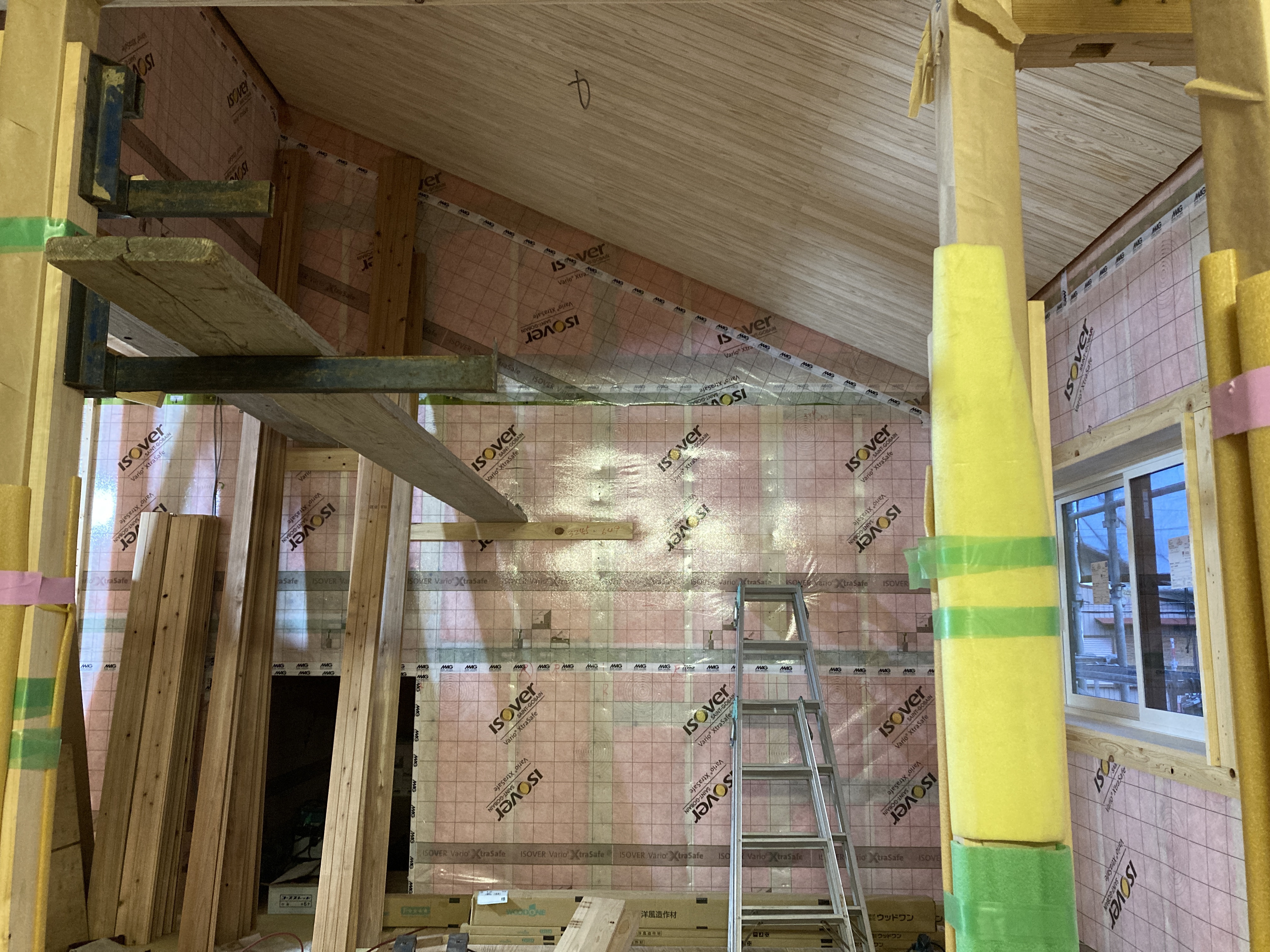 内部は、充填断熱の高性能グラスウールが運び込まれています。2階の吹抜け部分。s幸棟梁が養生のブルーシートを外すと、とても明るい。北側のキッチンダイニングまで光が届くかなぁ~