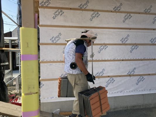瓦屋さんのm濃屋さんが、瓦を留める桟木を取付に来ています。こちらも宇宙服のような空調服。s幸棟梁曰く、長袖でフード付きが一番涼しいそうです。だから瓦屋さんはみんなこんなスタイルをされているんですね、なるほど。