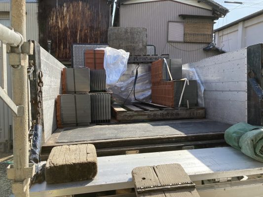 瓦を搬入しに来てくれました業者さん、昔の井戸汲みをしている方みたい。竹を利用されています。重たい瓦をバランスよく運ばれていました。