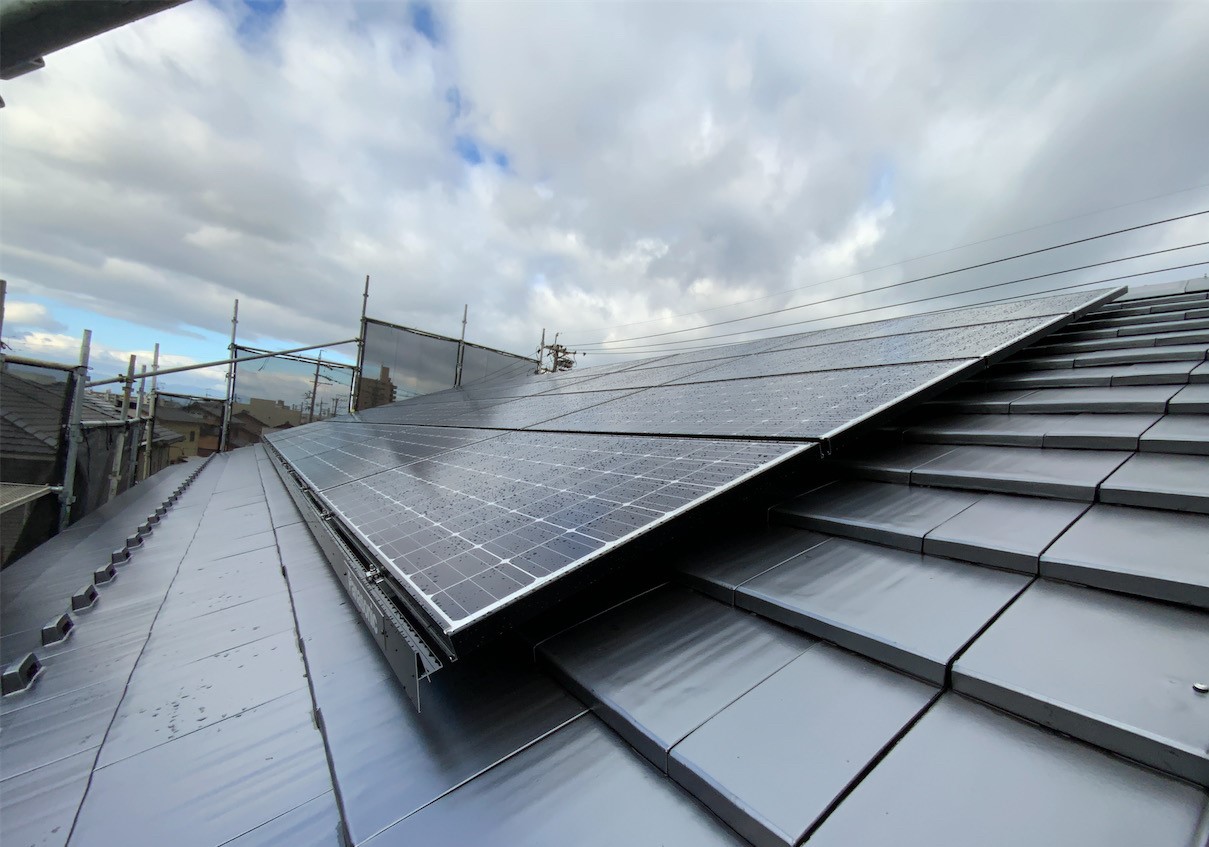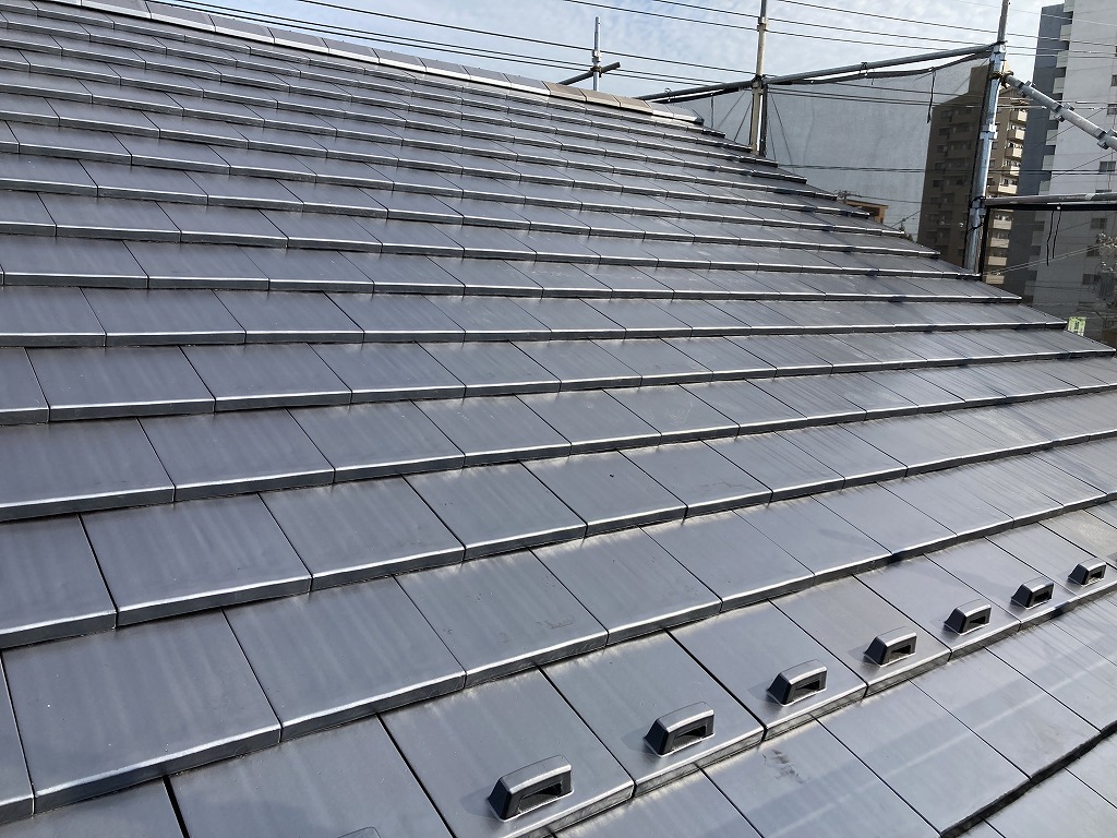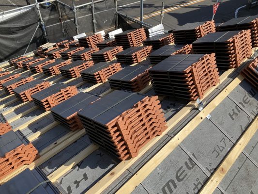 瓦が葺き終わっています💦早い!と言うと、「今は瓦の寸法に合わせて軒の出やケラバの出を決めて屋根を調整しているから、誰でも出来るわ~」って.s幸棟梁お得意のブラックジョーク。m濃屋さん、わかってみえると思いますが、本当に冗談ですからね💦