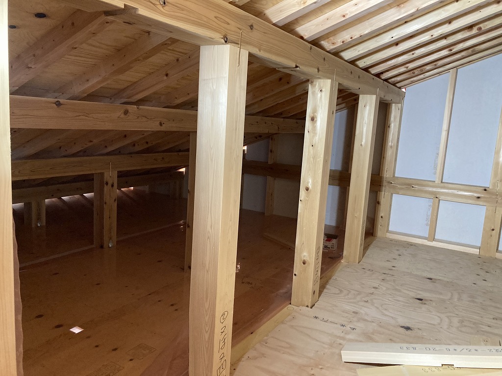 s幸棟梁は、1階小屋裏に計画した収納部分の施工に取りかかりました。ここは、2階の床レベルと同じなので、梯子や階段を掛けなくても良いので、使いやすい小屋裏収納となりそうです👍