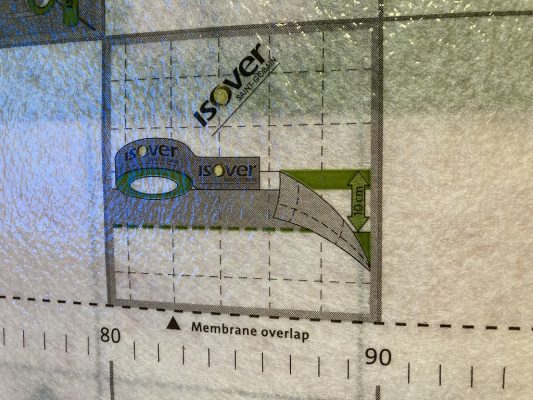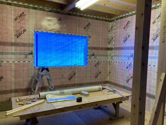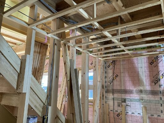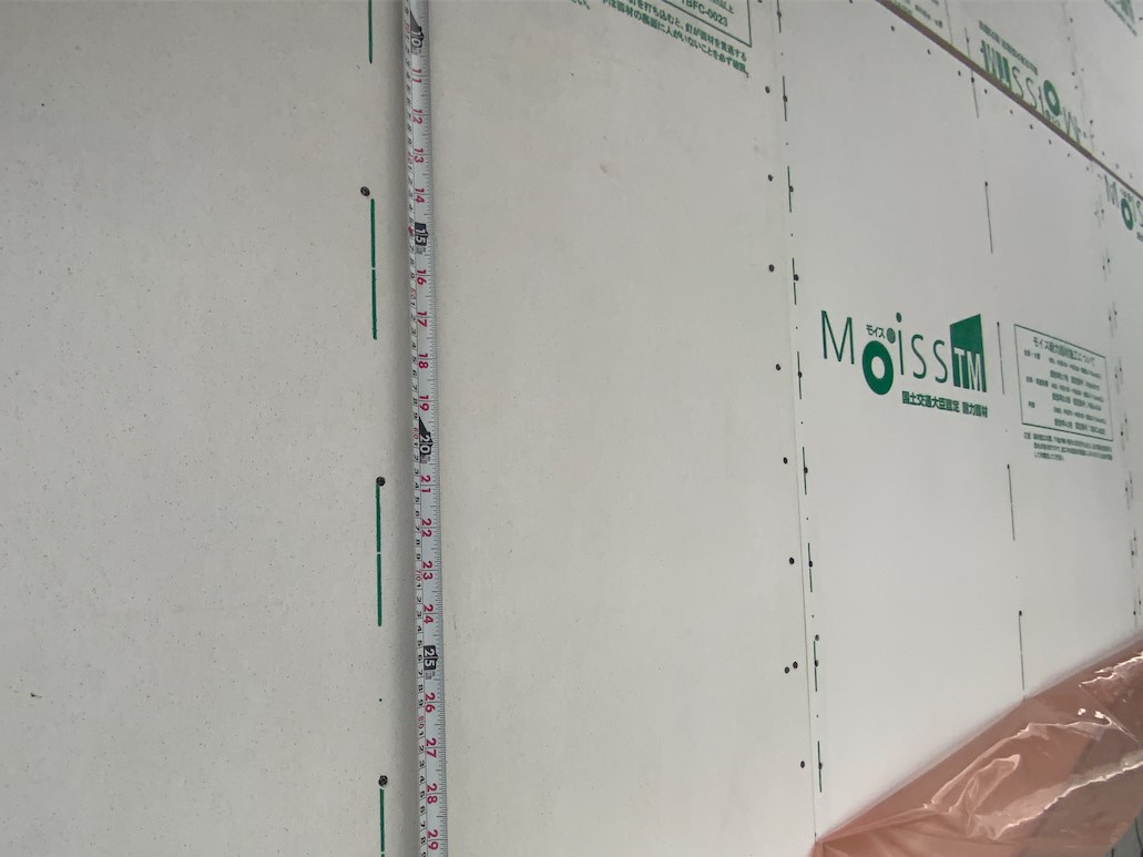 内部の方は、2階の充填断熱が施され調湿気密シートまで完了しています。防湿と透湿の性能を合わせ持つシートで、冬期には暖かい室内から壁に湿気が侵入する事を抑制する事で壁体内の結露を防止し、夏期には外部から侵入した壁体内に閉じ込められた湿気を室内に放出する事で結露の発生を防止するといった優れものです。壁の中を乾燥状態に保つ事は、構造の柱や梁を腐食の原因となる湿気から守る事なのでとても重要なのです。重ね代の基準や目盛が、耐力面材と同じくシートに描かれていて、解りやすいです。