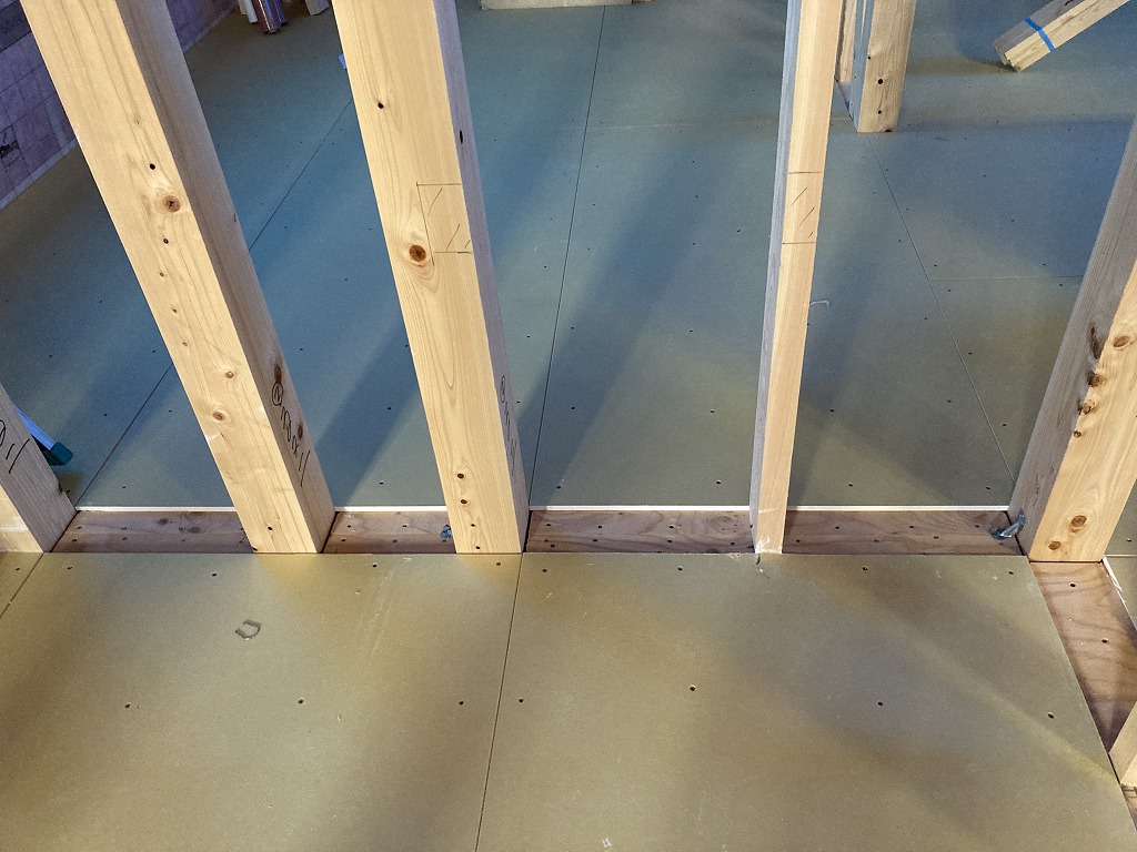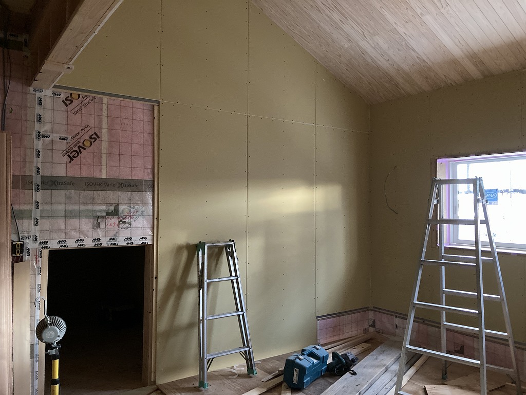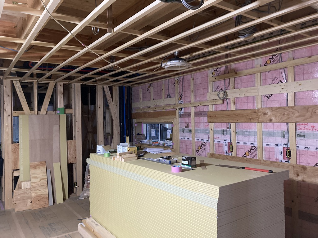 床にプラスターボードを張る事によって、下階への防音対策をしています。ただ、高気密高断熱の家なので、音が隙間の多い家よりも響きやすいので、それほど効果が無いように思われがちなのが寂しいところです💦また、延焼防止の効果もあります👍