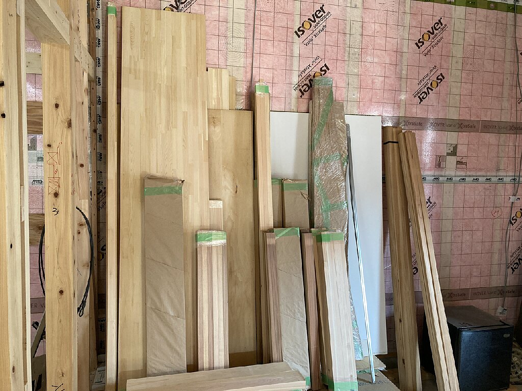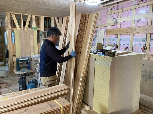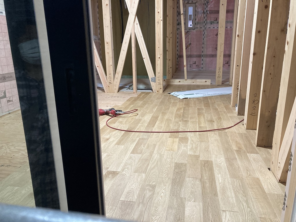 今日は、外構工事と忘れていた小屋の棚の打合せをしました。i様とs幸棟梁が床を張る様子をこっそりのぞき見。1階は、ご主人が気に入っているナラ材を張っています。木目もしっかり出ている材料で、人気が高いです👍私も好きですナラ材。棟梁が遅くまでがんばってくれていて、どんどん出来上がってきているので楽しみ~とご夫婦そろっておっしゃっていました。