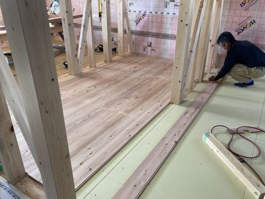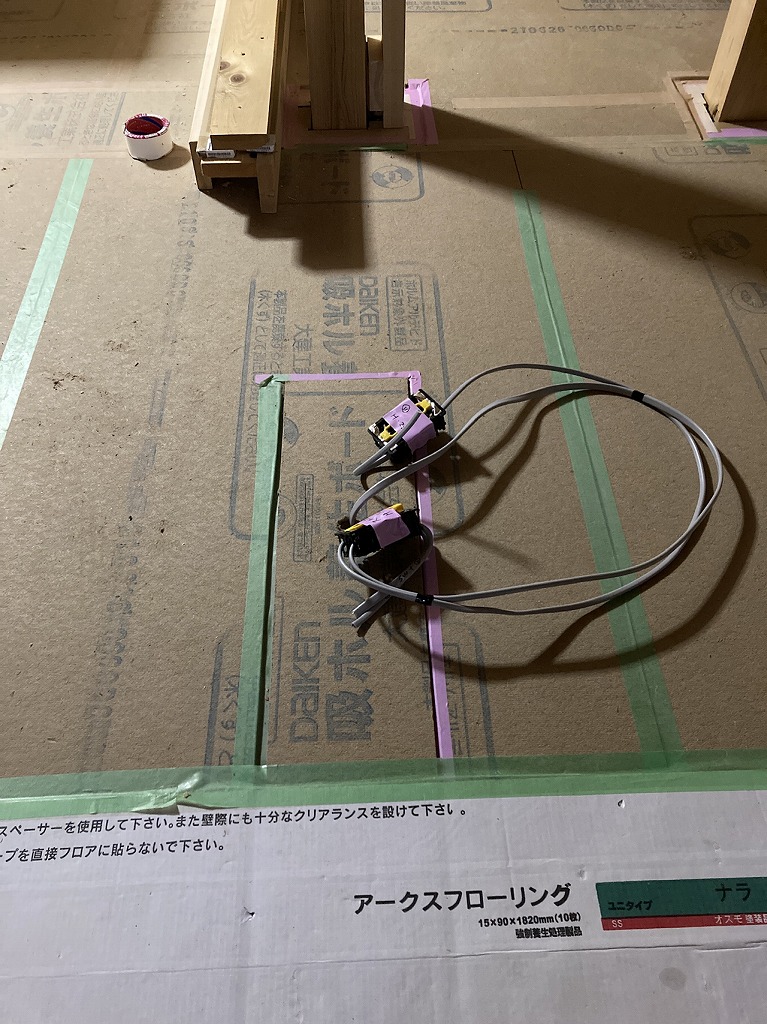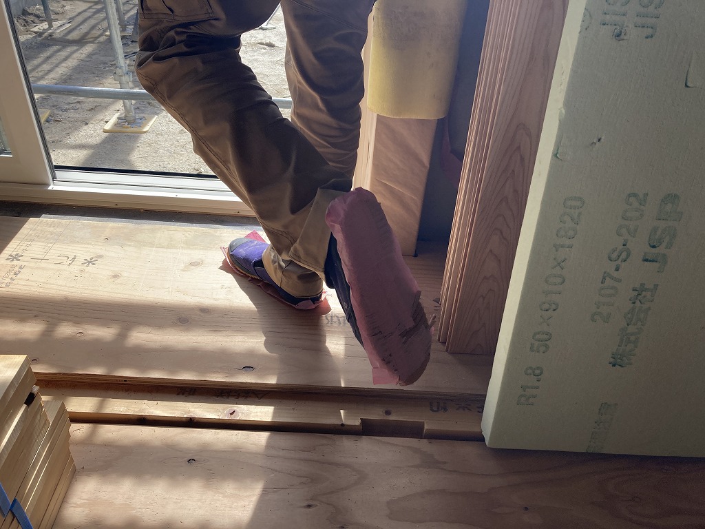 s幸棟梁は、2階の床材を張っています。セカンドリビングは既に養生済みで、寝室からウォークイン、お子さんの部屋へ突入しました。早いです💦2階の床材は、やわらかい無塗装の杉板なので、棟梁は靴の跡が付かない様に、上履きのソール部分に養生テープを貼っています。細かい気遣いですね👍
